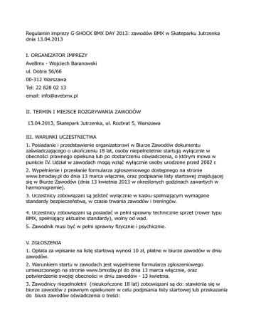 Regulamin imprezy G-SHOCK BMX DAY 2013: zawodów BMX w Skateparku Jutrzenka dnia 13.04.2013 I. ORGANIZATOR IMPREZY AveBmx - Wojciech Baranowski ul. Dobra 56/66 00-312 Warszawa Tel: 22 828 02 13 email: [email protected] II. TERMIN I MIEJSCE ROZGRYWANIA ZAWODÓW 13.04.2013, Skatepark Jutrzenka, ul. Rozbrat 5, Warszawa III. WARUNKI UCZESTNICTWA 1. Posiadanie i przedstawienie organizatorowi w Biurze Zawodów dokumentu zaświadczającego o ukończeniu 18 lat, osoby niepełnoletnie startują wyłącznie w obecności prawnego opiekuna lub po dostarczeniu oświadczenia, o którym mowa w punkcie IV. Udział w zawodach mogą wziąć wyłącznie osoby urodzone przed 2002 r. 2. Wypełnienie i przesłanie formularza zgłoszeniowego dostępnego na stronie www.bmxday.pl do dnia 13 marca włącznie, oraz podpisanie listy startowej znajdującej się w Biurze Zawodów (dnia 13 kwietnia 2013 w określonych godzinach zawartych w harmonogramie). 3. Uczestnicy zobowiązani są jeździć wyłącznie w kasku spełniającym wymagane standardy bezpieczeństwa, w czasie trwania zawodów i treningów. 4. Uczestnicy zobowiązani są posiadać w pełni sprawny technicznie sprzęt (rower typu BMX, spełniający aktualne standardy), wolny od wad. 5. Zawodnik musi być w pełni sprawny fizycznie i psychicznie. V. ZGŁOSZENIA 1. Opłata za wpisanie na listę startową wynosi 10 zł, płatne w biurze zawodów w dniu zawodów. 2. Warunkiem startu w zawodach jest wypełnienie formularza zgłoszeniowego umieszczonego na stronie www.bmxday.pl do dnia 13 marca włącznie, oraz potwierdzenie swojej obecności w dniu zawodów - 13 kwietnia. 3. Zawodnicy niepełnoletni (nieukończone 18 lat) zobowiązani są do: stawienia się w biurze zawodów z prawnym opiekunem w celu podpisania listy startowej lub przekazania do biura zawodów oświadczenia o treści: Oświadczenie Rodzica lub Opiekuna prawnego o zdolności dziecka do udziału w G-SHOCK BMX DAY 2013 zawody BMX Imię i nazwisko osoby niepełnoletniej biorącej udział w zawodach: ............................................................................................... Imię i nazwisko Rodzica lub Opiekuna prawnego oraz seria i nr dowodu osobistego: ................................................................................................................................. .................................... Ja wyżej wymieniony, jako Rodzic/Opiekun prawny, wyrażam zgodę na udział mojego syna/córki ......................................................... w zawodach G-SHOCK BMX DAY 2013 (termin: 13.04.2013,) organizowanym przez AVE BMX. Jednocześnie oświadczam, że osoba niepełnoletnia, za którą biorę pełną odpowiedzialność, urodziła się po 2002 r. oraz że stan zdrowia pozwala jej na udział w tego typu imprezie rekreacyjno- sportowej. Oświadczam, że mam świadomość ryzyka związanego z uprawianiem dyscypliny Freestyle Bmx, jednocześnie zwalniam organizatora z wszelkiej odpowiedzialności wobec podopiecznego i mnie. Oświadczam, że syn/córka jest objęty ubezpieczeniem NNW. Oświadczam, że zapoznałem się z treścią Regulaminu "G-SHOCK BMX DAY 2013" oraz jestem świadomy jego postanowień i w pełni je akceptuję. dnia........................................ ................................................... Podpis Rodzica lub Opiekuna prawnego* * nie potrzebne skreślić V. ZASADY ROZGRYWANIA ZAWODÓW 1. We wszystkich spornych sprawach nieuregulowanych regulaminem będzie decydował organizator zawodów. 2. Niestawienie się na rozpoczęcie eliminacji i finałów w wyznaczonym czasie będzie się równało z dyskwalifikacją. 4. Zawodnicy nie mogą przeprowadzać treningów w skateparku podczas rozgrywania zawodów. 5. Zawodnicy zobowiązani są zachowywać się kulturalnie i zgodnie z duchem sportu. 6. Nie wolno używać szklanych pojemników w pobliżu i na trasie zawodów. 7. Jury będą stanowić 5 osoby powołane przez organizatora oceniające każdy przejazd. 8. Każdy zawodnik ma jeden punktowany przejazd eliminacyjny. 9. Ośmiu najlepszych zawodników z danej kategorii przechodzi do finału. 10. W finale zawodnicy mają po 2 przejazdy. 11. Na podstawie punktacji uzyskanej wyliczane będą ostateczne wyniki konkursu. VI. NAGRODY 1. Przewidziane są nagrody rzeczowe oraz pieniężne. 2. Nagrody zostaną rozdane na podstawie wyników sędziowskich. 3. Nagrody zostaną wręczone w trakcie dekoracji po zakończeniu zawodów. 4. W razie braku możliwości osobistego odbioru nagród, uczestnik zobowiązany jest do stawienia się w ciągu 7 dni roboczych (liczonych od dnia wydarzenia) do siedziby organizatora, firmy AveBmx. 5 Brak odbioru nagrody w wyznaczonym terminie jest równoznaczny ze zrzeczeniem się nagród na korzyść firmy AveBmx. VII. KARY 1. Niesportowe zachowanie w stosunku do innych zawodników może spowodować dyskwalifikację. 2. Za jazdę w skateparku w trakcie trwania zawodów poza kolejnością zawodnik może zostać zdyskwalifikowany. VIII. POSTANOWIENIA KOŃCOWE 1. Organizator nie ponosi odpowiedzialności za wypadki losowe zaistniałe podczas zawodów. 2. Każdy uczestnik startuje na własną odpowiedzialność (w przypadku zawodników niepełnoletnich na odpowiedzialność rodziców lub prawnych opiekunów). 3. Organizator nie ponosi odpowiedzialności materialnej za rzeczy zaginione, skradzione i zniszczone w trakcie trwania zawodów. 4. Organizator nie ponosi odpowiedzialności za ewentualne kolizje i wypadki w skateparku na skutek wadliwego sprzętu (roweru, ubioru itp.) 5. Organizator zastrzega sobie możliwość wykluczenia Zawodnika przy stwierdzeniu zatajenia jego problemów zdrowotnych jak i widocznych elementów np. przechodzącej rekonwalescencji typu gips. 6. Brak znajomości regulaminu nie będzie uznawany jako wytłumaczenie. 7. Zawodnik obowiązany jest do odpowiedniego ubezpieczenia się od następstw nieszczęśliwych wypadków jak i od odpowiedzialności cywilnej. 8. Po podpisaniu listy startowej 