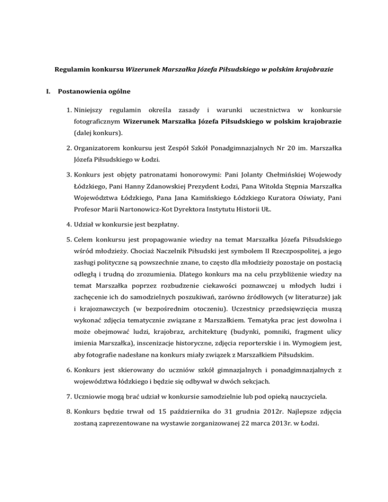 Regulamin konkursu Wizerunek Marszałka Józefa Piłsudskiego w polskim krajobrazie I. Postanowienia ogólne 1. Niniejszy regulamin określa zasady i warunki uczestnictwa w konkursie fotograficznym Wizerunek Marszałka Józefa Piłsudskiego w polskim krajobrazie (dalej konkurs). 2. Organizatorem konkursu jest Zespół Szkół Ponadgimnazjalnych Nr 20 im. Marszałka Józefa Piłsudskiego w Łodzi. 3. Konkurs jest objęty patronatami honorowymi: Pani Jolanty Chełmińskiej Wojewody Łódzkiego, Pani Hanny Zdanowskiej Prezydent Łodzi, Pana Witolda Stępnia Marszałka Województwa Łódzkiego, Pana Jana Kamińskiego Łódzkiego Kuratora Oświaty, Pani Profesor Marii Nartonowicz-Kot Dyrektora Instytutu Historii UŁ. 4. Udział w konkursie jest bezpłatny. 5. Celem konkursu jest propagowanie wiedzy na temat Marszałka Józefa Piłsudskiego wśród młodzieży. Chociaż Naczelnik Piłsudski jest symbolem II Rzeczpospolitej, a jego zasługi polityczne są powszechnie znane, to często dla młodzieży pozostaje on postacią odległą i trudną do zrozumienia. Dlatego konkurs ma na celu przybliżenie wiedzy na temat Marszałka poprzez rozbudzenie ciekawości poznawczej u młodych ludzi i zachęcenie ich do samodzielnych poszukiwań, zarówno źródłowych (w literaturze) jak i krajoznawczych (w bezpośrednim otoczeniu). Uczestnicy przedsięwzięcia muszą wykonać zdjęcia tematycznie związane z Marszałkiem. Tematyka prac jest dowolna i może obejmować ludzi, krajobraz, architekturę (budynki, pomniki, fragment ulicy imienia Marszałka), inscenizacje historyczne, zdjęcia reporterskie i in. Wymogiem jest, aby fotografie nadesłane na konkurs miały związek z Marszałkiem Piłsudskim. 6. Konkurs jest skierowany do uczniów szkół gimnazjalnych i ponadgimnazjalnych z województwa łódzkiego i będzie się odbywał w dwóch sekcjach. 7. Uczniowie mogą brać udział w konkursie samodzielnie lub pod opieką nauczyciela. 8. Konkurs będzie trwał od 15 października do 31 grudnia 2012r. Najlepsze zdjęcia zostaną zaprezentowane na wystawie zorganizowanej 22 marca 2013r. w Łodzi. II. Warunki udziału w konkursie 1. Konkurs ma charakter zamknięty. Uczestnikiem konkursu może być tylko uczeń ze szkoły, do której wysłano zaproszenie. 2. Każdy Uczestnik musi wykonać od jednego do trzech zdjęć. 3. Zdjęcia powinny zostać wykonane samodzielnie, muszą być pracami autorskimi. 4. Zdjęcia zgłaszane na konkurs będą przyjmowane wyłącznie w formie zaspisu cyfrowego na płytach CD lub DVD. Organizator nie bierze odpowiedzialności za ewentualne uszkodzenia lub zniszczenia płyt. Jeśli jakość nadesłanego zdjęcia uniemożliwi jego ocenę, to zgłoszenie zostanie automatycznie odrzucone i nie weźmie udziału w konkursie. 5. Każda nadesłana płyta powinna zostać podpisana imieniem i nazwiskiem Uczestnika oraz adresem jego szkoły. Jeśli ucznia wspierał nauczyciel, to należy również podać jego imię i nazwisko. 6. Do koperty należy włożyć podpisaną płytę oraz oświadczenia, o których mowa w pkt 8 niniejszego regulaminu. 7. Uczestnik konkursu musi do każdego zdjęcia dodać krótki komentarz (nazwa fotografowanego obiektu oraz uzasadnienie wykonania danego zdjęcia (maksymalnie 600 znaków), w którym wyjaśni swój wybór. 8. Każdy uczestnik do nadesłanego zgłoszenia musi dołączyć następujące dokumenty opatrzone własnoręcznym podpisem (wzory dokumentów na stronie szkoły): a) oświadczenie, że przysługują mu wszelkie prawa autorskie do nadesłanych zdjęć, b) oświadczenie o chęci uczestnictwa w wystawie finałowej Wizerunek Marszałka Józefa Piłsudskiego w polskim krajobrazie, c) oświadczenie dotyczące wyrażenia zgody na publikację przez Organizatora (w przypadku przyznania nagrody lub wyróżnienia) imienia i nazwiska Uczestnika na stronie internetowej szkoły oraz w innych mediach, przedstawiających informacje o konkursie. Dane osobowe Uczestników będą wykorzystane wyłącznie na potrzeby Konkursu, d) oświadczenie, w którym Uczestnik stwierdza, że osoby znajdujące się na zdjęciach zgadzają się na publikację swojego wizerunku, 2 e) oświadczenie, w którym Uczestnik stwierdza, że zapoznał się z niniejszym regulaminem i akceptuje wszystkie jego postanowienia, f) w przypadku osób niepełnoletnich należy dołączyć pisemną zgodę rodziców/opiekunów na udział w konkursie. 9. Wszelkie pytania i wątpliwości związane z przedsięwzięciem należy kierować do koordynatora ds. konkursu p. Aleksandry Buzar drogą telefoniczną lub emailową (tel. 503111705, [email protected], w tytule emaila należy dopisać konkurs fotograficzny). III. Warunki techniczne dotyczące nadsyłanych zdjęć 1. Nadsyłane pliki cyfrowe mogą pochodzić z aparatów cyfrowych lub być wynikiem skanowania fotografii wykonanej w dowolnej technice. 2. Pliki pochodzące a aparatów cyfrowych muszą spełniać następujące kryteria: a) rozdzielczość min. 2500x1900 pikseli (ok 5Mpikseli), b) akceptowalne formy plików to JPG/TIFF, c) nazwa pliku powinna zawierać imię i nazwisko autora, numer zdjęcia i tytuł ( przykładowo jan_kowalski_01_aleja.jpg) 3. Pliki będące wynikiem skanowania muszą spełniać następujące warunki: a) rozdzielczość krótszego boku min. 2000 pikseli, b) akceptowalne formy plików to JPG/TIFF, c) nazwa pliku powinna zawierać imię i nazwisko autora, numer zdjęcia oraz tytuł (przykładowo jan_kowalski_01_aleja.jpg) 4. Organizator ma prawo wyłączenia z konkursu zdjęć o niskiej jakości technicznej. 5. Konieczny jest komentarz do zdjęcia z nazwą fotografowanego obiektu oraz uzasadnieniem jego wykonania. IV. Ocena prac konkursowych i nagrody 1. Termin nadsyłania zgłoszeń mija 31 grudnia 2012r. Zdjęcia nadesłane po terminie nie będą brane pod uwagę. 2. Oceny zdjęć dokona Jury powołane przez Organizatora. Decyzje Jury są ostateczne. 3 3. Jury wyłoni po 3 najlepsze zdjęcia w każdej z sekcji – gimnazjalnej i 