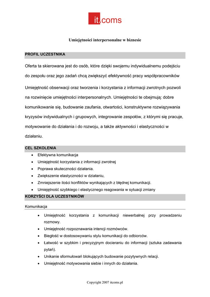 Umiejętności interpersonalne w biznesie PROFIL UCZESTNIKA Oferta ta skierowana jest do osób, które dzięki swojemu indywidualnemu podejściu do zespołu oraz jego zadań chcą zwiększyć efektywność pracy współpracowników Umiejętność obserwacji oraz tworzenia i korzystania z informacji zwrotnych pozwoli na rozwinięcie umiejętności interpersonalnych. Umiejętności te obejmują: dobre komunikowanie się, budowanie zaufania, otwartości, konstruktywne rozwiązywania kryzysów indywidualnych i grupowych, integrowanie zespołów, z którymi się pracuje, motywowanie do działania i do rozwoju, a także aktywności i elastyczności w działaniu. CEL SZKOLENIA • Efektywna komunikacja • Umiejętność korzystania z informacji zwrotnej • Poprawa skuteczności działania. • Zwiększenie elastyczności w działaniu, • Zmniejszenie ilości konfliktów wynikających z błędnej komunikacji. • Umiejętność szybkiego i elastycznego reagowania w sytuacji zmiany KORZYŚCI DLA UCZESTNIKÓW Komunikacja • Umiejętność korzystania z komunikacji niewerbalnej przy prowadzeniu rozmowy. • Umiejętność rozpoznawania intencji rozmówców. • Biegłość w dostosowywaniu stylu komunikacji do odbiorców. • Łatwość w szybkim i precyzyjnym docieraniu do informacji (sztuka zadawania pytań). • Unikanie sformułowań blokujących budowanie pozytywnych relacji. • Umiejętność motywowania siebie i innych do działania. Copyright 2007 itcoms.pl • Umiejętność tworzenia i korzystania z informacji zwrotnej. Zarządzanie emocjami • Wywoływanie pozytywnych stanów emocjonalnych tj. motywacji, energii do działania, spokoju, pewności siebie i innych. • Umiejętność panowania nad stanami emocjonalnymi takimi jak: złość, bezsilność, irytacja i inne. • Zwiększenie elastyczności w działaniu oraz w sytuacjach „bez wyjścia”. • Zadawanie precyzyjnych pytań oraz formułowanie szybkich i klarownych wypowiedzi w sytuacjach stresowych. • Szybkie odzyskiwanie równowagi po sytuacji stresowej. • Skuteczne planowanie działań własnych i innych „poprzez czas”. Budowanie relacji • Tworzenie i wzmacnianie poczucia przynależności do zespołu. • Motywowanie członków zespołu do rozwoju. • Umiejętne zapobieganie konfliktom. Zarządzanie sobą w czasie • Korzystanie z „czasu” jako dodatkowej motywacji. • Umiejętność rozpoznawania stylu organizacji czasu w procesie zarządzania zespołem. • Umiejętność wychwycenia zagrożeń wynikających ze sposobu organizacji czasu. PLAN SZKOLENIA: Komunikacja i Lingwistyka 1. Identyfikacja obszarów do zmiany wśród uczestników 2. Identyfikacja założeń na temat zmiany. 3. Neurologiczne etapy uczenia się. Pętla: MYŚLĘ – MÓWIĘ – DZIAŁAM 4. NLP – narzędzie do zmian: • Historia powstania, • Założenia operacyjne NLP. 5. Komunikacja Ćwiczenia ujawniające ogólne zasady poprawnej, efektywnej komunikacji: dyktowanie rysunków, pisanie po plecach 6. Indywidualna subiektywna rzeczywistość Copyright 2007 itcoms.pl • Mapa, • Ramy, • Filtry, • Systemy reprezentacji, • Metaprogramy. 7. Umiejętność korzystania ze spójności komunikatów werbalnych i niewerbalnych Ruchy gałek ocznych jako źródło oddzielania faktów od wyobrażeń rozmówcy 8. Sztuka nawiązywania kontaktu • Dopasowanie i prowadzenie, • Budowanie stanu zaufania. 9. Pytania uświadamiające kierunek zmian wyznaczany przez uczestników. Ćwiczenie Ukierunkowanie w kursie. Zarządzanie emocjami 10. Podstawowe informacje na temat budowania emocji. Dyskusja o tym czym są emocje i jak powstają. Uświadomienie sposobu ich zmiany w sposób łatwy i trwały. 11. Podróż przez doświadczenia indywidualne uczestników. Weryfikacja indywidualnych założeń na temat budowania własnych emocji. Fakty, mity, przekonania na temat negatywnych emocji. 12. Subiektywne indywidualne doświadczenie. Zmiana sposobu emocjonalne. pamiętania Poznanie doświadczeń czynników wywołujących tworzących stany określone stany emocjonalne, które jednocześnie są strukturą doświadczenia. Nauka oddzielania treści doświadczenia od jego struktury, czyli submodalności budujące bezpośrednio na emocje. • Nauka wyłaniania submodalności z wybranych pozytywnych doświadczeń, • Umiejętność nakładania submodalności na negatywne doświadczenia. 13. Kotwiczenie stanów emocjonalnych. Wyłonienie stanów emocjonalnych, indywidualnie dla każdego z uczestników, potrzebnych w tworzeniu dobrych relacji. Nauka metody kotwiczenia emocji. 14. Opracowanie indywidualnych strategii uczestników dystansowania się do bieżących, trudnych sytuacji. • Rozpoznanie mechanizmów tworzących negatywne emocje, • Dobór indywidualnych czynników do strategii dysocjacji. Copyright 2007 itcoms.pl 15. Sposób na dyskusję z wyłączeniem negatywnych emocji. Omówienie poziomów neurologicznych piramidy Dilts’a. Poziomy zakazane w dyskusji. Sposoby na efektywną dyskusję. Czas 16. Czym różni się zarządzanie czasem od zarządzania sobą w czasie. Ukierunkowanie i zmotywowanie uczestników do wewnętrznej zmiany sposobu postrzegania własnej organizacji czasu. 17. Struktury czasu. Prezentacja struktur czasu oraz związanych z nimi zagadnień. • w czasie, • poza czasem, • poprzez czas. Korzyści i zagrożenia wynikające z działania w określonych strukturach czasu. Identyfikacja najczęściej używanych struktur czasu wśród uczestników. 18. Założenia skutecznego zarządzania sobą w czasie. Prezentacja zasad skutecznego działania: • umiejętność szybkiego podejmowania decyzji, • umiejętność planowania, • umiejętność ustawiania priorytetów. Budowanie relacji 19. Narzędzia lingwistyczne ułatwiające proces komunikacji. Wzorce językowe koncentrujące i ukierunkowujące uwagę rozmówców. Świadome używanie schematów językowych umożliwiających osiągnięcie najwyższej skuteczności w procesie
