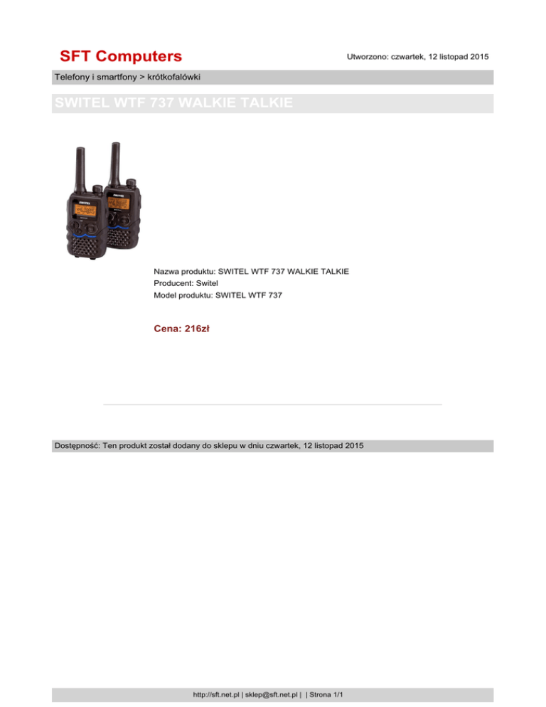 SFT Computers Utworzono: czwartek, 12 listopad 2015 Telefony i smartfony > krótkofalówki SWITEL WTF 737 WALKIE TALKIE Nazwa produktu: SWITEL WTF 737 WALKIE TALKIE Producent: Switel Model produktu: SWITEL WTF 737 Cena: 216zł Dostępność: Ten produkt został dodany do sklepu w dniu czwartek, 12 listopad 2015 http://sft.net.pl | [email protected] | | Strona 1/1