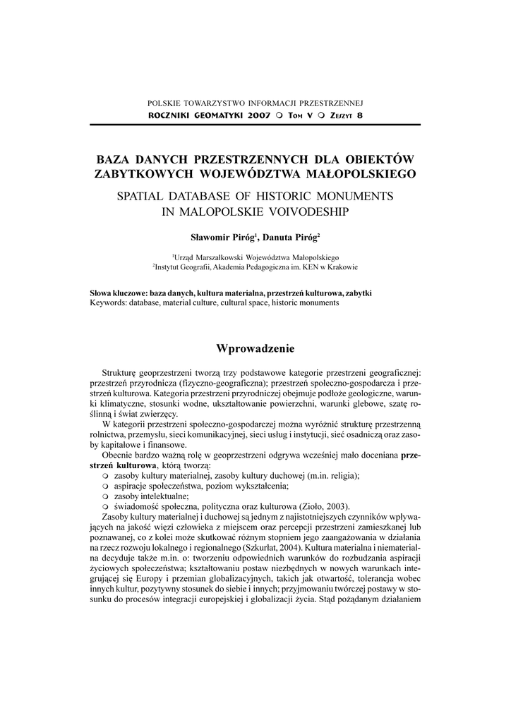 TOWARZYSTWO INFORMACJI PRZESTRZENNEJ Baza danych POLSKIE przestrzennych dla obiektów zabytkowych województwa ma³opolskiego ROCZNIKI GEOMATYKI 2007 m T OM V m ZESZYT 8 153 BAZA DANYCH PRZESTRZENNYCH DLA OBIEKTÓW ZABYTKOWYCH WOJEWÓDZTWA MA£OPOLSKIEGO SPATIAL DATABASE OF HISTORIC MONUMENTS IN MALOPOLSKIE VOIVODESHIP S³awomir Piróg1, Danuta Piróg2 1 Urz¹d Marsza³kowski Województwa Ma³opolskiego Instytut Geografii, Akademia Pedagogiczna im. KEN w Krakowie 2 S³owa kluczowe: baza danych, kultura materialna, przestrzeñ kulturowa, zabytki Keywords: database, material culture, cultural space, historic monuments Wprowadzenie Strukturê geoprzestrzeni tworz¹ trzy podstawowe kategorie przestrzeni geograficznej: przestrzeñ przyrodnicza (fizyczno-geograficzna); przestrzeñ spo³eczno-gospodarcza i przestrzeñ kulturowa. Kategoria przestrzeni przyrodniczej obejmuje pod³o¿e geologiczne, warunki klimatyczne, stosunki wodne, ukszta³towanie powierzchni, warunki glebowe, szatê rolinn¹ i wiat zwierzêcy. W kategorii przestrzeni spo³eczno-gospodarczej mo¿na wyró¿niæ strukturê przestrzenn¹ rolnictwa, przemys³u, sieci komunikacyjnej, sieci us³ug i instytucji, sieæ osadnicz¹ oraz zasoby kapita³owe i finansowe. Obecnie bardzo wa¿n¹ rolê w geoprzestrzeni odgrywa wczeniej ma³o doceniana przestrzeñ kulturowa, któr¹ tworz¹: m zasoby kultury materialnej, zasoby kultury duchowej (m.in. religia); m aspiracje spo³eczeñstwa, poziom wykszta³cenia; m zasoby intelektualne; m wiadomoæ spo³eczna, polityczna oraz kulturowa (Zio³o, 2003). Zasoby kultury materialnej i duchowej s¹ jednym z najistotniejszych czynników wp³ywaj¹cych na jakoæ wiêzi cz³owieka z miejscem oraz percepcji przestrzeni zamieszkanej lub poznawanej, co z kolei mo¿e skutkowaæ ró¿nym stopniem jego zaanga¿owania w dzia³ania na rzecz rozwoju lokalnego i regionalnego (Szkur³at, 2004). Kultura materialna i niematerialna decyduje tak¿e m.in. o: tworzeniu odpowiednich warunków do rozbudzania aspiracji ¿yciowych spo³eczeñstwa; kszta³towaniu postaw niezbêdnych w nowych warunkach integruj¹cej siê Europy i przemian globalizacyjnych, takich jak otwartoæ, tolerancja wobec innych kultur, pozytywny stosunek do siebie i innych; przyjmowaniu twórczej postawy w stosunku do procesów integracji europejskiej i globalizacji ¿ycia. St¹d po¿¹danym dzia³aniem 154 S³awomir Piróg, Danuta Piróg wydaje siê byæ poznanie zasobów kultury materialnej i duchowej na danym obszarze, zewidencjonowanie zasobów kultury materialnej i udostêpnianie tej informacji jak najszerszemu gronu osób zainteresowanych oraz ochrona i promocja tych zasobów. Wymienione dzia³ania s¹ szczególnie wa¿ne na obszarach o wyj¹tkowym bogactwie przestrzeni kulturowej, do których zalicza siê województwo ma³opolskie. Dlatego celem niniejszego opracowania jest ukazanie mo¿liwoci pozyskiwania i wykorzystywania geoinformacji w zakresie zabytków kultury materialnej, by optymalizowaæ proces zarz¹dzania nimi i sprawnie udostêpniaæ je osobom lub instytucjom zainteresowanym spo¿ytkowaniem tych¿e informacji dla promocji i budowy strategii rozwoju regionalnego województwa ma³opolskiego (Piróg, 2003). Przestrzeñ kulturowa województwa ma³opolskiego Poziom rozwoju przestrzeni kulturowej województwa ma³opolskiego jest bardzo wysoki, o czym wiadczy du¿a liczba i wartoæ historyczno-artystyczna obiektów zabytkowych. rednie nasycenie terenu województwa obiektami zabytkowymi jest bardzo du¿e i wynosi 32 obiekty/100km2. Pod tym wzglêdem wyprzedza je jedynie województwo dolnol¹skie (41 obiektów/100km2) i województwo opolskie (39 obiektów/100 km2). Najwiêkszym nasyceniem na terenie województwa ma³opolskiego charakteryzuj¹ siê 3 miasta: Kraków (411 obiektów/100km2), Nowy S¹cz (133 obiekty/100 km2) oraz Tarnów (90 obiektów/100 km 2). Najwa¿niejszymi czynnikami kszta³tuj¹cymi dziedzictwo kulturowe województwa wydaj¹ siê byæ: m zabytki, zw³aszcza zabytki Krakowa, regionalne budownictwo mieszkaniowe, budowle sakralne (kocio³y, cerkwie, synagogi); m oddzia³ywanie Krakowa jako orodka kulturalnego, naukowego, religijnego; m folklor; m tradycje rzemielnicze i przemys³owe (m.in. wydobywanie soli w Wieliczce, wyroby kowalskie w Su³kowicach); m zasoby krajobrazu naturalnego i kulturowego objête ochron¹ w postaci 6 parków narodowych i 11 parków krajobraTabela 1. Obiekty wpisane do rejestru zabytków zowych; nieruchomych na terenie woj. ma³opolskiego m przenikanie siê kultur pogranicza polwed³ug Centralnej Ewidencji Dóbr Kultury sko-³emkowskiego i polsko-s³owaci Rejestracji Zabytków Orodka Dokumentacji kiego. Zabytków w Warszawie Na terenie województwa ma³opolskiego Lp. O biekty zabytkowe Liczba wyró¿niono: obiektów m osiem obiektów i zespo³ów obiektów 1 architektura i budownictwo 3742 wpisanych w Polsce na listê wiatowego dziedzictwa UNESCO (Kraków 2 parki i cmentarze 541 w obrêbie Plant z Wawelem, Kazi3 stanowiska archeologiczne 399 mierzem i Stradomiem; kopalnia soli 4 budownictwo i przemys³ 67 w Wieliczce; obóz zag³ady w Owiê5 za³o¿enia przestrzenne 50 cimiu; zespó³ klasztorny Bernardynów wraz z kaplicami w Kalwarii 6 O GÓ £EM 4799 Zebrzydowskiej; koció³ w Binaroród³o: Plan zagospodarowania przestrzennego Baza danych przestrzennych dla obiektów zabytkowych województwa ma³opolskiego wej; koció³ w Dêbnie; koció³ w Lipnicy Murowanej; koció³ w Sêkowej); m liczne obiekty i zespo³y zabytkowe wpisane do rejestru zabytków (tab.1); m bogaty zasób obiektów znajduj¹cych siê w ewidencji konserwatorskiej (tab.2). W województwie ma³opolskim wyznaczono równie¿ szlaki tematyczne, do których nale¿¹ szlaki: Architektury Drewnianej, Cystersów, Orlich Gniazd, Cerkwi £emkowskich, Cmentarzy Wojskowych I Wojny wiatowej, Ma³opolskie Szlaki Techniki oraz szlaki projektowane: Komunikacyjny, Kopalniano-Przemys³owy, Po¿arnictwa, Obiektów Hydrotechnicznych, Przemys³u Wiejski