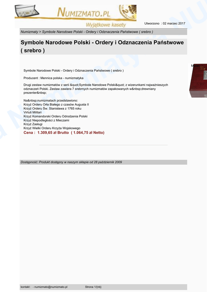 U N Utworzono : 02 marzec 2017 a k Numizmaty > Symbole Narodowe Polski - Ordery i Odznaczenia Państwowe ( srebro ) y t a Symbole Narodowe Polski - Ordery i Odznaczenia Państwowe ( srebro ) m z i m u Symbole Narodowe Polski - Ordery i Odznaczenia Państwowe ( srebro ) Producent : Mennica polska - numizmatyka Drugi zestaw numizmatów z serii "Symbole Narodowe Polski" z wizerunkami najważnieszych odznaczeń Polski. Zestaw zawiera 7 srebrnych numizmatów zapakowanych w drewniany prezenter Na numizmatach przedstawiono: Krzyż Orderu Orła Białego z czasów Augusta II Krzyż Orderu Św. Stanisława z 1765 roku Virtuti Militari Krzyż Komandorski Orderu Odrodzenia Polski Krzyż Niepodległości z Mieczami Krzyż Zasługi Krzyż Wielki Orderu Krzyża Wojskowego N a Cena : 1.309,65 zł Brutto ( 1.064,75 zł Netto) Dostępność: Produkt dostępny w naszym sklepie od 28 październik 2009 kontakt : - [email protected] Strona 1/{nb} Model : -