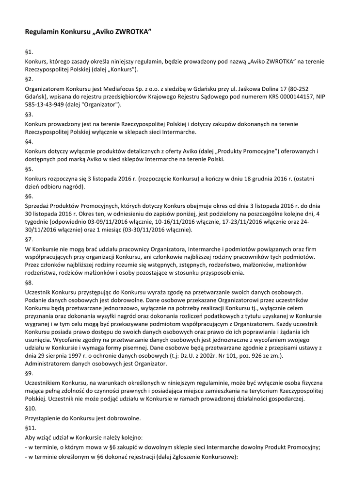 Regulamin Konkursu „Aviko ZWROTKA” §1. Konkurs, którego zasady określa niniejszy regulamin, będzie prowadzony pod nazwą „Aviko ZWROTKA” na terenie Rzeczypospolitej Polskiej (dalej „Konkurs”). §2. Organizatorem Konkursu jest Mediafocus Sp. z o.o. z siedzibą w Gdańsku przy ul. Jaśkowa Dolina 17 (80-‐252 Gdańsk), wpisana do rejestru przedsiębiorców Krajowego Rejestru Sądowego pod numerem KRS 0000144157, NIP 585-‐13-‐43-‐949 (dalej "Organizator"). §3. Konkurs prowadzony jest na terenie Rzeczypospolitej Polskiej i dotyczy zakupów dokonanych na terenie Rzeczypospolitej Polskiej wyłącznie w sklepach sieci Intermarche. §4. Konkurs dotyczy wyłącznie produktów detalicznych z oferty Aviko (dalej „Produkty Promocyjne”) oferowanych i dostępnych pod marką Aviko w sieci sklepów Intermarche na terenie Polski. §5. Konkurs rozpoczyna się 3 listopada 2016 r. (rozpoczęcie Konkursu) a kończy w dniu 18 grudnia 2016 r. (ostatni dzień odbioru nagród). §6. Sprzedaż Produktów Promocyjnych, których dotyczy Konkurs obejmuje okres od dnia 3 listopada 2016 r. do dnia 30 listopada 2016 r. Okres ten, w odniesieniu do zapisów poniżej, jest podzielony na poszczególne kolejne dni, 4 tygodnie (odpowiednio 03-‐09/11/2016 włącznie, 10-‐16/11/2016 włącznie, 17-‐23/11/2016 włącznie oraz 24-‐ 30/11/2016 włącznie) oraz 1 miesiąc (03-‐30/11/2016 włącznie). §7. W Konkursie nie mogą brać udziału pracownicy Organizatora, Intermarche i podmiotów powiązanych oraz firm współpracujących przy organizacji Konkursu, ani członkowie najbliższej rodziny pracowników tych podmiotów. Przez członków najbliższej rodziny rozumie się wstępnych, zstępnych, rodzeństwo, małżonków, małżonków rodzeństwa, rodziców małżonków i osoby pozostające w stosunku przysposobienia. §8. Uczestnik Konkursu przystępując do Konkursu wyraża zgodę na przetwarzanie swoich danych osobowych. Podanie danych osobowych jest dobrowolne. Dane osobowe przekazane Organizatorowi przez uczestników Konkursu będą przetwarzane jednorazowo, wyłącznie na potrzeby realizacji Konkursu tj., wyłącznie celem przyznania oraz dokonania wysyłki nagród oraz dokonania rozliczeń podatkowych z tytułu uzyskanej w Konkursie wygranej i w tym celu mogą być przekazywane podmiotom współpracującym z Organizatorem. Każdy uczestnik Konkursu posiada prawo dostępu do swoich danych osobowych oraz prawo do ich poprawiania i żądania ich usunięcia. Wycofanie zgodny na przetwarzanie danych osobowych jest jednoznaczne z wycofaniem swojego udziału w Konkursie i wymaga formy pisemnej. Dane osobowe będą przetwarzane zgodnie z przepisami ustawy z dnia 29 sierpnia 1997 r. o ochronie danych osobowych (t.j: Dz.U. z 2002r. Nr 101, poz. 926 ze zm.). Administratorem danych osobowych jest Organizator. §9. Uczestnikiem Konkursu, na warunkach określonych w niniejszym regulaminie, może być wyłącznie osoba fizyczna mająca pełną zdolność do czynności prawnych i posiadająca miejsce zamieszkania na terytorium Rzeczypospolitej Polskiej. Uczestnik nie może podjąć udziału w Konkursie w ramach prowadzonej działalności gospodarczej. §10. Przystąpienie do Konkursu jest dobrowolne. §11. Aby wziąć udział w Konkursie należy kolejno: -‐ w terminie, o którym mowa w §6 zakupić w dowolnym sklepie sieci Intermarche dowolny Produkt Promocyjny; -‐ w terminie określonym w §6 dokonać rejestracji (dalej Zgłoszenie Konkursowe): a/ na stronie internetowej Konkursu pod adresem www.avikozwrotka.pl (dalej Strona Konkursu), podając swój adres e-‐mail, imię, miasto w którym dokonano zakupu Produktu Promocyjnego, numer telefonu oraz numer paragonu potwierdzającego dokonanie zakupu; LUB b/ za pośrednictwem SMS-‐a wysyłając SMS na numer 4321 (na koszt nadawcy, opłata zgodna z taryfą jego operatora) o treści zgodnej ze schematem: AVIKO_numer paragonu_miasto_imię, gdzie AVIKO to tzw. prefiks służący identyfikacji uczestnika konkursu w systemie SMS, numer paragonu oznacza numer paragonu potwierdzającego zakup Produktu Promocyjnego, miasto oznacza miasto w którym dokonano tego zakupu, a imię oznacza imię nadawcy SMS-‐a -‐ następnie, postępując zgodnie z instrukcjami zawartymi na stronie internetowej lub w kolejnych wiadomościach SMS wysyłanych na adres nadawcy SMS zgłoszeniowego, dokończyć, w jak najbardziej kreatywny i wesoły sposób, tzw. ZWROTKĘ (dalej Zadanie Konkursowe) czyli krótki rymowany wierszyk, którego treść jest umieszczona na Stronie Konkursu lub wysłana za pośrednictwem SMS-‐a. §12. Uczestnik zobowiązany jest zachować oryginalny paragon, czyli dowód zakupu Produktu Promocyjnego zgodny z terminem sprzedaży Produktów Promocyjnych określonym w §6, który jest niezbędny do odbioru nagrody w przypadku wygranej. §13. Jeden uczestnik może wysłać dowolną ilość Zgłoszeń Konkursowych, pod warunkiem spełnienia wymogów opisanych w §11 niniejszego Regulaminu i z uwzględnieniem zasad wynikających z §18; jeden paragon może być wykorzystany tylko jeden raz. §14. Zgłoszenia Konkursowe które dotrą do Organizatora w czasie innym niż wskazany w §11 nie będą uwzględniane w Konkursie. Zgłoszenia Konkursowe niezgodne z wymogami określonymi w §11 nie będą uwzględniane w Konkursie. §15. W ramach Zadania Konkursowego, Uczestnik powinien dokończyć Zadanie Konkursowe wpisując dowolne zakończenie zaproponowanej ZWROTKI. Zgłoszenia Konkursowe zawierające treści sprzeczne z prawem, łamiące normy społeczne i obyczajowe, będące niezgodne z polityką firmy Aviko lub Intermarche lub będące niezgodne z założeniami Konkursu i Zadania Konkursowego nie będą brane pod uwagę, tj. nie zostaną umieszczone na stronie internetowej i nie będą przedmiotem oceny Jury. W szczególności Zadanie Konkursowe nie zostanie zaakceptowane, jeżeli: -‐ zawierać będzie treści wulgarne lub związane z przemocą, religią 