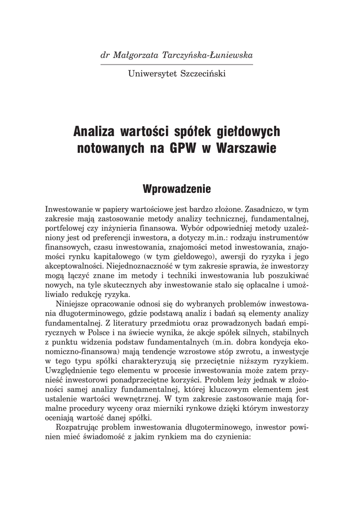 dr Maïgorzata Tarczyñska-uniewska Uniwersytet Szczeciñski Analiza wartoĂci spóïek gieïdowych notowanych na GPW w Warszawie Wprowadzenie Inwestowanie w papiery wartoĂciowe jest bardzo zïoĝone. Zasadniczo, w tym zakresie majÈ zastosowanie metody analizy technicznej, fundamentalnej, portfelowej czy inĝynieria finansowa. Wybór odpowiedniej metody uzaleĝniony jest od preferencji inwestora, a dotyczy m.in.: rodzaju instrumentów finansowych, czasu inwestowania, znajomoĂci metod inwestowania, znajomoĂci rynku kapitaïowego (w tym gieïdowego), awersji do ryzyka i jego akceptowalnoĂci. NiejednoznacznoĂÊ w tym zakresie sprawia, ĝe inwestorzy mogÈ ïÈczyÊ znane im metody i techniki inwestowania lub poszukiwaÊ nowych, na tyle skutecznych aby inwestowanie staïo siÚ opïacalne i umoĝliwiaïo redukcjÚ ryzyka. Niniejsze opracowanie odnosi siÚ do wybranych problemów inwestowania dïugoterminowego, gdzie podstawÈ analiz i badañ sÈ elementy analizy fundamentalnej. Z literatury przedmiotu oraz prowadzonych badañ empirycznych w Polsce i na Ăwiecie wynika, ĝe akcje spóïek silnych, stabilnych z punktu widzenia podstaw fundamentalnych (m.in. dobra kondycja ekonomiczno-finansowa) majÈ tendencje wzrostowe stóp zwrotu, a inwestycje w tego typu spóïki charakteryzujÈ siÚ przeciÚtnie niĝszym ryzykiem. UwzglÚdnienie tego elementu w procesie inwestowania moĝe zatem przynieĂÊ inwestorowi ponadprzeciÚtne korzyĂci. Problem leĝy jednak w zïoĝonoĂci samej analizy fundamentalnej, której kluczowym elementem jest ustalenie wartoĂci wewnÚtrznej. W tym zakresie zastosowanie majÈ formalne procedury wyceny oraz mierniki rynkowe dziÚki którym inwestorzy oceniajÈ wartoĂÊ danej spóïki. RozpatrujÈc problem inwestowania dïugoterminowego, inwestor powinien mieÊ ĂwiadomoĂÊ z jakim rynkiem ma do czynienia: 80 dr Maïgorzata Tarczyñska-uniewska • czy jest to rynek stabilny, o niskim ryzyku, wysokim poziomie rozwoju i moĝliwoĂci zastosowañ wyspecjalizowanych narzÚdzi inwestycyjnych1, • czy jest to rynek rozwijajÈcy, i jaki: o stabilnym poziomie rozwoju czy niestabilnym co wiÈĝe siÚ z ocenÈ rynku i wpïywa na poziom ryzyka inwestowania, czy moĝliwe jest zastosowanie wyspecjalizowanych narzÚdzi inwestycyjnych. Poziom rozwoju rynku kapitaïowego (gieïdy papierów wartoĂciowych) jest rozpatrywany przez pryzmat wielu czynników. Jednymi z najwaĝniejszych sÈ: kapitalizacja gieïdy, pïynnoĂÊ rynku, poziom indeksów gieïdowych, wolumen obrotów, liczba spóïek krajowych i zagranicznych (w tym liczba debiutów na rynku). Obserwacja tych czynników w czasie pozwala na okreĂlenie kierunku rozwoju danego rynku. Ponadto w procesie rozwoju rynków na Ăwiecie oraz zachodzÈcym procesie globalizacji, te elementy stajÈ podstawÈ analiz w ramach rynków. Inwestorzy zagraniczni (indywidualni i instytucjonalni) rozpatrujÈc powyĝsze elementy okreĂlajÈ poziom zainteresowania danym rynkiem, a co za tym indzie chÚÊ inwestowania na nim. OczywiĂcie, aby zostaïa podjÚta decyzja o uczestnictwie w danym rynku przeprowadzane sÈ inne szczegóïowe analizy dotyczÈce instrumentów, w które inwestor bÚdzie inwestowaï, czasu inwestycji, technik inwestycyjnych itp. PoïÈczenie tych elementów, a wiÚc mierników wartoĂci spóïek z czynnikami umoĝliwiajÈcymi okreĂlenie stanu rynku, pozwoli inwestorom i analitykom rynków na wïaĂciwy proces jego analizy i diagnozy. WiÈĝe siÚ to jednoczeĂnie z okreĂleniem atrakcyjnoĂci inwestycyjnej w dïugim horyzoncie czasowym (w co inwestowaÊ i jakie techniki inwestycyjne wykorzystaÊ), identyfikacji ryzyka rynku czy sposobów jego pomiaru. Badanie empiryczne niniejszego opracowania dotyczy analizy wybranych czynników oceny rynku kapitaïowego w Polsce oraz wybranych mierników wartoĂci spóïek notowanych na GPW w Warszawie. Analiza zostaïa przeprowadzona w czasie i przestrzeni z wykorzystaniem wybranych miar statystycznych. W ten sposób moĝna zaobserwowaÊ jak poszczególne czynniki ksztaïtowaïy siÚ w czasie i jaki ma to zwiÈzek z okreĂleniem stanu rynku w Polsce. Tym samym analityk ma moĝliwoĂÊ wstÚpnego rozpoznania jego atrakcyjnoĂci inwestycyjnej. Naleĝy przy tym dodaÊ, ĝe GPW w Warszawie naleĝy do jednej z najbardziej rozwijajÈcych siÚ gieïd Ărodkowowschodnich. Ponadto zbadanie relacji miÚdzy wybranymi czynnikami stanu rynku a wybranymi miernikami wartoĂci spóïek pozwoli okreĂliÊ czy relacje takie w ogóle zachodzÈ i jaki ma to wpïyw na wykorzystanie danych informacji w praktyce inwestowania. 1 W zakresie „wyspecjalizowanych narzÚdzi inwestycyjnych” naleĝy rozumieÊ moĝliwoĂÊ zastosowania metod analizy technicznej, fundamentalnej, portfelowej, teorii dywersyfikacji ryzyka, inĝynierii finansowej. Analiza wartoĂci spóïek gieïdowych notowanych na GPW w Warszawie 81 1. Podstawy teoretyczne badania W ramach analizy fundamentalnej kluczowym elementem staje siÚ okreĂlenie wartoĂci wewnÚtrznej akcji, a tym samym niedowartoĂciowania lub przewartoĂciowania przez rynek gieïdowy. Przy czym podejmujÈcy decyzje inwestycyjne w ramach analizy fundamentalnej sÈ zainteresowani poszukiwaniem akcji niedowartoĂciowanych, gdyĝ spóïki takie, jak wynika z dotychczasowych badañ majÈ tendencje wzrostowe stóp zwrotu. W literaturze przedmiotu taki sposób dziaïania na rynku nazywany jest „inwestowaniem w wartoĂÊ”. Prekursorem tej techniki inwestycyjnej byï Benjamin Graham juĝ w latach trzydziestych XX wieku. Kontynuatorami tej teorii byli/sÈ m.in. Warren Buffet, Christopher H. Browne, Josef Lakonishok, William Sharpe, Jeremy Siegel. W swoich pracach zwracajÈ uwagÚ na kolejne czynniki (np. wskaěniki rynkowe P/E, P/BV, wskaěniki pïynnoĂci, poziomy zysku EBITDA, zysku operacyjnego, przepïywów finansowych, struktury kosztów, przychodów i in.), które majÈ niebagatelny wpïyw na sposób okreĂlania wartoĂci akcji i jednoczeĂnie poĂrednio, choÊ nie zdefinio