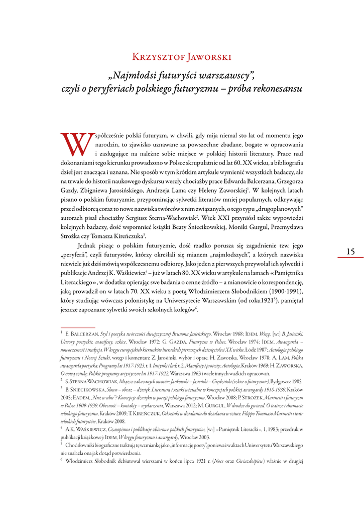 Krzysztof Jaworski „Najmłodsi futuryści warszawscy”, czyli o peryferiach polskiego futuryzmu – próba rekonesansu W spółcześnie polski futuryzm, w chwili, gdy mija niemal sto lat od momentu jego narodzin, to zjawisko uznawane za powszechne zbadane, bogate w opracowania i zasługujące na należne sobie miejsce w polskiej historii literatury. Prace nad dokonaniami tego kierunku prowadzono w Polsce skrupulatnie od lat 60. XX wieku, a bibliografia dzieł jest znacząca i uznana. Nie sposób w tym krótkim artykule wymienić wszystkich badaczy, ale na trwale do historii naukowego dyskursu weszły chociażby prace Edwarda Balcerzana, Grzegorza Gazdy, Zbigniewa Jarosińskiego, Andrzeja Lama czy Heleny Zaworskiej1. W kolejnych latach pisano o polskim futuryzmie, przypominając sylwetki literatów mniej popularnych, odkrywając przed odbiorcą coraz to nowe nazwiska twórców z nim związanych, o tego typu „drugoplanowych” autorach pisał chociażby Sergiusz Sterna-Wachowiak2. Wiek XXI przyniósł także wypowiedzi kolejnych badaczy, dość wspomnieć książki Beaty Śniecikowskiej, Moniki Gurgul, Przemysława Strożka czy Tomasza Kireńczuka3. Jednak pisząc o polskim futuryzmie, dość rzadko porusza się zagadnienie tzw. jego „peryferii”, czyli futurystów, którzy określali się mianem „najmłodszych”, a których nazwiska niewiele już dziś mówią współczesnemu odbiorcy. Jako jeden z pierwszych przywołał ich sylwetki i publikacje Andrzej K. Waśkiewicz4 – już w latach 80. XX wieku w artykule na łamach «Pamiętnika Literackiego», w dodatku opierając swe badania o cenne źródło – a mianowicie o korespondencję, jaką prowadził on w latach 70. XX wieku z poetą Włodzimierzem Słobodnikiem (1900-1991), który studiując wówczas polonistykę na Uniwersytecie Warszawskim (od roku19215), pamiętał jeszcze zapoznane sylwetki swoich szkolnych kolegów6. 1 E. Balcerzan, Styl i poetyka twórczości dwujęzycznej Brunona Jasieńskiego, Wrocław 1968; Idem, Wstęp, [w:] B. Jasieński, Utwory poetyckie, manifesty, szkice, Wrocław 1972; G. Gazda, Futuryzm w Polsce, Wrocław 1974; Idem, Awangarda – nowoczesność i tradycja. W kręgu europejskich kierunków literackich pierwszych dziesięcioleci XX wieku, Łódź 1987; Antologia polskiego futuryzmu i Nowej Sztuki, wstęp i komentarz Z. Jarosiński, wybór i oprac. H. Zaworska, Wrocław 1978; A. Lam, Polska awangarda poetycka. Programy lat 1917-1923, t. 1. Instynkt i ład; t. 2. Manifesty i protesty: Antologia, Kraków 1969; H. Zaworska, O nową sztukę. Polskie programy artystyczne lat 1917-1922, Warszawa 1963 i wiele innych ważkich opracowań. 2 S. Sterna-Wachowiak, Miąższ zakazanych owoców. Jankowski – Jasieński – Grędziński (szkice o futuryzmie), Bydgoszcz 1985. 3 B. Śniecikowska, Słowo – obraz – dźwięk. Literatura i sztuki wizualne w koncepcjach polskiej awangardy 1918-1939, Kraków 2005; Eadem, „Nuż w uhu”? Koncepcje dźwięku w poezji polskiego futuryzmu, Wrocław 2008; P. Strożek, Marinetti i futuryzm w Polsce 1909-1939. Obecność – kontakty – wydarzenia, Warszawa 2012; M. Gurgul, W drodze do gwiazd. O teatrze i dramacie włoskiego futuryzmu, Kraków 2009; T. Kireńczuk, Od sztuki w działaniu do działania w sztuce. Filippo Tommaso Marinetti i teatr włoskich futurystów, Kraków 2008. 4 A.K. Waśkiewicz, Czasopisma i publikacje zbiorowe polskich futurystów, [w:] «Pamiętnik Literacki», 1, 1983; przedruk w publikacji książkowej: Idem, W kręgu futuryzmu i awangardy, Wrocław 2003. 5 Choć słowniki biograficzne traktują tę wzmiankę jako „informację poety”, ponieważ w aktach Uniwersytetu Warszawskiego nie znalazła ona jak dotąd potwierdzenia. 6 Włodzimierz Słobodnik debiutował wierszami w końcu lipca 1921 r. (Noce oraz Gwiazdośpiew) właśnie w drugiej 15 Krzysztof Jaworski 16 Zainspirowany niegdyś tą właśnie publikacją A.K. Waśkiewicza postanowiłem kontynuować temat „drugorzędnych” futurystów7. Sądziłem, że tak jak uznany futuryzm polski reprezentuje ważne dziedzictwo naszego narodowego piśmiennictwa, tak ten „nieuznany”, stanowiąc w pewnym sensie jego karykaturalne odbicie, jest przecież także ważnym głosem w dyskusji o rodzimej literaturze, także na swój sposób próbującym dać odpowiedź na pytanie, jaką rolę w społeczeństwie powinna spełniać najnowsza literatura i jakie miejsce powinien zajmować jej twórca – artysta, który mógł wypowiadać się wreszcie nie tylko w warunkach narodowej niewoli, ale powinien starać się znaleźć nowoczesną formułę odrodzonej sztuki polskiej. Temat „peryferii” futuryzmu kusił tym bardziej, że sam Waśkiewicz wskazywał na niemałe luki, jeśli chodzi o dostępność do wydawanych przez poetów publikacji (niektóre uchodziły za zaginione), stąd naturalną wydawała się próba poszerzenia wiedzy faktograficznej, dotarcia do źródeł, opisania i uszczegółowienia tego zjawiska, być może drugorzędnego, ale właśnie jako takiego oświetlającego z właściwej perspektywy polski futuryzm pierwszorzędny, ten uznany. To jednak stało się możliwe dopiero z chwilą ukończenia mojej pracy nad Kroniką polskiego futuryzmu (2015), w której starałem się zgromadzić i uporządkować w układzie chronologicznym wydarzenia zarówno z obszaru artystycznego (literatury, teatru, filmu, plastyki, muzyki i innych), jak i działalności pozaliterackiej czy życia publicznego lat 1909-1939. Wówczas „nieuznany” futuryzm zaprezentował swoje pełne oblicze. Dziś już wiadomo, że polski futuryzm nie był nurtem jednolitym, że między lutym 1919 r. a marcem roku 1921 w Polsce funkcjonowało tak naprawdę około czterech konkurencyjnych wobec siebie grup – futuryści tzw. „warszawscy” (z poetami Anatolem Sternem i Aleksandrem Watem) oraz futuryści „krakowscy” (z poetami Tytusem Czyżewskim, Brunonem Jasieńskim i Stanisławem Młodożeńcem)8; na ten „u
