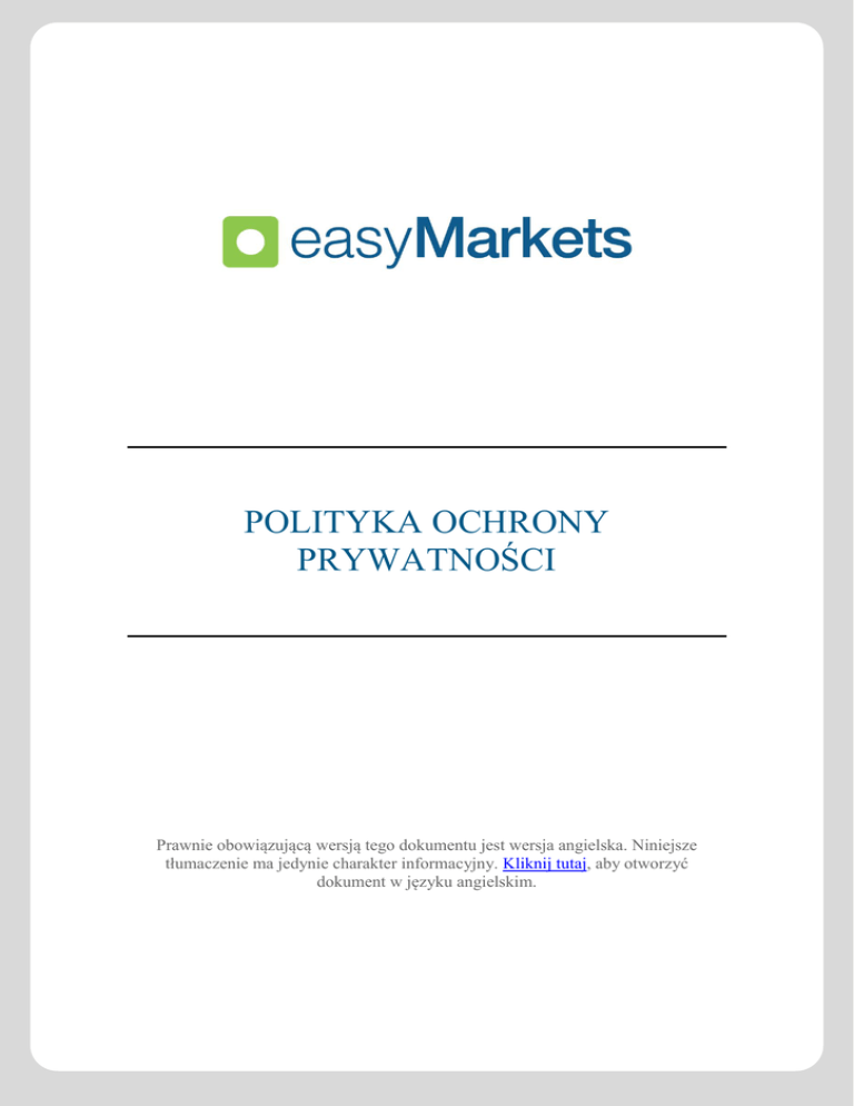 POLITYKA OCHRONY PRYWATNOŚCI Prawnie obowiązującą wersją tego dokumentu jest wersja angielska. Niniejsze tłumaczenie ma jedynie charakter informacyjny. Kliknij tutaj, aby otworzyć dokument w języku angielskim. 31 grudnia 2013 POLITYKA OCHRONY PRYWATNOŚCI – BEZPIECZEŃSTWO Poprzez zarejestrowanie się lub wejście na stronę internetową easyMarkets wyrażasz zgodę na pozyskiwanie, wykorzystywanie i przetwarzanie twoich danych osobowych. Dane osobowe Przepisy prawa nakładają na nas obowiązek pozyskiwania i przetwarzania danych osobowych w ramach świadczenia usług. Pozyskujemy również dane osobowe dla celów wewnętrznych i administracyjnych, w tym związanych z promocją i marketingiem (np. wiadomości e-mail, SMS, portale społecznościowe), jak również aby zapewniać lepszy komfort korzystania i usprawniać obsługę klienta. Takie dane są przechowywane w bezpieczny sposób na nośnikach fizycznych lub w formie elektronicznej, przy jednoczesnym zastosowaniu proceduralnych środków kontroli. Wszystkie dane osobowe są traktowane jako POUFNE. Pozyskujemy jedynie dane osobowe, które są niezbędne i odpowiednie dla prowadzonej przez nas działalności. Wszelkie dane przechowywane są tylko przez uzasadniony okres. Nigdy nie prosimy o przekazanie większej ilości informacji, niż wymagają tego od nas przepisy prawa. Możemy pozyskiwać informacje pośrednie, które są wykorzystywane jedynie w celach związanych z weryfikacją i bezpieczeństwem, lub służą tylko w celu poprawnego przeglądania strony lub zapewnienia właściwej funkcjonalności. Dane te mogą obejmować adres (IP), rodzaj przeglądarki internetowej, system operacyjny, usługodawcę internetowego (ISP), pliki cookie. Prosimy zapoznać się z naszą polityką dotyczącą plików cookie, która znajduje się pod adresem www.easymarkets.com/legal. Jakiego rodzaju informacje pozyskujecie ode mnie? Przez okres współpracy informacje pozyskujemy bezpośrednio od użytkownika. Mogą to być dane osobowe, takie jak: imię i nazwisko, dane profilu społecznościowego, adres IP, kraj zamieszkania, data urodzenia, e-mail, adres pocztowy, dane bankowe, informacje dotyczące sytuacji finansowej, aktywności podczas wykonywania transakcji, historii przeprowadzonych transakcji, informacje o saldzie konta oraz wybrane dokumenty KYC (tzw. dokumenty „znaj swojego klienta”). Dokumentami KYC są na przykład: • Dokument potwierdzający tożsamość (np. dowód osobisty, paszport, prawo jazdy) • Dokument potwierdzający adres zamieszkania (np. rachunek opłat mieszkaniowych, prawo jazdy) • Zestawienie transakcji dokonanych kartą kredytową (np. wyciąg z konta) ©Blue Capital Markets Limited 2015. Wszelkie prawa zastrzeżone. Pliki cookie Pliki cookie to niewielkie pliki tekstowe, które podczas dostępu do internetu są wysyłane na dane urządzenie (np. komputer stacjonarny lub laptop, smartfon, tablet lub phablet), gdy użytkownik po raz pierwszy odwiedza daną stronę internetową, a następnie przechowywane na tym urządzeniu. Pliki cookie pozwalają serwisowi internetowemu rozpoznać urządzenie użytkownika. Celem zastosowania plików cookie jest usprawnienie obsługi i poprawienie komfortu użytkownika podczas korzystania z danego serwisu. Więcej informacji na temat naszej polityki dotyczącej plików cookie można znaleźć pod adresem www.easymarkets.com/legal. Portale Społecznościowe i Promocje Możemy zbierać osobiste informacje z kanałów społecznościach podczas interakcji z nami na naszych portalach społecznościach, a także za pośrednictwem jednej z naszych aplikacji i/lub innych portali internetowych takich jak np.: publiczne bazy danych partnerzy do spraw marketingu; platformy mediów społecznościowych; od osób, z którymi Jesteś połączony jako znajomy lub w inny sposób na platformach serwisów społecznościowych, a także od innych osób trzecich. Dlaczego pozyskujemy dane osobowe? Aby chronić interesy naszych klientów; • Aby zapewnić bezpieczeństwo, integralność i poufność ewidencji i transakcji naszych klientów; • Aby chronić przed nieupoważnionym dostępem lub wykorzystywaniem ewidencji lub informacji klientów, co z kolei mogłoby wyrządzić poważne szkody lub spowodować niedogodności naszym klientom; • Aby działać w zgodzie z obowiązującymi przepisami prawa; • Aby usprawniać nasze usługi oraz wzmacniać doznania klientów. • Aby dostosować promocje i edukację do Twoich potrzeb i zainteresowań; • Aby umożliwić Ci udział w społecznościowych ankietach, promocjach i konkursach; by rozdawać nagrody, darowizny w odpowiedni sposób. Niektóre z tych działań mają dodatkowe zasady, które mogą zawierać dodatkowe informacje o tym, jak wykorzystywać i ujawniać dane osobowe, więc ważne jest, aby przeczytać dodatkowe zasady uważnie; • Aby umożliwić Ci uczestnictwo na chacie, stronach profilowych i blogach oraz innych usługach, do których Jesteś w stanie opublikować informacje i materiały (w tym nasze portale społecznościowe). Bezpieczeństwo i ochrona danych naszych użytkowników to dla nas najważniejszy cel. Nie sprzedajemy ani danych osobowych ani bazy klientów. Nie prowadzimy dystrybucji ani nie przekazujemy jakichkolwiek danych swoich klientów jakiejkolwiek nieupoważnionej lub niepowiązanej stronie trzeciej. Możemy ujawnić dane ©Blue Capital Markets Limited 2015. Wszelkie prawa zastrzeżone. niepowiązanej stronie trzeciej, z którą prowadzimy interesy. W takich sytuacjach sporządzamy umowy o zachowaniu poufności, a ujawnieniu podlegają tylko te dane, którą są niezbędne i wymagane w celu świadczenia usług na rzecz użytkownika. Usługi te mogą obejmować współpracę z instytucjami finansowymi, takimi jak banki i dostawcy usług płatniczych, działania promocyjne, monitoring związany z praniem brudnych pieniędzy i zwalczaniem nadużyć finansowych, a także wzmacnianie doznań klientów.