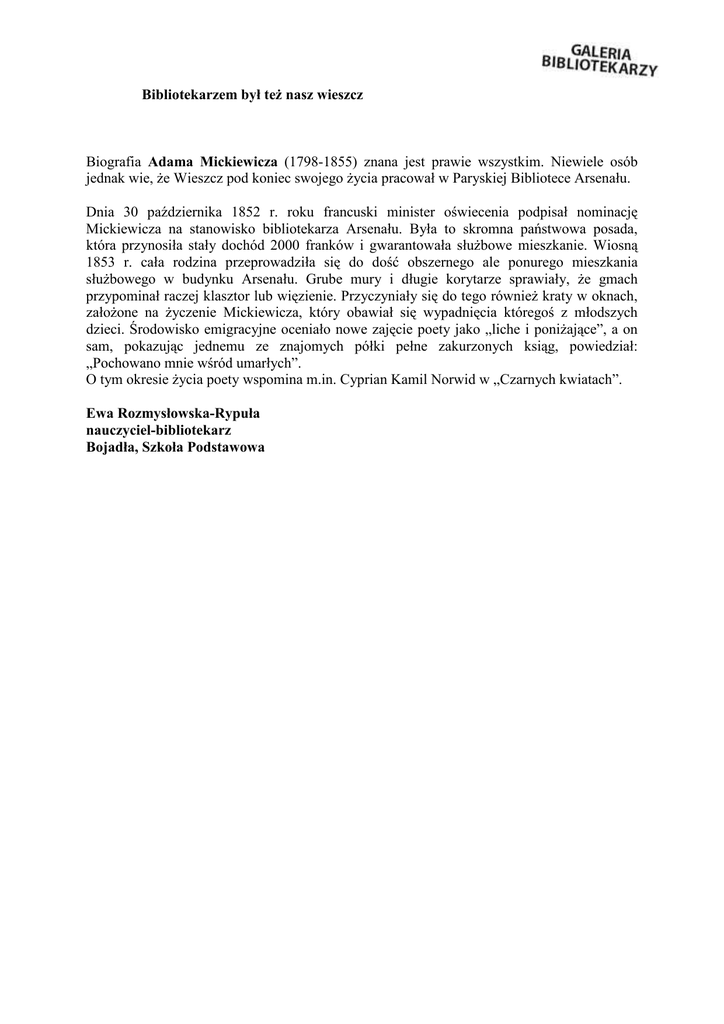 Bibliotekarzem był teŜ nasz wieszcz Biografia Adama Mickiewicza (1798-1855) znana jest prawie wszystkim. Niewiele osób jednak wie, Ŝe Wieszcz pod koniec swojego Ŝycia pracował w Paryskiej Bibliotece Arsenału. Dnia 30 października 1852 r. roku francuski minister oświecenia podpisał nominację Mickiewicza na stanowisko bibliotekarza Arsenału. Była to skromna państwowa posada, która przynosiła stały dochód 2000 franków i gwarantowała słuŜbowe mieszkanie. Wiosną 1853 r. cała rodzina przeprowadziła się do dość obszernego ale ponurego mieszkania słuŜbowego w budynku Arsenału. Grube mury i długie korytarze sprawiały, Ŝe gmach przypominał raczej klasztor lub więzienie. Przyczyniały się do tego równieŜ kraty w oknach, załoŜone na Ŝyczenie Mickiewicza, który obawiał się wypadnięcia któregoś z młodszych dzieci. Środowisko emigracyjne oceniało nowe zajęcie poety jako „liche i poniŜające”, a on sam, pokazując jednemu ze znajomych półki pełne zakurzonych ksiąg, powiedział: „Pochowano mnie wśród umarłych”. O tym okresie Ŝycia poety wspomina m.in. Cyprian Kamil Norwid w „Czarnych kwiatach”. Ewa Rozmysłowska-Rypuła nauczyciel-bibliotekarz Bojadła, Szkoła Podstawowa