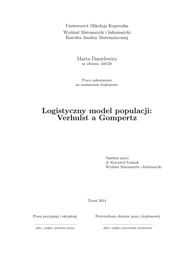 Uniwersytet Mikołaja Kopernika Wydział Matematyki i Informatyki Katedra Analizy Matematycznej Marta Danielewicz nr albumu: 248528 Praca zaliczeniowa na seminarium dyplomowe Logistyczny model populacji: Verhulst a Gompertz Opiekun pracy dr Krzysztof Leśniak Wydział Matematyki i Informatyki Toruń 2014 Pracę przyjmuję i akceptuję Potwierdzam złożenie pracy dyplomowej .......................................... .................................................. data i podpis opiekuna pracy data i podpis pracownika dziekanatu Wstęp Zaczniemy od krótkiego wprowadzenia. Model Verhulsta jest modyfikacją modelu Malthusa, który zakładał wykładniczy wzrost populacji i prezentował się następująco: dN = f (N), N(t0 ) = N0 dt gdzie funkcja f (N) = kN opisuje tempo zmiany populacji, k = b − d, b > 0 – tempo namnażania, d > 0 – tempo wymierania, N(t0 ) – stan populacji w momencie początkowym. Jednak obliczenia prowadziły do wniosku, iż liczebność dąży do nieskończoności. Z obserwacji wiadomo, że populacje nie rozwijają się nieograniczenie, stąd model jest błędny i nie uwzględnia wielu ważnych czynników takich jak: zróżnicowanie osobnicze, wiek osobników, wyczerpywanie się zasobów pokarmowych, efektu przegęszczenia, jego wpływu na spadek rozrodczości i wzrost śmiertelności, migracji czy nieprzewidywalnych czynników losowych. Z tego względu Verhulst w 1838 roku zaproponował swój model. W niniejszej pracy przedstawione zostaną dwa modele logistyczne populacji: model Verhulsta oraz model Gompertza. Moim celem będzie porównanie obu tych modeli. 3 Rozdział 1. Model Verhulsta Model zaprezentowany przez Verhulsta1 opisuje równanie: dN N = kN 1 − dt p ! , N(t0 ) = N0 , nazywane równianiem wzrostu logistycznego. Stała k ma takie samo znaczenie jak w modelu Malthusa (czyli k = b − d, b > 0 – tempo namnażania, d > 0 – tempo wymierania), natomiast p > 0 oznacza pojemność środowiska. Pojemność zależy w istotny sposób od dostępnych zasobów, kp nazywamy współczynnikiem konkurencji. Powyższe równanie jest równaniem o rozdzielonych zmiennych, które przekształcamy w następujący sposób: dN N(1 − N ) p = kdt, następnie całkujemy obustronnie a ponieważ p N (p−N ) = 1 N dN Z Z N 1− Z pdN =k N (p − N) + 1 , p−N Z dN + N N p = kdt, Z dt, to: Z dN =k p−N Z dt, w drugiej całce stosujemy podstawienie u = p − N, du = −dN i otrzymujemy 1 Pierre François Verhulst (1894–1849) — belgijski matematyk oraz doktor teorii liczb Uniwersytetu w Gent 5 ROZDZIAŁ 1. MODEL VERHULSTA 6 ln|N| − ln|p − N| = kt + C, N ln p − N = kt + C, N = ekt+C , p−N a ostatecznie N = Cekt , p−N C ∈ R. Biorąc pod uwagę warunek początkowy N(t0 ) = N0 , mamy: N0 = Cekt0 p − N0 skąd C= N0 −kt0 e . p − N0 Teraz przekształcimy rozwiązanie 1.1 tak, by wyznaczyć N. N = Cekt , p−N N = Cekt (p − N), N + NCekt = pCekt , N = pCekt − NCekt , N(1 + Cekt ) = pCekt , ostatecznie N(t) = pCekt . 1 + Cekt Podstawiamy wyliczoną wcześniej stałą C i upraszczamy równanie: (1.1) 7 N(t) = N0 e−kt0 pekt p−N 0 N0 e−kt0 1 + ekt p−N 0 N(t) = pN0 ek(t−t0 ) p−N0 p−N0 +N0 ek(t−t0 ) p−N0 , N(t) = pN0 ek(t−t0 ) p−N0 p+N0 (ek(t−t0 ) −1) p−N0 , , finalnie N(t) = pN0 ek(t−t0 ) . p + N0 (ek(t−t0 ) − 1) Krzywa opisana powyższym równaniem nosi nazwę krzywej logistycznej, natomiast funkcja N(t) funkcji logistycznej. Rozdział 2. Model Gompertza Nieco inny model logistyczny zaproponował Gompertz1 : N ′ (t) = kN(t)(ln p − ln N), k, p = const, k > 0. Mając zagadnienie początkowe możemy przeprowadzić rozumowanie, które zakończy się znalezieniem rozwiązania. dN = kN(ln p − ln N), dt dN = kdt, N(ln p − ln N) Z dN = N(ln p − ln N) Z kdt. W tym miejscu stosujemy podstawienie ln p − ln N = u, − N1 dN = du i otrzymujemy: − Z du = u Z kdt, − ln |u| = kt + C, − ln | ln p − ln N| = kt + C, − ln | ln p | = kt + C. N 1 Benjamin Gompertz (1779-1865), matematyk samouk, znany głównie z modelu demograficznego, którego rozwiązaniem jest funkcja Gompertza. 9 ROZDZIAŁ 2. MODEL GOMPERTZA 10 Przyjmijmy teraz, że C = ln ĉ oraz ĉ > 0, wtedy − ln | ln p | = kt + ln ĉ, N − ln | ln p | − ln ĉ = kt, N ln | ln p | + ln ĉ = −kt, N stąd ln |ĉ ln p | = −kt N czyli: ĉ ln ln p = e−kt , N e−kt p = , N ĉ e−kt p = e ĉ , N p = Ne e−kt ĉ p N= e e−kt ĉ , . Uwzględniając warunek początkowy N(0) = N0 mamy N0 = Podstawiając wyliczoną wartość do równania mamy: p 1 e ĉ , czyli 1 ĉ = ln Np0 . 11 p N= e e−kt ĉ N = pe− , e−kt ĉ −e−kt ∗ln N = pe , p N0 ln(ln N = pe−e −kt ∗e N = pe −kt+ln(ln −e , p ) N0 p ) N0 , . Ze względu na to, że p oraz N0 są stałe, to wyrażenie ln(ln Np0 ) możemy zastąpić a = const., w związku z czym otrzymujemy rozwiązanie: N(t) = pe−e a−kt , a = const. Rozdział 3. Porównanie Aby porównać te dwa modele ze sobą zinterpretujemy najpierw ich rozwiązania. Żeby ułatwić sobie obliczenia przyjmijmy, że w modelu Verhulsta N0 = 1, t0 = 0, k = 1, zaś w modelu Gompertza N0 = 1, k = 1. Wtedy otrzymujemy: • Verhulst: N(t) = pet p+et −1 • Gompertz: N(t) = pe−e ln(ln( p ))−t 1 W obu przypadkach po policzeniu granicy w t → ∞ otrzymujemy, że liczebność populacji dąży do stałej p, czyli do pojemności środowiska. Narysujemy teraz wykresy obu tych funkcji. Przyjmijmy, że pojemność środowiska p = 2 (czyli N0 < p), wtedy rozwój populacji przedstawia się następująco: 2 1 1 −1 −1 2 3 4 5 6 7 gdzie kolorem czerwonym zaznaczony jest wykres dla modelu Verhulsta, zaś zielonym — dla modelu Gompertza. Sprawdźmy teraz co się stanie w sytuacji, gdy N0 > p, w tym celu przyjmijmy, że pojemność zostaje na poziomie 2 (p = 2), natomiast w modelu Verhulsta N0 = 3, t0 = 0, k = 1 i w modelu Gompertza N0 = 3, k = 1. Wtedy: • Verhulst: N(t) = 3pet p+3et −3 • Gompertz: N(t) = pe−e ln(ln( p ))−t 3 13 ROZD
