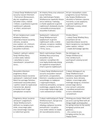 Z okazji Świąt Wielkanocnych życzymy naszym Klientom i Partnerom Biznesowym, aby ten wyjątkowy czas był pełen wiary, nadziei i miłości, a spotkania w gronie najbliższych upływały w miłym, wiosennym nastroju. W imieniu firmy oraz własnym życzę Państwu, aby nadchodzące Święta Wielkanocne napełniły Wasze serca radością i nadzieją, a chwile spędzone w gronie najbliższych dodawały otuchy i pozwalały przezwyciężyć wszystkie trudności. W tym niezwykłym czasie pragniemy życzyć Państwu, aby Święta Wielkanocne obudziły w Państwu uśpione marzenia, a czas spędzony w gronie najbliższych obfitował w wiarę, miłość i nadzieję. W tym świątecznym czasie składamy Państwu najserdeczniejsze życzenia, zdrowia, szczęścia oraz nadziei i sił, z którymi bez problemu pokonacie wszystkie trudności. Spokojnych i radosnych Świąt Wielkanocnych spędzonych w gronie najbliższych osób, a także zdrowia, szczęścia i wielkiej radości, w imieniu swoim i firmy, życzy... Drodzy Klienci, z okazji Świąt Wielkiej Nocy przyjmijcie od nas najserdeczniejsze życzenia. Niech świąteczny czas będzie pełen radości, miłości i ciepła domowego ogniska. Ciepłych i pełnych radości Świąt Wielkiej Nocy, a także wielu radości i satysfakcji w życiu zawodowym i prywatnym życzy… Niech nadchodzące Święta Wielkiej Nocy przyniosą wszystkim same radosne i szczęśliwe dni oraz będą doskonałą okazją do spędzenia wspaniałych chwil w gronie najbliższych. Na zbliżające się Święta Wielkanocne moc serdecznych, pachnących wiosną życzeń przesyła… Wszystkim Klientom pragniemy złożyć najserdeczniejsze życzenia: spokojnych i radosnych świąt. Niech los pomaga Państwu zrealizować wszystkie plany i spełnić nawet te najskrytsze marzenia tak, abyście w każdej chwili mogli odnajdywać szczęście. Z okazji Świąt Wielkanocnych życzymy wszystkim naszym partnerom, przyjaciołom, klientom i współpracownikom, wszystkiego co najlepsze i najprzyjemniejsze, rodzinnej atmosfery, szczęścia osobistego, pogody ducha, smacznego święconego jajka i suto zastawionych stołów. Z okazji zbliżających się Świąt Wielkanocnych składamy najserdeczniejsze życzenia: dużo zdrowia, radości, smacznego jajka, mokrego dyngusa, mnóstwo wiosennego słońca oraz samych sukcesów i wszelkiej pomyślności w życiu zawodowym i prywatnym. Pragniemy złożyć życzenia zdrowych i pogodnych Świąt Wielkanocnych, obfitości na świątecznym stole, smacznego jajka oraz wiosennego nastroju w rodzinnym gronie. Z okazji nadchodzących Świąt Wielkanocnych, Zarząd oraz Pracownicy firmy… składają najlepsze życzenia pomyślności i szczęścia oraz wiele radości w ciepłe dni wyczekiwanej wiosny. Wishing you Easter filled with joy and a spring filled with all things bright and beautiful. As spring comes to the world, bringing sunshine and gladness… …this comes to you bringing wishes for joy. Happy Easter