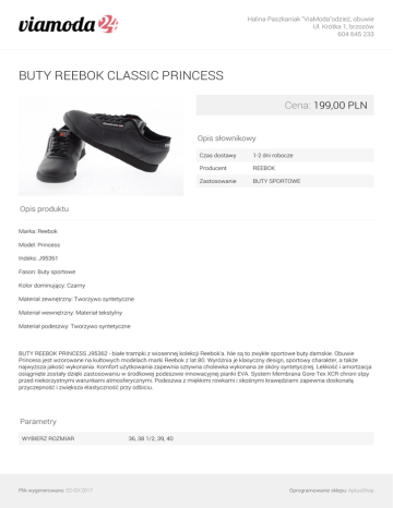 Halina Paszkaniak "ViaModa"odzież, obuwie Ul. Krótka 1, brzozów 604 645 233 BUTY REEBOK CLASSIC PRINCESS Cena: 199,00 PLN Opis słownikowy Czas dostawy 1-2 dni robocze Producent REEBOK Zastosowanie BUTY SPORTOWE Opis produktu Marka: Reebok Model: Princess Indeks: J95361 Fason: Buty sportowe Kolor dominujący: Czarny Materiał zewnętrzny: Tworzywo syntetyczne Materiał wewnętrzny: Materiał tekstylny Materiał podeszwy: Tworzywo syntetyczne BUTY REEBOK PRINCESS J95362 - białe trampki z wiosennej kolekcji Reebok’a. Nie są to zwykłe sportowe buty damskie. Obuwie Princess jest wzorowane na kultowych modelach marki Reebok z lat 80. Wyróżnia je klasyczny design, sportowy charakter, a także najwyższa jakość wykonania. Komfort użytkowania zapewnia sztywna cholewka wykonana ze skóry syntetycznej. Lekkość i amortzacja osiągnięte zostały dzięki zastosowaniu w środkowej podeszwie innowacyjnej pianki EVA. System Membrana Gore-Tex XCR chroni stpy przed niekorzystnymi warunkami atmosferycznymi. Podeszwa z miękkimi rowkami i skośnymi krawędziami zapewnia doskonałą przyczepność i zwiększa elastyczność przy odbiciu. Parametry WYBIERZ ROZMIAR Plik wygenerowano: 02-03-2017 36, 38 1/2, 39, 40 Oprogramowanie sklepu: AptusShop Halina Paszkaniak "ViaModa"odzież, obuwie Ul. Krótka 1, brzozów 604 645 233 Galeria Plik wygenerowano: 02-03-2017 Powered by TCPDF (www.tcpdf.org) Oprogramowanie sklepu: AptusShop
