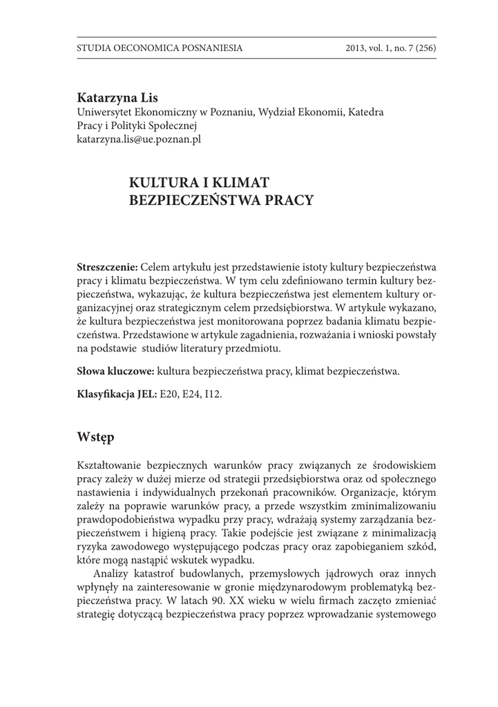 STUDIA OECONOMICA POSNANIESIA 2013, vol. 1, no. 7 (256) Katarzyna Lis Uniwersytet Ekonomiczny w Poznaniu, Wydział Ekonomii, Katedra Pracy i Polityki Społecznej [email protected] KULTURA I KLIMAT BEZPIECZEŃSTWA PRACY Streszczenie: Celem artykułu jest przedstawienie istoty kultury bezpieczeństwa pracy i klimatu bezpieczeństwa. W tym celu zdefiniowano termin kultury bezpieczeństwa, wykazując, że kultura bezpieczeństwa jest elementem kultury organizacyjnej oraz strategicznym celem przedsiębiorstwa. W artykule wykazano, że kultura bezpieczeństwa jest monitorowana poprzez badania klimatu bezpieczeństwa. Przedstawione w artykule zagadnienia, rozważania i wnioski powstały na podstawie studiów literatury przedmiotu. Słowa kluczowe: kultura bezpieczeństwa pracy, klimat bezpieczeństwa. Klasyfikacja JEL: E20, E24, I12. Wstęp Kształtowanie bezpiecznych warunków pracy związanych ze środowiskiem pracy zależy w dużej mierze od strategii przedsiębiorstwa oraz od społecznego nastawienia i indywidualnych przekonań pracowników. Organizacje, którym zależy na poprawie warunków pracy, a przede wszystkim zminimalizowaniu prawdopodobieństwa wypadku przy pracy, wdrażają systemy zarządzania bezpieczeństwem i higieną pracy. Takie podejście jest związane z minimalizacją ryzyka zawodowego występującego podczas pracy oraz zapobieganiem szkód, które mogą nastąpić wskutek wypadku. Analizy katastrof budowlanych, przemysłowych jądrowych oraz innych wpłynęły na zainteresowanie w gronie międzynarodowym problematyką bezpieczeństwa pracy. W latach 90. XX wieku w wielu firmach zaczęto zmieniać strategię dotyczącą bezpieczeństwa pracy poprzez wprowadzanie systemowego 8 Katarzyna Lis podejścia umożliwiającego normalizację systemów zarządzania bezpieczeństwem i higieną pracy. Rozwój koncepcji systemowego zarządzania bhp wpłynął na zmniejszenie wypadków i chorób zawodowych oraz na zaangażowanie pracowników. Ponadto zaczęto prowadzić badania elementów wpływających na poprawę bezpieczeństwa pracy, a zbiór tych elementów nazwano kulturą bezpieczeństwa pracy. Natomiast najważniejszym elementem pomiaru kultury bezpieczeństwa pracy stał się klimat bezpieczeństwa. 1. Kultury bezpieczeństwa pracy Klasycznie analizując wypadki przy pracy w organizacji, dokonuje się rozpoznania ich przyczyn, które klasyfikuje się jako przyczyny techniczne, organizacyjne lub ludzkie. Jednak nie zawsze można tak jednoznacznie zakwalifikować wypadek i uzależnić go od jednego z powyższych elementów, czasami przyczyną wypadku jest zespół kilku elementów. Obecne trendy dotyczące identyfikacji przyczyn wypadków zwracają się w kierunku pomiaru kultury bezpieczeństwa pracy. W literaturze po raz pierwszy interpretacje zależności prawdopodobieństwa wypadku do kultury bezpieczeństwa przedstawił Pidgeon [1991]. Być może inspiracją takiej analizy był przedstawiony w 1986 roku raport Agencji Energii Atomowej podsumowujący wypadek w elektrowni atomowej w Czarnobylu. W raporcie tym kulturę bezpieczeństwa interpretowano jako zespół cech i postaw jednostek i organizacji. Od tego czasu zaczęto zwracać uwagę na powyższą zależność, np. w pracy Lee [2000] zostały zanalizowane następujące zdarzenia: wypadek w elektrowni atomowej w Czarnobylu (1986), pożar na stacji metra w Londynie (1987), zatonięcie promu pasażerskiego Herald of Free Enterprise (1987) oraz wypadek na platformie wydobywczej Piper Alpha na Morzu Północnym (1988). Próby zdefiniowania kultury bezpieczeństwa przez wielu autorów przyczyniły się do doprecyzowania tego terminu, a w konsekwencji stworzenia sposobów operacjonalizacji tego problemu. Jedną z definicji zaproponował Geller [1996], przedstawiając kulturę bezpieczeństwa w przedsiębiorstwie jako element kształtowania poprzez zaangażowanie wszystkich pracowników, pracę w grupach i poczucie przynależności do firmy oraz właściwą edukację. Szczególną uwagę, według niego, należy zwrócić na trzy elementy: – środowisko fizyczne pracy (narzędzia, maszyny, organizacja stanowisk pracy), – zachowania pracowników (przestrzeganie przepisów bhp, przekazywanie informacji i współpraca, demonstrowanie troski o bezpieczeństwo wykraczającej poza obowiązki), – cechy wewnętrzne pracowników (wiedza, umiejętności, motywacja). Kultura i klimat bezpieczeństwa pracy 9 Ocena powyższych elementów umożliwia interpretację określonej kultury bezpieczeństwa w przedsiębiorstwie. W roku 1997 Health & Safety Executive (HSE), angielski instytut zajmujący się problematyką bezpieczeństwa pracy, zaproponował analizowanie kultury bezpieczeństwa jako „indywidualnych i grupowych wartości, postawy, umiejętności oraz norm postępowania, które wpływają na styl, jakość i skuteczność zarządzania bezpieczeństwem i higieną pracy w przedsiębiorstwie”. Rok później Kennedy i Kirwan [1998] przedstawili kulturę bezpieczeństwa jako subelement ogólnej kultury organizacyjnej, która jest wynikiem połączenia indywidualnych i grupowych procesów myślowych, uczuć i zachowań, które z kolei wywołują szczególny sposób patrzenia na różne sprawy w organizacji. Natomiast Hale odniósł się do definiowania tego terminu, konkretnie skupiając się na ryzyku. Według niego kultura bezpieczeństwa pracy to „postawy, przekonania i poglądy podzielane przez grupę jako naturalne normy i wartości, które określają sposób działania i reagowania w odniesieniu do ryzyka i kontroli ryzyka” [Hale 2000]. Kolejną próbę definiowania powyższego terminu podjęli Glendon i Stanton [2000], proponując zestawienie postaw, zachowań, norm i wartości oraz osobistej odpowiedzialności, jak również zasobów ludzkich cech, takich jak szkolenia i rozwój. Taka interpretacja kultury bezpieczeństwa ukierunkowała ją w kierunku zarządzania zasobami ludzkimi. W nurcie łączenia kultury bezpieczeń