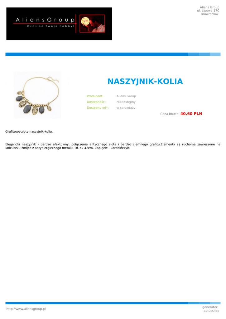 Aliens Group ul. Lipowa 17C Inowrocław NASZYJNIK-KOLIA Producent: Aliens Group Dostępność: Niedostępny Dostępny od*: w sprzedaży Cena brutto: 40,60 PLN Grafitowo-złoty naszyjnik-kolia. Elegancki naszyjnik - bardzo efektowny, połączenie antycznego złota i bardzo ciemnego grafitu.Elementy są ruchome zawieszone na łańcuszku-żmijce z antyalergicznego metalu. Dł. ok 42cm. Zapięcie - karabińczyk. http://www.aliensgroup.pl generator: aptusshop
