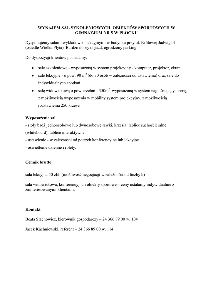 WYNAJEM SAL SZKOLENIOWYCH, OBIEKTÓW SPORTOWYCH W GIMNAZJUM NR 5 W PŁOCKU Dysponujemy salami wykładowo - lekcyjnymi w budynku przy ul. Królowej Jadwigi 4 (osiedle Wielka Płyta). Bardzo dobry dojazd, ogrodzony parking. Do dyspozycji klientów posiadamy: salę szkoleniową - wyposażoną w system projekcyjny - komputer, projektor, ekran sale lekcyjne - o pow. 90 m2 (do 30 osób w zależności od ustawienia) oraz sale do indywidualnych spotkań salę widowiskową o powierzchni - 350m2 wyposażoną w system nagłaśniający, scenę, z możliwością wyposażenia w mobilny system projekcyjny, z możliwością rozstawienia 250 krzeseł Wyposażenie sal - stoły bądź jednoosobowe lub dwuosobowe ławki, krzesła, tablice suchościeralne (whiteboard), tablice interaktywne - ustawienie - w zależności od potrzeb konferencyjne lub lekcyjne - oświetlenie dzienne i rolety. Cennik brutto sala lekcyjna 50 zł/h (możliwość negocjacji w zależności od liczby h) sala widowiskowa, konferencyjna i obiekty sportowe – ceny ustalamy indywidualnie z zainteresowanymi klientami. Kontakt Beata Stachowicz, kierownik gospodarczy – 24 366 89 00 w. 104 Jacek Kachniewski, referent – 24 366 89 00 w. 114