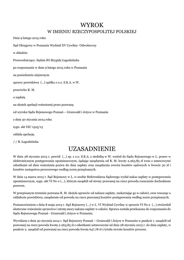 WYROK W IMIENIU RZECZYPOSPOLITEJ POLSKIEJ Dnia 9 lutego 2015 roku Sąd Okręgowy w Poznaniu Wydział XV Cywilny- Odwoławczy w składzie: Przewodniczący: Sędzia SO Brygida Łagodzińska po rozpoznaniu w dniu 9 lutego 2015 roku w Poznaniu na posiedzeniu niejawnym sprawy powództwa (...) spółka z o.o. S.K.A. w W. przeciwko R. M. o zapłatę na skutek apelacji wniesionej przez pozwaną od wyroku Sądu Rejonowego Poznań – Grunwald i Jeżyce w Poznaniu z dnia 30 stycznia 2014 roku sygn. akt IXC 1525/13 oddala apelację. /-/ B. Łagodzińska UZASADNIENIE W dniu 28 stycznia 2013 r. powód (...) sp. z o.o. S.K.A. z siedzibą w W. wniósł do Sądu Rejonowego w L. pozew w elektronicznym postępowaniu upominawczym, żądając zasądzenia od R. M. kwoty 2.263,85 zł wraz z ustawowymi odsetkami od dnia wniesienia pozwu do dnia zapłaty oraz zasądzenia zwrotu kosztów sądowych w kwocie 30 zł i kosztów zastępstwa procesowego według norm przepisanych. W dniu 14 marca 2013 r. Sąd Rejonowy w L. w osobie Referendarza Sądowego wydał nakaz zapłaty w postępowaniu upominawczym, sygn. akt VI Nc-e (...), którym zasądził od strony pozwanej na rzecz powoda roszczenie dochodzone pozwem. W przepisanym terminie pozwana R. M. złożyła sprzeciw od nakazu zapłaty, zaskarżając go w całości, oraz wnosząc o oddalenie powództwa, zasądzenie od powoda na rzecz pozwanej kosztów postępowania według norm przepisanych. Postanowieniem z dnia 8 maja 2013 r. Sąd Rejonowy (...) w L. VI Wydział Cywilny w sprawie VI Nc-e (...) stwierdził skuteczne wniesienie sprzeciwu i utratę mocy nakazu zapłaty w całości. Sprawa została przekazana do rozpoznania do Sądu Rejonowego Poznań - Grunwald i Jeżyce w Poznaniu. Wyrokiem z dnia 30 stycznia 2014 r. Sąd Rejonowy Poznań – Grunwald i Jeżyce w Poznaniu w punkcie 1. zasądził od pozwanej na rzecz powoda kwotę 2.263,85 zł z odsetkami ustawowymi od dnia 28 stycznia 2013 r. do dnia zapłaty, w punkcie 2. zasądził od pozwanej na rzecz powoda kwotę 647,78 zł z tytułu zwrotu kosztów procesu. Apelację od powyższego rozstrzygnięcia wniosła pozwana zaskarżając wyrok w części, tj. ponad kwotę 1.020,14 zł. Zaskarżonemu wyrokowi pozwana zarzuciła: 1. naruszenie przepisów prawa materialnego poprzez błędną jego wykładnię i niewłaściwe zastosowanie, w szczególności: • art. 15 ust. 1 zd. 1 ustawy o kredycie konsumenckim z dnia 20 lipca 2001 r. w zw. z art. 4 ust.2 tejże ustawy poprzez zasądzenie od pozwanej R. M. na rzecz powódki (...) spółka z ograniczoną odpowiedzialnością spółka komandytowo-akcyjna w W. kwoty 2.263,85 zł z odsetkami ustawowymi od dnia 28.01.2013 r. do dnia zapłaty podczas kiedy pozwana jest zobowiązana jedynie spłaty pożyczki bez oprocentowania i innych kosztów należnych kredytodawcy, co po dokonaniu potrącenia daje kwotę 1.020,14 zł, • art. 4 ust.2 o kredycie konsumenckim z dnia 20 lipca 2001 r. w zw. z art. 65 k.c. poprzez błędną wykładnię oświadczeń woli stron- umowy kredytu gotówkowego nr (...) poprzez zasądzenie od pozwanej R. M. na rzecz powódki (...) spółka z ograniczoną odpowiedzialnością spółka komandytowo-akcyjna w W. kwoty 2263,85 zł z odsetkami ustawowymi od dnia 28.01.2013 r. do dnia zapłaty podczas kiedy pozwana jest zobowiązana jedynie spłaty pożyczki bez oprocentowania i innych kosztów należnych kredytodawcy, co po dokonaniu potrącenia daje kwotę 1020,14 zł z uwagi na naruszenia przez pożyczkodawcę przepisów ustawy o kredycie konsumenckim, 2. naruszenie przepisów prawa procesowego, które miało wpływ na treść zaskarżonego rozstrzygnięcia, a w szczególności art. 233 § 1 k.p.c. w zw. art. 299 k.p.c. poprzez przekroczenie przez Sąd granic zasady swobodnej oceny materiału dowodowego w ten sposób, że Sąd wydał wyrok bez należytego wszechstronnego rozważenia materiału dowodowego, nie rozpoznał materiału dowodowego jako całości lecz rozłącznie, w tym pozostawienie pewnego marginesu braku dania wiary zeznaniom pozwanej w zakresie podnoszonej przez pozwaną oceny prawnej relacjonowanych okoliczności faktycznych, która w żadnej mierze nie wiązała Sądu podczas kiedy pozwana złożyła oświadczenie o skorzystaniu z sankcji kredytu darmowego, 3. niezgodność ustaleń dokonanych przez Sąd Rejonowy z zebranym w sprawie materiałem dowodowym, polegających na ustaleniu, że pozwana uiściła na rzecz powoda kwotę 2.029,98 zł podczas kiedy z zebranego w sprawie materiału dowodowego wynika, że pozwana uiściła kwotę 2.199,96 zł. Mając powyższe na uwadze pozwana wniosła o zmianę zaskarżonego wyroku poprzez oddalenie powództwa w części dotyczącej kwoty 1.243,71 zł ponad kwotę 1.020,14 zł oraz zasądzenie od powódki na rzecz pozwanej kosztów procesu wraz z kosztami postępowania apelacyjnego według norm przepisanych, ewentualnie uchylenie zaskarżonego wyroku w całości i przekazanie sprawy do ponownego rozpoznania Sądowi I instancji oraz zasądzenie od pozwanej na rzecz powódki kosztów procesu wraz z kosztami postępowania apelacyjnego według norm przepisanych i dopuszczenie i przeprowadzenie dowodu z dokumentu – oświadczenia pozwanej z dnia 28 stycznia 2014 roku wraz z załącznikiem i potwierdzeniem nadania i odbioru. Sąd Okręgowy zważył, co następuje: Apelacja okazała się bezzasadna. Na wstępie zauważyć należy, iż na podstawie art. 505(11) k.p.c. Sąd odwoławczy dopuścił dowód z dokumentu tj. oświadczenia pozwanej z dnia 28 stycznia 2014 roku wraz z załącznikiem i dowodem nadania. Było to nowy dokument, którego pozwana nie mogła przedłożyć przed Sądem Rejonowym. Nie są zasadne zarzuty apelacji dotyczące dokonania przez Sąd Rejonowy błędnej oceny dowodów. Sąd Najwyższy wielokrotnie zwracał uwagę, że zgłoszenie zarzutu obrazy art. 233 § 1 k.p.c. nie może polegać na zaprezentowaniu przez skarżącego stanu faktycznego przyjętego przez niego na podstawie własnej