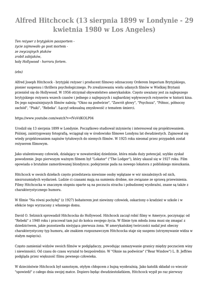 "spowiedź" z całego dnia swojej matce. Dopiero będąc dwudziestolatkiem, Hitchcock wypił po raz pierwszy