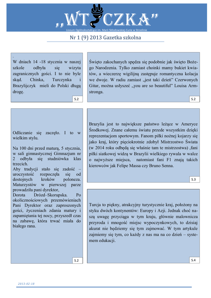 ,,WT CZKA” Liceum Ogólnokształcące im. Marii Skłodowskiej-Curie w Strzelinie Nr 1 (9) 2013 Gazetka szkolna . W dniach 14 -18 stycznia w naszej szkole odbyła się wizyta zagranicznych gości. I to nie byle skąd. Chinka, Turczynka i Brazylijczyk mieli do Polski długą drogę. S.2 Odliczanie się zaczęło. I to w wielkim stylu. Na 100 dni przed maturą, 5 stycznia, w sali gimnastycznej Gimnazjum nr 2 odbyła się studniówka klas trzecich. Aby tradycji stało się zadość – uroczystość rozpoczęła się od dostojnych kroków poloneza. Maturzystów w pierwszej parze prowadziła pani dyrektor, Dorota Drózd–Skorupska. Po okolicznościowych przemówieniach Pani Dyrektor oraz zaproszonych gości, życzeniach zdania matury i zapamiętania tej nocy, przyszedł czas na zabawę, która trwać miała do białego rana. S.2 2013-02-18 Święto zakochanych spędza się podobnie jak święto Bożego Narodzenia. Tylko zamiast choinki mamy bukiet kwiatów, a wieczerzę wigilijną zastępuje romantyczna kolacja we dwoje. W radiu zamiast „jest taki dzień” Czerwonych Gitar, można usłyszeć „you are so beautiful” Louisa Armstronga. S.2 Brazylia jest to największe państwo leżące w Ameryce Środkowej. Znane całemu światu przede wszystkim dzięki reprezentacjom sportowym. Fanom piłki nożnej kojarzy się jako kraj, który pięciokrotnie zdobył Mistrzostwo Świata (w 2014 roku odbędą się właśnie tam te mistrzostwa) ,fani piłki siatkowej widzą w Brazylii wielkiego rywala w walce o najwyższe miejsca, natomiast fani F1 znają takich kierowców jak Felipe Massa czy Bruno Senna. S.3 Turcja to piękny, atrakcyjny turystycznie kraj, położony na styku dwóch kontynentów: Europy i Azji. Jednak choć naszą uwagę przyciąga w tym kraju, głównie malownicza przyroda i mnogość miejsc wypoczynkowych, to dzisiaj akurat nie będziemy się tym zajmować. W tym artykule zajmiemy się tym, co każdy z nas ma na co dzień – systemem edukacji. S.4 Katarzyna Harhala Studniówka 2013 Odliczanie się zaczęło. I to w wielkim stylu. Na 100 dni przed maturą, 5 stycznia, w Sali gimnastycznej Gimnazjum nr 2 odbyła się Studniówka klas trzecich. Aby tradycji stało się zadość – uroczystość rozpoczęła się od dostojnych kroków poloneza. Maturzystów w pierwszej parze prowadziła pani dyrektor, Dorota Drózd–Skorupska. Po okolicznościowych przemówieniach pani dyrektor oraz zaproszonych gości, życzeniach zdania matury i zapamiętania tej nocy, przyszedł czas na zabawę, która trwać miała do białego rana. Zabawa – trzeba przyznać, była niesamowita! Szalone tańce, dzikie śpiewy, spadające podwiązki. Jednym słowem – działo się. W końcu ma to być „ostatnie szaleństwo przed maturą”. Na parkiecie mieniły się wspaniałe kreacje i eleganckie garnitury, a wystrój sali i własnoręcznie wykonany przez uczniów napis STUDNIÓWKA 2013 tworzyły niezapomniany klimat. W wielu z nas budziły się skrywane przez lata talenty taneczne. Nie ma wątpliwości, że nadrobiliśmy szalonymi tańcami wszystkie opuszczone lekcje wychowania fizycznego. Przy dźwiękach orkiestry parkiet był pełen ludzi. Bawili się wszyscy – uczniowie i nauczyciele. Nie obyło się bez dedykacji i podziękowań kierowanych do nauczycieli i wychowawców za 3 lata ciężkiej pracy, które przecież dobiegają już końca. W przerwie na złapanie oddechu, pomiędzy jednym „Ona tańczy dla mnie” a drugim, wyświetlone zostały filmy maturzystów, nakręcone specjalnie na tę okazję. Mogliśmy zobaczyć typowy dzień z życia każdego profilu klasy, a także posłuchać wspomnień tegorocznych abiturientów. Jedno jest pewne - ten wieczór skończył się zdecydowanie za szybko! I nawet nie możemy mieć nadziei, że coś takiego jeszcze się powtórzy! Bo taka noc zdarza się tylko raz w życiu (zazwyczaj). Zwykło się mawiać : "jaka studniówka, taka matura". Dlatego jeśli wierzyć przesądom – zdamy ją na 100% Katarzyna Harhala 來自波蘭的問候!! (chin. Pozdrowienia Polski) z Młodzi studenci odwiedzili naszą szkołę i przypatrywali się lekcjom, na których mogliśmy porozmawiać z nimi, zadawać pytania, by poznać kulturę ich krajów czy nauczyć się kilku słów w ich języku ( 你好!!!!). Zapytaliśmy ich też, co myślą o Polsce, Polakach i naszej szkole. Wszyscy zgodnie stwierdzili, że jest tu dla nich niestety za zimno. Ludzie są przyjacielscy i zawsze można liczyć na ich pomoc. Spodobała im się także nasza szkoła – jak stwierdzili: dobre warunki do nauki, możliwości rozwijania zainteresowań i mili nauczyciele. Zapytana o różnice między jej szkołą a naszą, Ricky XU – dwudziestolatka z Chin, powiedziała, że w jej kraju to nauczyciele muszą chodzić do różnych klas, podczas gdy uczniowie zajmują jedną i tylko tam mają lekcje. Sinem Kaplan – dwudziestolatka z Turcji stwierdziła, że u niej uczniowie musza Strona: 2 nosić mundurki szkolne, a my tutaj jesteśmy „wolni”. Z kolei Tomas Beck Valdinia – dziewiętnastolatek z Brazylii uważa, że nauczyciele w Polsce są bardziej doceniani w swoim kraju, niż brazylijscy nauczyciele u siebie. Jednak co najbardziej ich zachwyciło? Polskie jedzenie. Ricky przyznała, że kocha pierogi, Tomas uwielbia gołąbki, a Sinem stwierdziła, że nie zjadła tutaj niczego, co by jej nie smakowało. Pozostajemy z nimi w kontakcie i liczymy na kolejne spotkanie. Malwina MACIKIEWICZ Ach, ten czternasty ! Święto zakochanych spędza się podobnie jak święto Bożego Narodzenia. Tylko zamiast choinki mamy bukiet kwiatów, a wieczerzę wigilijną zastępuje romantyczna kolacja we dwoje. W radiu zamiast „jest taki dzień” Czerwonych Gitar, można usłyszeć „you are so beautiful” Louisa Armstronga. Taka mała rozbieżność kategoryczna. Jedyne, co nie jest naznaczone szczególnym kontrastowaniem to prezenty. Dzisiaj pierścionek zaręczynowy można zarówno otrzymać w Walentynki, j