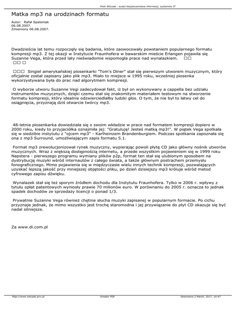 Piotr Witczak - audyt bezpieczenstwa informacji, systemów IT Matka mp3 na urodzinach formatu Autor: Rafał Spaleniak 06.08.2007. Zmieniony 06.08.2007. Dwadzieścia lat temu rozpoczęły się badania, które zaowocowały powstaniem popularnego formatu kompresji mp3. Z tej okazji w Instytucie Fraunhofera w bawarskim mieście Erlangen pojawiła się Suzanne Vega, która przed laty nieświadomie wspomogła prace nad wynalazkiem. Singiel amerykańskiej piosenkarki "Tom's Diner" stał się pierwszym utworem muzycznym, który oficjalnie został zapisany jako plik mp3. Miało to miejsce w 1995 roku, wcześniej piosenka wykorzystywana była do prac nad algorytmem kompresji. O wyborze utworu Suzanne Vegi zadecydował fakt, iż był on wykonywany a cappella bez udziału instrumentów muzycznych, dzięki czemu stał się znakomitym materiałem testowym na stworzenie formatu kompresji, który idealnie odzwierciedlałby ludzki głos. O tym, że nie był to łatwy cel do osiągnięcia, przyznają dziś otwarcie twórcy mp3. 48-letnia piosenkarka dowiedziała się o swoim wkładzie w prace nad formatem kompresji dopiero w 2000 roku, kiedy to przyjaciółka oznajmiła jej: "Gratuluję! Jesteś matką mp3!". W piątek Vega spotkała się w siedzibie instytutu z "ojcem mp3" - Karlheinzem Brandenburgiem. Podczas spotkania zapoznała się ona z mp3 Surround, umożliwiającym zapis formatu 5.1. Format mp3 zrewolucjonizował rynek muzyczny, wypierając powoli płytę CD jako główny nośnik utworów muzycznych. Wraz z większą dostępnością internetu, a przede wszystkim pojawieniem się w 1999 roku Napstera - pierwszego programu wymiany plików p2p, format ten stał się ulubionym sposobem na dystrybucję muzyki wśród internautów z całego świata, a także głównym postrachem przemysłu fonograficznego. Mimo pojawienia się w międzyczasie wielu innych technik kompresji, pozwalających uzyskać lepszą jakość przy mniejszej objętości pliku, po dzień dzisiejszy mp3 króluje wśród metod cyfrowego zapisu dźwięku. Wynalazek stał się też sporym źródłem dochodu dla Instytutu Fraunhofera. Tylko w 2006 r. wpływy z tytułu opłat patentowych wyniosły prawie 70 milionów euro. W porównaniu do 2005 r. oznacza to jednak spadek dochodów ze sprzedaży licencji o ponad 1/3. Prywatnie Suzanne Vega również chętnie słucha muzyki zapisanej w popularnym formacie. Po cichu przyznaje jednak, że mimo wszystko jest trochę staromodna i jej przywiązanie do płyt CD okazuje się być nadal silniejsze. Za www.di.com.pl http://www.witczak.priv.pl Kreator PDF Utworzono 2 March, 2017, 14:47