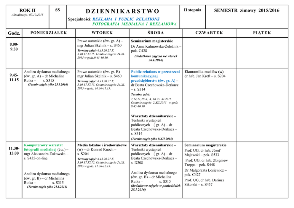 ROK II SS DZIENNIKARSTWO Aktualizacja: 07.10.2015 II stopnia SEMESTR zimowy 2015/2016 Specjalności: REKLAMA I PUBLIC RELATIONS FOTOGRAFIA MEDIALNA I REKLAMOWA Godz. PONIEDZIAŁEK Prawo autorskie (ćw. gr. A) – mgr Julian Skelnik – s. S460 8.009.30 9.4511.15 WTOREK Terminy zajęć: 6,13,20,27.X, 3,10,17.XI.15. Ostatnie zajęcia 24.XI. 2015 w godz.9.45-10.30. Analiza dyskursu medialnego (ćw. gr. A) – dr Michalina Rutka – s. S315 (Termin zajęć: tylko 25.I.2016) Prawo autorskie (ćw. gr. B) – mgr Julian Skelnik – s. S460 Terminy zajęć: 6,13,20,27.X, 3,10,17.XI.15. Ostatnie zajęcia 24.XI. 2015 w godz. 10.30-11.15. ŚRODA CZWARTEK Seminarium magisterskie Dr Anna Kalinowska-Żeleźnik – pok. C428 (dodatkowo zajęcia we wtorek 26.I.2016) Public relations w przestrzeni komunikacyjnej przedsiębiorstw (ćw. gr. A) – dr Beata Czechowska-Derkacz – s. S314 Ekonomika mediów (w) – dr hab. Jan Kreft – s. S204 Terminy zajęć: 7,14,21,28.X, 4, 18,25. XI.2015 Ostatnie zajęcia 2.XII.2015 w godz. 9.45-10.30. Warsztaty dziennikarskie – Techniki wystąpień publicznych ( gr. A) – dr Beata Czechowska-Derkacz – s. S314 (Termin zajęć: tylko 9.XII.2015) 11.3013.00 Komputerowy warsztat fotografii medialnej (ćw.) – mgr Aleksandra Żukowska – s. S435-on-line. Analiza dyskursu medialnego (ćw. gr. B) – dr Michalina Rutka – s. S315 (Termin zajęć: tylko 25.I.2016) Media lokalne i środowiskowe (w) – dr Konrad Knoch – s. S204 Terminy zajęć: 6,13,20,27.X, 3,10,17.XI.15. Ostatnie zajęcia 24.XI. 2015 w godz. 11.30-12.15. Warsztaty dziennikarskie – Techniki wystąpień publicznych ( gr. A) – dr Beata Czechowska-Derkacz – s. D208 Analiza dyskursu medialnego (ćw. gr. B) – dr Michalina Rutka – s. S315 (dodatkowo zajęcia w poniedziałek 25.I.2016) Seminarium magisterskie Prof. UG, dr hab. Józef Majewski – pok. S533 Prof. UG, dr hab. Zbigniew Treppa – pok. S448 Dr Małgorzata Łosiewicz – pok. C427 Prof. UG, dr hab. Dariusz Sikorski – s. S457 PIĄTEK 13.1514.45 Fotografia reklamowa (ćw.) – prof. UG, dr hab. Zbigniew Treppa – s. D301 WYKŁAD MONOGRAFICZNY Film dokumentalny – prof. UG, dr hab. Mirosław Przylipiak – s. D302 Warsztaty dziennikarskie – Techniki wystąpień publicznych ( gr. B) – dr Beata Czechowska-Derkacz – s. D208 Analiza dyskursu medialnego (ćw. gr. A) – dr Michalina Rutka – s. S315 (dodatkowo zajęcia w poniedziałek 25.I.2016) 15.0016.30 Podstawy fotograficznej perswazji wizualnej (ćw.) – prof. UG, dr hab. Zbigniew Treppa – s. D301 Copywriting (ćw. gr. A) – dr Anna Ryłko-Kurpiewska – s. S460 Terminy zajęć: 5,12,19,26. X, 2,9,16,23,30. XI, 7. XII.2015. Metodyka tworzenia tekstów i materiałów PR (ćw. gr. B) mgr Magdalena Iwanowska – s. S312 Terminy zajęć: 5,12,19,26. X, 2,9,16.XI.15. Ostatnie zajęcia 23.XI.15 w godz. 15.45-16.30. WYKŁAD FAKULTATYWNY (rok I+II MSU) Kultura popularna – dr Grzegorz Kapuściński – s. C213-C214 Fotografia prasowa narzędziem politycznej perswazji – dr Jacek Wojsław – s. S207 Debaty polityczne – dr Jan Miklas-Frankowski – s. C211C212 Copywriting (ćw. gr. B) – dr Anna Ryłko-Kurpiewska – s. S460 Terminy zajęć: 5,12,19,26. X, 2,9,16,23,30. XI, 7. XII.2015. Metodyka tworzenia tekstów i materiałów PR (ćw. gr. A) mgr Magdalena Iwanowska – s. S312 Terminy zajęć: 7,14,21,28.X, 4, 18,25. XI.2015 Ostatnie zajęcia 2.XII.2015 w godz. 15.00-15.45. Warsztaty dziennikarskie – Techniki wystąpień publicznych ( gr. B) – dr Beata Czechowska-Derkacz – s. S314 (Termin zajęć: tylko 9.XII.2015) Seminarium magisterskie Dr Anna Kalinowska-Żeleźnik – pok. C428 Termin seminarium: tylko 26.I.2016 16.4518.15 Public relations w przestrzeni komunikacyjnej przedsiębiorstw (ćw. gr. B) – dr Beata Czechowska-Derkacz – s. S314 WYKŁAD MONOGRAFICZNY Komunikowanie społeczne kampanii. Kampanie społeczne wobec zmiany.- dr Anna Lusińska – s. S316 Terminy zajęć: 5,12,19,26. X, 2,9,16.XI.15. Ostatnie zajęcia 23.XI.15 w godz. 16.30-17.15. 18.3020.00 + Poniedziałkowe zajęcia kończą się 18.I.2016r. Konieczny dodatkowy termin realizacji zajęć dydaktycznych przypadających w środę. Sugerowany poniedziałek 25.I.2016 lub wtorek 26.I.2016. Terminy wpisane na planie. + Wtorkowe zajęcia kończą się 19.I.2016r. – Konieczny dodatkowy termin realizacji zajęć dydaktycznych przypadających w piątek. Sugerowany poniedziałek 25.I.2016 lub wtorek 26.I.2016. Terminy wpisane na planie.
