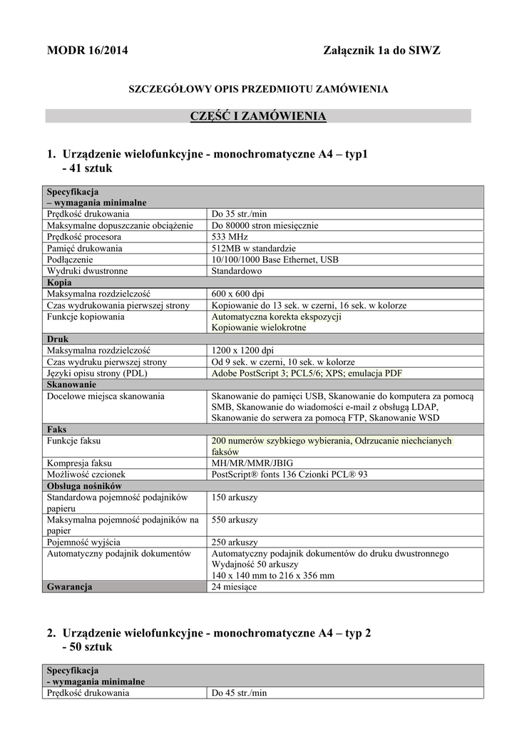 Załącznik 1a do SIWZ MODR 16/2014 SZCZEGÓŁOWY OPIS PRZEDMIOTU ZAMÓWIENIA CZĘŚĆ I ZAMÓWIENIA 1. Urządzenie wielofunkcyjne - monochromatyczne A4 – typ1 - 41 sztuk Specyfikacja – wymagania minimalne Prędkość drukowania Maksymalne dopuszczanie obciążenie Prędkość procesora Pamięć drukowania Podłączenie Wydruki dwustronne Kopia Maksymalna rozdzielczość Czas wydrukowania pierwszej strony Funkcje kopiowania Druk Maksymalna rozdzielczość Czas wydruku pierwszej strony Języki opisu strony (PDL) Skanowanie Docelowe miejsca skanowania Faks Funkcje faksu Kompresja faksu Możliwość czcionek Obsługa nośników Standardowa pojemność podajników papieru Maksymalna pojemność podajników na papier Pojemność wyjścia Automatyczny podajnik dokumentów Gwarancja Do 35 str./min Do 80000 stron miesięcznie 533 MHz 512MB w standardzie 10/100/1000 Base Ethernet, USB Standardowo 600 x 600 dpi Kopiowanie do 13 sek. w czerni, 16 sek. w kolorze Automatyczna korekta ekspozycji Kopiowanie wielokrotne 1200 x 1200 dpi Od 9 sek. w czerni, 10 sek. w kolorze Adobe PostScript 3; PCL5/6; XPS; emulacja PDF Skanowanie do pamięci USB, Skanowanie do komputera za pomocą SMB, Skanowanie do wiadomości e-mail z obsługą LDAP, Skanowanie do serwera za pomocą FTP, Skanowanie WSD 200 numerów szybkiego wybierania, Odrzucanie niechcianych faksów MH/MR/MMR/JBIG PostScript® fonts 136 Czionki PCL® 93 150 arkuszy 550 arkuszy 250 arkuszy Automatyczny podajnik dokumentów do druku dwustronnego Wydajność 50 arkuszy 140 x 140 mm to 216 x 356 mm 24 miesiące 2. Urządzenie wielofunkcyjne - monochromatyczne A4 – typ 2 - 50 sztuk Specyfikacja - wymagania minimalne Prędkość drukowania Do 45 str./min Maksymalne dopuszczanie obciążenie Prędkość procesora Pamięć drukowania Podłączenie Wydruki dwustronne Kopia Maksymalna rozdzielczość Czas wydrukowania pierwszej strony Funkcje kopiowania Druk Maksymalna rozdzielczość Czas wydruku pierwszej strony Języki opisu strony (PDL) Funkcje drukowania Drukowanie mobilne Skanowanie Docelowe miejsca skanowania Faks Funkcje faksu Kompresja faksu Możliwość czcionek Obsługa nośników Standardowa pojemność podajników papieru Maksymalna pojemność podajników na papier Pojemność wyjścia Automatyczny podajnik dokumentów Gwarancja Do 110 000 stron miesięcznie 525 MHz 1 GB w standardzie 10/100/1000 Base Ethernet, High-Speed USB Direct Print (opcjonalne: WI-FI) Standardowo 600 x 600 dpi Kopiowanie do 8,5 pt-pt Eliminacja tła, tworzenie pracy, Sterowanie przyciemnieniem, Usuwanie brzegu, kopiowanie dowodów osobistych, N-stron, tryb fotografii, Program Ahead 1200 x 1200 dpi Od 6,5 pt-pt PCL® 5e emulacja, PCL® 6 emulacja, Emulacja PDF, Emulacja PostScript 3 Drukowanie broszur, Układanie, Niestandardowy rozmiar strony, Dopasowanie do strony, N-stron, Drukowanie z pamięci USB, Skalowanie, Zabezpieczone drukowanie, Tryb oszczędzania tonera, Znaki wodne Apple AirPrint, Xereox® PrintBack Skanowanie do pamięci USB, Skanowanie do komputera za pomocą SMB, Skanowanie do wiadomości e-mail z obsługą LDAP, Skanowanie do serwera za pomocą FTP, Skanowanie WSD Książka adresowa, Emisja faksów, Wysyłanie z opóźnieniem, Unikalny dzwonek, Przekazywanie faksów na faks, pocztę e-mail i serwer z/bez lokalnego druku, Blokada spamu, Odpytywanie w celu odbioru, Faks poufny* MH/MR/MMR/JBIG PostScript® fonts 136 Czionki PCL® 93 700 arkuszy 2 350 arkuszy 250 arkuszy Automatyczny podajnik dokumentów do druku dwustronnego Wydajność 60 arkuszy 140 x 140 mm to 216 x 356 mm 24 miesiące 3. Urządzenie wielofunkcyjne - kolorowe A4 - 24 sztuki Specyfikacja Prędkość drukowania Maksymalne dopuszczanie obciążenie Prędkość procesora Pamięć drukowania Podłączenie Wydruki dwustronne Kopia Do 35 str./min Do 80000 stron miesięcznie 600 MHz 256MB w standardzie 10/100/1000 Base Ethernet, USB, Wbudowana karta sieciowa Wi-Fi Standardowo Maksymalna rozdzielczość Czas wydrukowania pierwszej strony Funkcje kopiowania Druk Maksymalna rozdzielczość Czas druku pierwszej strony Języki opisu strony (PDL) Skanowanie Docelowe miejsca skanowania Faks Funkcje faksu Kompresja faksu Szybkość transmisji Obsługa nośników Standardowa pojemność podajników papieru Maksymalna pojemność podajników na papier Pojemność wyjścia Automatyczny podajnik dokumentów Gwarancja 600 x 600 dpi Kopiowanie do 10 sek. Sortowanie Tworzenie broszury Znaki wodne Skalowanie Drukowanie plakatu Dopasowywanie obrazu do strony 600 x 600 dpi 6,5 sek. emulacja PCL 5e i 6; emulacja PostScript 3; emulacja PDF; XPS Skanowanie do pamięci USB, Skanowanie do komputera za pomocą SMB, Skanowanie do wiadomości e-mail z obsługą LDAP, Skanowanie do serwera za pomocą FTP, Skanowanie WSD 200 numerów szybkiego wybierania MH/MR/MMR/JBIG 33,6 50 arkuszy 250 arkuszy 150 arkuszy Automatyczny podajnik dokumentów do druku dwustronnego Wydajność 50 arkuszy 140 x 140 mm to 216 x 356 mm 24 miesiące 4. Oprogramowanie do monitorowania stanu drukarek Funkcje − − − − − − Charakterystyka/Wymagania minimalne Automatyczne wykrywanie oferowanych urządzeń w sieci lokalnej Odczyt danych identyfikujących urządzenia Odczyt stanów liczników oraz poziomów tonerów Powiadamianie drogą e-mail o zdarzeniach polegających na konieczności wymiany toneru oraz cykliczne wysyłanie raportów o stanach liczników poszczególnych maszyn Oprogramowanie ma wysyłać zebrane informacje na podany adres poczty elektronicznej Oprogramowanie ma współdziałać z urządzeniami opisanymi w pkt. 1, 2 i 3 niniejszego załącznika oraz Xerox Work Centre 3315, Xerox Work Centre 6505, Xerox Phaser 3600DN