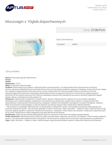 Apteka Avena Królewiecka 12c, Płock +48 502 666 011 Mucovagin x 10glob.dopochwowych Cena: 27,99 PLN Opis słownikowy Producent VERCO Opis produktu Nazwa: Mucovagin globulki dopochwowe Postać: Dawka: Opakowanie: 10 szt. Skład: 5 mg kwasu hialuronowego Działanie: Wspomaga proces gojenia i regeneracji błony śluzowej pochwy. Zmniejsza dyskomfort spowodowany suchością pochwy. Aktywnym składnikiem jest kwas hialuronowy, który jest naturalnym budulcem organizmu ludzkiego. Kwas hialuronowy wiążąc się z wilgotną wydzieliną błony śluzowej pochwy, tworzy na jej powierzchni żelową powłokę. Stanowi ona barierę ochronną zabezpieczającą błonę śluzową i stwarzającą odpowiednie warunki do aktywacji naturalnych mechanizmów regeneracyjnych i obronnych.W ten sposób utworzony film ochronny zapobiega rozwojowi flory patogennej, przywraca naturalną wilgotność, łagodzi obrzęk, ułatwia i przyspiesza procesy gojenia ran. Wskazania: Zalecany jest szczególnie w stanach atrofii i dystrofii. Ułatwia leczenie i gojenie się ran po porodzie, zabiegach ginekologicznych, dystrofii będącej następstwem chemioterapii lub radioterapii. Łagodzi stany zapalne i zmniejsza dyskomfort spowodowany suchością błony śluzowej pochwy związanej z wiekiem lub niedoborem estrogenów na skutek menopauzy. Zalecany także do stosowania wspomagająco w stanach dystrofii wywołanych długotrwałym podawaniem glikokortykoidów. : - Nie stosować w przypadku nadwrażliwości na którykolwiek ze składników wyrobu. W przypadku wystąpienia reakcji alergicznej, przerwać stosowanie wyrobu.- Nie stosować globulek w trakcie menstruacji- Ciąża i karmienie – kobiety w ciąży i matki karmiące mogą stosować globulki zgodnie z zaleceniem lekarza lub farmaceuty.- Interakcje z innymi lekami lub wyrobami medycznymi dopochwowymi nie są znane. Każdorazowo należy zasięgnąć konsultacji lekarza lub farmaceuty. Dawkowanie: Zaleca się stosowanie jednej globulki dziennie, wieczorem przed snem lub według wskazań lekarza. Środki ostrożności: Wyrób przeznaczony tylko do użytku wewnętrznego, miejscowo do pochwy. Nie połykać!- Unikać kontaktu globulki z oczami.- Nie używać jeśli opakowanie jest uszkodzone!- Nie stosować po upływie terminu ważności wydrukowanym na opakowaniu! Ciąża: Ciąża i karmienie – kobiety w ciąży i matki karmiące mogą stosować globulki zgodnie z zaleceniem lekarza lub farmaceuty. Plik wygenerowano: 02-03-2017 Powered by TCPDF (www.tcpdf.org) Oprogramowanie sklepu: AptusShop