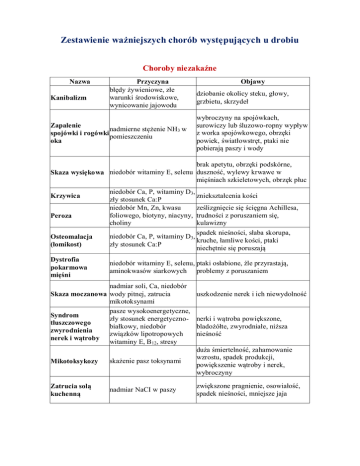 Zestawienie ważniejszych chorób występujących u drobiu Choroby niezakaźne Nazwa Kanibalizm Przyczyna błędy żywieniowe, złe warunki środowiskowe, wynicowanie jajowodu Zapalenie nadmierne stężenie NH3 w spojówki i rogówki pomieszczeniu oka Objawy dziobanie okolicy steku, głowy, grzbietu, skrzydeł wybroczyny na spojówkach, surowiczy lub śluzowo-ropny wypływ z worka spojówkowego, obrzęki powiek, światłowstręt, ptaki nie pobierają paszy i wody brak apetytu, obrzęki podskórne, Skaza wysiękowa niedobór witaminy E, selenu duszność, wylewy krwawe w mięśniach szkieletowych, obrzęk płuc Krzywica Peroza Osteomalacja (łomikost) Dystrofia pokarmowa mięśni niedobór Ca, P, witaminy D3, zniekształcenia kości zły stosunek Ca:P niedobór Mn, Zn, kwasu ześlizgnięcie się ścięgna Achillesa, foliowego, biotyny, niacyny, trudności z poruszaniem się, choliny kulawizny spadek nieśności, słaba skorupa, niedobór Ca, P, witaminy D3, kruche, łamliwe kości, ptaki zły stosunek Ca:P niechętnie się poruszają niedobór witaminy E, selenu, ptaki osłabione, źle przyrastają, aminokwasów siarkowych problemy z poruszaniem nadmiar soli, Ca, niedobór Skaza moczanowa wody pitnej, zatrucia mikotoksynami pasze wysokoenergetyczne, Syndrom zły stosunek energetycznotłuszczowego białkowy, niedobór zwyrodnienia związków lipotropowych nerek i wątroby witaminy E, B 12, stresy uszkodzenie nerek i ich niewydolność nerki i wątroba powiększone, bladożółte, zwyrodniałe, niższa nieśność Mikotoksykozy skażenie pasz toksynami duża śmiertelność, zahamowanie wzrostu, spadek produkcji, powiększenie wątroby i nerek, wybroczyny Zatrucia solą kuchenną nadmiar NaCI w paszy zwiększone pragnienie, osowiałość, spadek nieśności, mniejsze jaja Choroby inwazyjne Nazwa Kokcydioza Przyczyna choroby pierwotniaki z rodzaju Eimeria Trichomonadoza rzęs i stek (rzęsistkowica) Histomonadoza wiciowiec Histomonas meleagridis Glistnica (askarydioza) nicień Askaridia galli nicień Amidostomatoza Amidostomum anseris Gatunek wszystkie gatunki kury, indyki, gęsi Objawy biegunka, spadek apetytu, pragnienie, osowiałość, przydatki głowowe bledną, skrzydła i ogon opuszczone do ziemi, duża śmiertelność brak apetytu, senność, osowiałość, biegunka, rozdęcie jelit ślepych, zapalenie błony śluzowej jelit indyki, rzadziej kury brak apetytu, osowiałość, biegunka, zasinienie, bladość korali, zmiany w jelitach ślepych i wątrobie kury, indyki zahamowanie wzrostu, spadek produkcji, wychudzenie, nieżyt błony śluzowej jelit, obecność pasożytów w jelitach gęsi, rzadziej kaczki brak apetytu, osowiałość, zahamowanie wzrostu, biegunka, anemia, kłopoty z poruszaniem Choroby zakaźne bakteryjne Nazwa Przyczyna choroby Gatunek Objawy brak apetytu, osowiałość, biegunka, zapalenie spojówek, zaburzenia nerwowe i ruchowe, stan zapalny błony śluzowej, obrzęk narządów wewnętrznych utarta apetytu, zahamowanie wzrostu, biegunka, osowiałość, zmiany w narządach wewnętrznych utrata apetytu, duszność Salmoneloza pałeczki Salmonella Kolibakterioza patogenne wszystkie serotypy pałeczki gatunki okrężnicy E. coli Mikoplazmoza bakteria z rodziny Mycophswszystkie mataceae, gatunki Mycoplasma gallisepticurm kaszel, kichanie, wypływ śluzowo-surowiczy z nosa, zapalenie spojówek Pastereloza (cholera drobiu) pałeczka posocznicy krwotocznej Pasteurella multocida i P. haemolitica osowiałość, biegunka, wychudzenie, niedokrwistość, obrzęk stawów, kulawizna, stany zapalne narządów wewnętrznych wszystkie gatunki wszystkie gatunki senność, biegunka, wychudzenie, objawy żółtaczkowe, obrzęk narządów wewnętrznych, nieżyt błony śluzowej Kampylobakterioza bakterie z rodzaju Campylobacter Stafylokokoza gronkowiec złocisty wszystkie Staphylococcus gatunki aureus biegunka, osowiałość, zaburzenia ruchowe, obrzęk stawów, kulawizna Zakażenie Clostridium laseczki beztlenowe brak apetytu, biegunka, osowiałość, nekrotyczne zapalenie jelit kury brojlery Choroby zakaźne wirusowe Nazwa Przyczyna choroby Gatunek Zakaźne zapalenie wirus z rodziny kury torby Fabrycjusza Birnaviridae (Gumboro IBD) Rzekomy pomór drobiu (ND) szczepy lentomezokury, indyki geniczne wirusa ND Anemia zakaźna kurcząt (CA) ptasi Circovirus Syndrom spadku nieśności (EDS 76) adenowirus z II gr. kury adenowirusów ptasich Zespół złego wchłaniania reowirusy Zakaźne zapalenie wirus krtani i tchawicy z rodzaju Herpes (ILT) Syndrom obrzękłej głowy (SHS) Pneumovirus zaliczany do rodzaju paramyko- kurczęta kury, indyki kury kurczęta, kury Objawy brak apetytu, osowiałość, biegunka, drgawki, wybroczyny w mięśniach, zmiany w narządach wewnętrznych kichanie, rzężenie, duszność, skręty głowy i szyi zahamowanie wzrostu, anemia, zgorzelinowe zapalenie skóry, atrofia grasicy i torby Fabrycjusza, wybroczyny w tkance podskórnej i mięśniowej i błonie śluzowej żołądka gruczołowego spadek nieśności, małe jaja o chropowatej skorupie, odbarwienie skorupy, białko ulega rozrzedzeniu i zmętnieniu zahamowanie wzrostu, źle wykształcone, matowe, wypadające pióra, mięśnie piersiowe blade, w jelitach niestrawiona pasza, zmiany w narządach wewnętrznych trudności w oddychaniu, kicha nie, rzężenie, wyciek surowi czy z worków spojówkowych szyja wyciągnięta, otwarty dziób, postawa półprzysiadu senność, brak apetytu, kicha nie, łzawienie, zapalenie spojówek, obrzęk głowy, odbarwienie skorup, obręcze na Krwotoczne zapalenie jelit indyków (HE) wirusów wirus z II grupy indyki adenowirusów ptasich Zakaźne zapalenie nosa i tchawicy Pneumovirus indyków (TRT) Choroba Derzsy'ego wirus z rodziny Parroviridae Wirusowe zapalenie wirus Entavo-RNA wątroby kacząt indyki gęsi, kaczki piżmowe kaczęta skorupie apatia, krwawa biegunka, anemia, obrzęk śledziony, stan zapalny dwunastnicy kichanie, rzężenie, zapalenie spojówek, obrzęk zatok podoczołow
