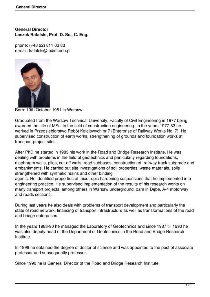General Director General Director Leszek Rafalski, Prof. D. Sc., C. Eng. phone: (+48 22) 811 03 83 e-mail: [email protected] Born: 19th October 1951 in Warsaw. Graduated from the Warsaw Technical University, Faculty of Civil Engineering in 1977 being awarded the title of MSc. in the field of construction engineering. In the years 1977-83 he worked in Przedsiębiorstwo Robót Kolejowych nr 7 (Enterprise of Railway Works No. 7). He supervised construction of earth works, strengthening of grounds and foundation works at transport project sites. After PhD he started in 1983 his work in the Road and Bridge Research Institute. He was dealing with problems in the field of geotechnics and particularly regarding foundations, diaphragm walls, piles, cut-off walls, road subbases, construction of railway track subgrade and embankments. He carried out site investigations of soil properties, waste materials, soils strengthened with synthetic resins and other binding agents. He identified properties of thixotropic hardening suspensions that he implemented into engineering practice. He supervised implementation of the results of his research works on many transport projects, among others in Warsaw underground, dam in Dębe, A-4 motorway and roads sections. During last years he also deals with problems of transport development and particularly the state of road network, financing of transport infrastructure as well as transformations of the road and bridge enterprises. In the years 1983-90 he managed the Laboratory of Geotechnics and since 1987 till 1990 he was also deputy head of the Department of Geotechnics in the Road and Bridge Research Institute. In 1996 he obtained the degree of doctor of science and was appointed to the post of associate professor and subsequently professor. Since 1990 he is General Director of the Road and Bridge Research Institute. 1/8 General Director He is author or co-author of tens of research works and expert’s reports as well as over 60 scientific publications. He is co-author of 6 patents in the field of soil stabilisation, hardening suspensions and their application in engineering practice. He has been appointed or elected to the following domestic scientific and professional organisations as well as scientific councils: - Polish Standardisation Committee - Forecasting Committee “Polska 2000 Plus” at the Presidium of Polish Academy of Sciences - Committee of Civil and Water Engineering of the Polish Academy of Sciences – sections: - geotechnics - building materials - transport engineering - All-Polish Economic Chamber of Road Building - Main Council of R&D organisations - Scientific-Consulting Council at the Management of Warsaw Underground He is member of Polish Geotechnics Committee and of the following international organisations: - Forum of European National Highway Research Laboratories (FEHRL) - Russian National Committee of Soil Mechanics and Foundations (RNKMGIF) - Permanent International Association of Road Congresses (PIARC) – Committee TC-12 “Earthworks, drainage, subgrade”, - International Society for Soil Mechanics and Geotechnical Engineering (ISSMGE) He speaks English and Russian. Major works done during the last years: “Studium sektorowe przedsiębiorstw branży drogowo-mostowej i surowców skalnych dla drogownictwa” (Sector study of enterprises from the road and bridge branch and rocky raw materials for road construction) Warsaw 1997. Analysis and directions of development of the above-mentioned branch. Manager of the team and co-author of the study New technics for pavement strengthening and maintenance: Proceedings of the XXth World Road Congress, Montreal, 1995. Report showing application of new technologies of strengthening and maintenance of pavements in Poland. Co-ordinator and co-author of the work “Właściwości i zastosowanie zawiesin twardniejących” (Properties and applications of hardening suspensions) Warsaw 1995. Qualifying thesis-showing achievements of the author in the field of research and implementation of hardening suspensions. Author of the work (in Polish) “Investment of the road sector in a country in transition: Poland” Proceedings of the Round Table 100, European conference of Ministers of Transport. Paris, 1994. Presentation of changes regarding the road sector in Poland. Co-author of the work “Road strengthening in Central and Eastern European Countries” 2/8 General Director OECD, Paris 1993. OECD report elaborated by international group of experts and presenting problems of strengthening roads in Central and Eastern Europe. Co-author of work “Modified hardening slurry for installation of steel piles” Proceedings of Fifth International Conference on Piling and Deep Foundations, Bruges 1994. Paper presenting the results of research of piles settled in hardening slurry. Author of the work “View point for the Central and Eastern European Countries” Proceedings of DIVINE Conference, Rotterdam 1997, published by LAND+WATER Magazine for Civil and Environmental Engineers, 9/1997. Article presenting significance of the DIVINE programme for the countries from Central and Eastern Europe. Author of the article Ordered research project: “Wpływ budowy i eksploatacji autostrad na przemiany systemu zagospodarowania przestrzennego w Polsce” (Influence of construction and exploitation of motorways on changes of the system of space management in Poland) Orderer: State Committee for Scientific Research. Manager of work and co-author Rheological properties of fresh bentonite-cement slurries modified by selected sodium salts. Archives of Civil Engineering, 1995. Research results of properties of slurries modified by sodium salts. Author of work “Stan sektora drogowego w Polsce” (State of road branch in Poland) Problemy Ekonomiki Transportu No. 1/1997. Presentation of current state of road sector in Poland. Author of work Po uzyskaniu stopnia doktora nauk technicznych rozpoczął w 1983 roku pracę w 