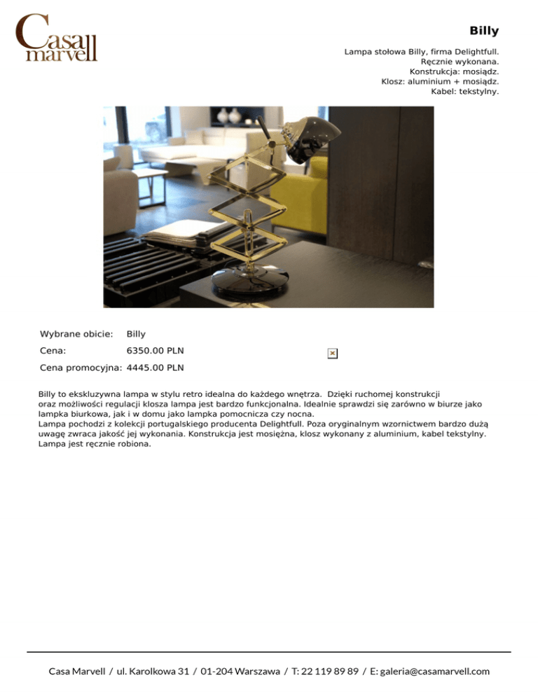 Billy Lampa stołowa Billy, firma Delightfull. Ręcznie wykonana. Konstrukcja: mosiądz. Klosz: aluminium + mosiądz. Kabel: tekstylny. Wybrane obicie: Billy Cena: 6350.00 PLN Cena promocyjna: 4445.00 PLN Billy to ekskluzywna lampa w stylu retro idealna do każdego wnętrza. Dzięki ruchomej konstrukcji oraz możliwości regulacji klosza lampa jest bardzo funkcjonalna. Idealnie sprawdzi się zarówno w biurze jako lampka biurkowa, jak i w domu jako lampka pomocnicza czy nocna. Lampa pochodzi z kolekcji portugalskiego producenta Delightfull. Poza oryginalnym wzornictwem bardzo dużą uwagę zwraca jakość jej wykonania. Konstrukcja jest mosiężna, klosz wykonany z aluminium, kabel tekstylny. Lampa jest ręcznie robiona.