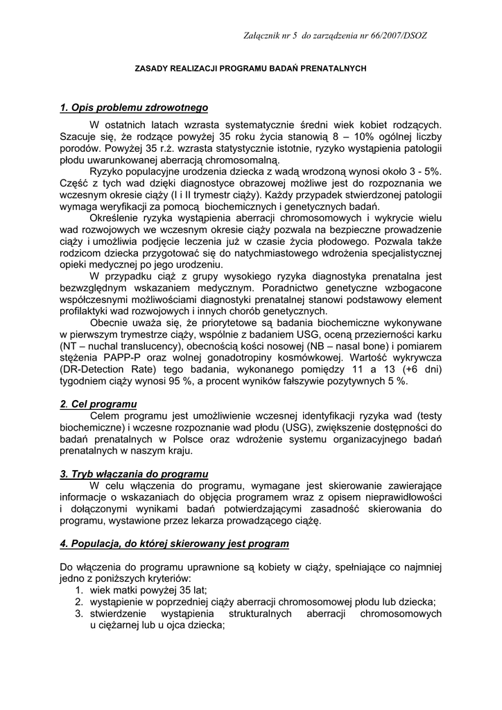Załącznik nr 5 do zarządzenia nr 66/2007/DSOZ ZASADY REALIZACJI PROGRAMU BADAŃ PRENATALNYCH 1. Opis problemu zdrowotnego W ostatnich latach wzrasta systematycznie średni wiek kobiet rodzących. Szacuje się, że rodzące powyżej 35 roku życia stanowią 8 – 10% ogólnej liczby porodów. Powyżej 35 r.ż. wzrasta statystycznie istotnie, ryzyko wystąpienia patologii płodu uwarunkowanej aberracją chromosomalną. Ryzyko populacyjne urodzenia dziecka z wadą wrodzoną wynosi około 3 - 5%. Część z tych wad dzięki diagnostyce obrazowej możliwe jest do rozpoznania we wczesnym okresie ciąży (I i II trymestr ciąży). Każdy przypadek stwierdzonej patologii wymaga weryfikacji za pomocą biochemicznych i genetycznych badań. Określenie ryzyka wystąpienia aberracji chromosomowych i wykrycie wielu wad rozwojowych we wczesnym okresie ciąży pozwala na bezpieczne prowadzenie ciąży i umożliwia podjęcie leczenia już w czasie życia płodowego. Pozwala także rodzicom dziecka przygotować się do natychmiastowego wdrożenia specjalistycznej opieki medycznej po jego urodzeniu. W przypadku ciąż z grupy wysokiego ryzyka diagnostyka prenatalna jest bezwzględnym wskazaniem medycznym. Poradnictwo genetyczne wzbogacone współczesnymi możliwościami diagnostyki prenatalnej stanowi podstawowy element profilaktyki wad rozwojowych i innych chorób genetycznych. Obecnie uważa się, że priorytetowe są badania biochemiczne wykonywane w pierwszym trymestrze ciąży, wspólnie z badaniem USG, oceną przezierności karku (NT – nuchal translucency), obecnością kości nosowej (NB – nasal bone) i pomiarem stężenia PAPP-P oraz wolnej gonadotropiny kosmówkowej. Wartość wykrywcza (DR-Detection Rate) tego badania, wykonanego pomiędzy 11 a 13 (+6 dni) tygodniem ciąży wynosi 95 %, a procent wyników fałszywie pozytywnych 5 %. 2. Cel programu Celem programu jest umożliwienie wczesnej identyfikacji ryzyka wad (testy biochemiczne) i wczesne rozpoznanie wad płodu (USG), zwiększenie dostępności do badań prenatalnych w Polsce oraz wdrożenie systemu organizacyjnego badań prenatalnych w naszym kraju. 3. Tryb włączania do programu W celu włączenia do programu, wymagane jest skierowanie zawierające informacje o wskazaniach do objęcia programem wraz z opisem nieprawidłowości i dołączonymi wynikami badań potwierdzającymi zasadność skierowania do programu, wystawione przez lekarza prowadzącego ciążę. 4. Populacja, do której skierowany jest program Do włączenia do programu uprawnione są kobiety w ciąży, spełniające co najmniej jedno z poniższych kryteriów: 1. wiek matki powyżej 35 lat; 2. wystąpienie w poprzedniej ciąży aberracji chromosomowej płodu lub dziecka; 3. stwierdzenie wystąpienia strukturalnych aberracji chromosomowych u ciężarnej lub u ojca dziecka; 4. stwierdzenie znacznie większego ryzyka urodzenia dziecka dotkniętego chorobą uwarunkowaną monogenetycznie lub wieloczynnikową; 5. stwierdzenie w czasie ciąży nieprawidłowego wyniku badania USG i/lub badań biochemicznych wskazujących na zwiększone ryzyko aberracji chromosomowej lub wady płodu. 5. Świadczenia zdrowotne w poszczególnych etapach realizacji programu 1) Badania nieinwazyjne w diagnostyce prenatalnej: a) badanie USG płodu wykonane zgodnie ze standardami Sekcji Ultrasonograficznej Polskiego Towarzystwa Ginekologicznego – przewidzianych dla tego badania. Pierwsze badanie USG powinno wykonać się pomiędzy 11-a 13 (+6 dni) tygodniem ciąży, kiedy wymiar CRL wynosi 45 – 84 mm, kolejne badanie USG wykonuje się pomiędzy 18 a 23 tygodniem ciąży, b) badania biochemiczne (oznaczenia w surowicy krwi), lekarz prowadzący decyduje o wykonaniu określonych testów w zależności od wieku ciąży: • PAPP-A – osoczowe białko ciążowe A, • Β-hCG – wolna gonadotropina kosmówkowa (podjednostka beta), • AFP – alfa fetoproteina, • Estriol – wolny estriol, 2) wykonanie komputerowej oceny ryzyka choroby płodu na podstawie testów przesiewowych zgodnie ze standardami FMF; 3) podjęcie decyzji o włączeniu pacjentki do dalszych etapów postępowania diagnostycznego; 4) porada genetyczna obejmująca m. in. wywiad lekarski z uwzględnieniem wywiadu genetycznego, ocenę i interpretację wyników wykonanych badań oraz decyzję, co do dalszego postępowania (w przypadku wskazań medycznych skierowanie na badania inwazyjne po wyrażeniu przez pacjentkę zgody na ich wykonanie); 5) procedury inwazyjne w diagnostyce prenatalnej - pobranie materiału do badań genetycznych w drodze amniopunkcji/ biopsji trofoblastu/ kordocentezy pod kontrolą USG; 6) badania genetyczne, które obejmują: - hodowlę komórkową, - wykonywanie preparatów do analizy cytogenetycznej (techniki prążkowe), - analizę mikroskopową chromosomów, - analizę FISH (hybrydyzacja In situ z wykorzystaniem fluorescencji), - analizę DNA w przypadkach chorób monogenicznych, - cytogenetyczne badania molekularne; W przypadku, kiedy konieczne jest wykonanie dalszej diagnostyki, niemieszczącej się w ramach programu, należy skierować pacjentkę do ośrodka specjalistycznego realizującego odpowiedni rodzaj świadczeń. 6. Wskaźniki monitorowania oczekiwanych efektów 1) liczba kobiet objętych programem w podziale na przyczyny włączenia do programu, 2) liczba kobiet zakwalifikowanych do badania inwazyjnego na podstawie zwiększonego ryzyka wystąpienia wady/choroby płodu w badaniu przesiewowym 2 (USG, biochemiczny test przesiewowy I lub II trymestru ciąży), 3) liczba wykonanych prenatalnych badań inwazyjnych, 4) liczba kobiet z potwierdzeniem wady płodu w badaniu USG (bez procedury inwazyjnej), 5) liczba kobiet z potwierdzeniem wady/ choroby płodu na podstawie wyniku badania inwazyjnego. 7. Wymagania wobec oferentów Świadczeniodawca zobowiązany jest do prowadzenia elektronicznej dokumentacji realizacji programu w systemie informatycznym udostępnionym przez NFZ. Do realizacji programu p
