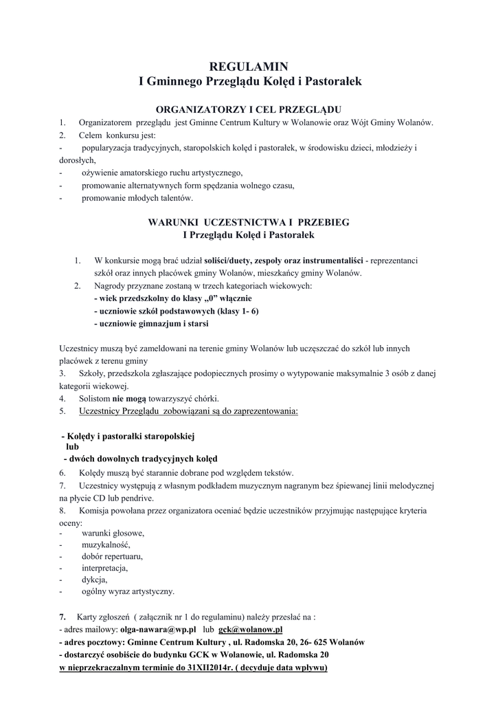 REGULAMIN I Gminnego Przeglądu Kolęd i Pastorałek ORGANIZATORZY I CEL PRZEGLĄDU 1. Organizatorem przeglądu jest Gminne Centrum Kultury w Wolanowie oraz Wójt Gminy Wolanów. 2. Celem konkursu jest: popularyzacja tradycyjnych, staropolskich kolęd i pastorałek, w środowisku dzieci, młodzieży i dorosłych, ożywienie amatorskiego ruchu artystycznego, promowanie alternatywnych form spędzania wolnego czasu, promowanie młodych talentów. WARUNKI UCZESTNICTWA I PRZEBIEG I Przeglądu Kolęd i Pastorałek 1. 2. W konkursie mogą brać udział soliści/duety, zespoły oraz instrumentaliści - reprezentanci szkół oraz innych placówek gminy Wolanów, mieszkańcy gminy Wolanów. Nagrody przyznane zostaną w trzech kategoriach wiekowych: - wiek przedszkolny do klasy ,,0” włącznie - uczniowie szkół podstawowych (klasy 1- 6) - uczniowie gimnazjum i starsi Uczestnicy muszą być zameldowani na terenie gminy Wolanów lub uczęszczać do szkół lub innych placówek z terenu gminy 3. Szkoły, przedszkola zgłaszające podopiecznych prosimy o wytypowanie maksymalnie 3 osób z danej kategorii wiekowej. 4. Solistom nie mogą towarzyszyć chórki. 5. Uczestnicy Przeglądu zobowiązani są do zaprezentowania: - Kolędy i pastorałki staropolskiej lub - dwóch dowolnych tradycyjnych kolęd 6. Kolędy muszą być starannie dobrane pod względem tekstów. 7. Uczestnicy występują z własnym podkładem muzycznym nagranym bez śpiewanej linii melodycznej na płycie CD lub pendrive. 8. Komisja powołana przez organizatora oceniać będzie uczestników przyjmując następujące kryteria oceny: warunki głosowe, muzykalność, dobór repertuaru, interpretacja, dykcja, ogólny wyraz artystyczny. 7. Karty zgłoszeń ( załącznik nr 1 do regulaminu) należy przesłać na : - adres mailowy: [email protected] lub [email protected] - adres pocztowy: Gminne Centrum Kultury , ul. Radomska 20, 26- 625 Wolanów - dostarczyć osobiście do budynku GCK w Wolanowie, ul. Radomska 20 w nieprzekraczalnym terminie do 31XII2014r. ( decyduje data wpływu) 8. Przesłuchania odbędą się na sali widowiskowej Gminnego Centrum Kultury w Wolanowie, w piątek 16 I 2015 r. od godz. 10.00. Osoby poniżej 18 roku życia prosimy o przybycie z opiekunami ze szkół lub rodzicami. 9. Wyniki konkursu zostaną ogłoszone w dniu przesłuchań o godz. 18.00 w GCK w Wolanowie, zostaną wywieszone na tablicy informacyjnej w budynku GCK oraz na Facebooku Gminnego Centrum Kultury w Wolanowie. Osoby, które będą nagrodzone i wyróżnione prosimy o kontakt po ogłoszeniu wyników w celu ustalenia szczegółów dotyczących występu finałowego. 10. O terminie przesłuchań i kolejności występów uczestnicy zostaną poinformowani po 31XII2014r. POSTANOWIENIA KOŃCOWE: 1. Finał konkursu odbędzie się w niedzielę 25 I 2015 r. o godz. 16.00 w kościele p.w. św. Doroty w Wolanowie 2. W konkursie zostaną wyłonieni zdobywcy I, II, III miejsca w poszczególnych kategoriach wiekowych. 3. Zdobycie tytułu laureata konkursu jest równoznaczne ze zgodą na obowiązkowy występ wokalny podczas Uroczystego Koncertu Kolęd i Pastorałek w dniu 25 I 2015r. 4. Fundatorem nagród jest Wójt Gminy Wolanów. 5. O kolejności występów decydują organizatorzy. 6. Wzięcie udziału w konkursie oznacza zgodę uczestnika na bezpłatne publikowanie i wykorzystanie materiałów fotograficznych i filmowych w prasie, radiu i TV oraz innych mediach reklamujących imprezę. 7. Niestawienie się na którekolwiek ze spotkań etapów konkursu oraz jest równoznaczne z dyskwalifikacją. 8. Rezygnacja z występu podczas przesłuchań czy koncertu jest równoznaczna z dyskwalifikacją. 9. Organizatorzy zastrzegają sobie prawo do indywidualnego kontaktu z uczestnikami w celach promocyjnych. 10. Organizatorzy zastrzegają sobie prawo do zmiany regulaminu, nagród i terminów z przyczyn niezależnych od organizatorów. 11. Nagrody i dyplomy zostaną wręczone podczas uroczystego finału I Przeglądu Kolęd i Pastorałek 25 I 2015r. Regulamin został przygotowany przez Gminne Centrum Kultury w Wolanowie. Wolanów, dnia 15XII2014r. Kontakt do organizatorów: Gminne Centrum Kultury ul. Radomska 20 26- 625 Wolanów tel. 48 618 60 51 wew. 57 Olga Nawara Tel. :881723029 ; [email protected] Załącznik nr 1 do Regulaminu I Przeglądu Kolęd i Pastorałek FORMULARZ ZGŁOSZENIOWY A. DANE UCZESTNIKA/ UCZESTNIKÓW PRZEGLADU: W PRZYPADKU SOLISTÓW/ DUETÓW: 1. Imię i nazwisko…………………………………………………………………….. Adres zamieszkania: ul. ………………………………………………………………………………………………. kod…… - ……. miejscowość …………………………………………………………………. telefon …………………….………… e-mail …………………………………………………. OPIEKUN ( imię, nazwisko, Tel. kontaktowy)………………………………………………… ………………………………………………………………………………………………….. 2. Imię i nazwisko…………………………………………………………………….. Adres zamieszkania: ul. ………………………………………………………………………………………………. kod…… - ……. miejscowość …………………………………………………………………. telefon …………………….………… e-mail …………………………………………………. OPIEKUN ( imię, nazwisko, Tel. kontaktowy)………………………………………………… ………………………………………………………………………………………………….. B. W PRZYPADKU ZESPOŁÓW: NAZWA ZESPOŁU: …………………………………………………………………………. LICZBA OSÓB W ZESPOLE: …………………………………………