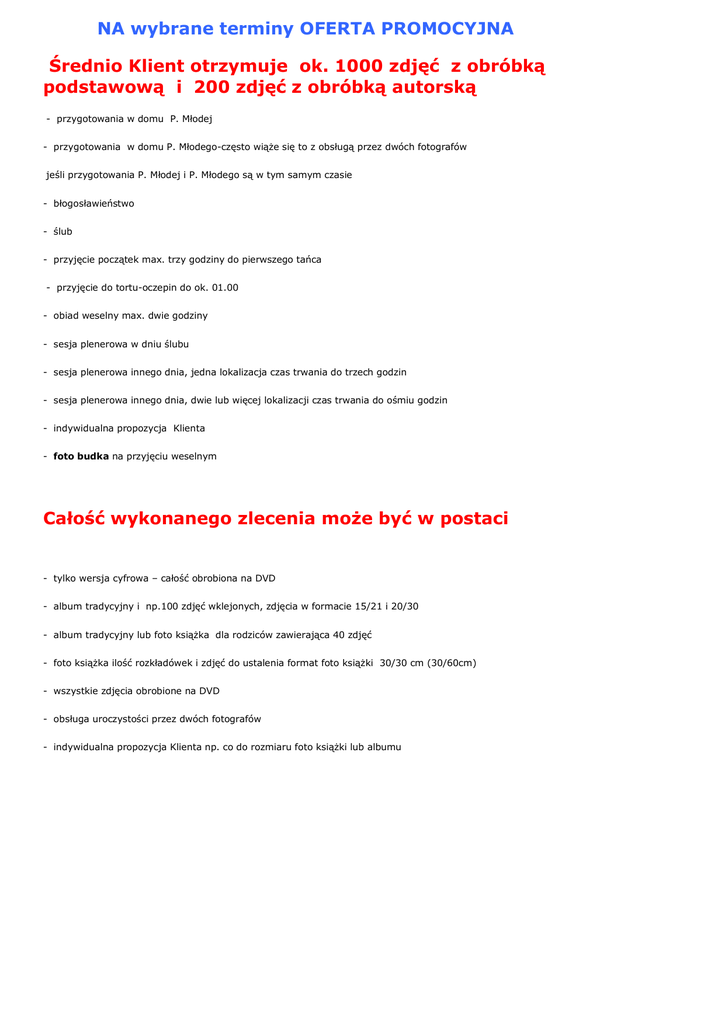 NA wybrane terminy OFERTA PROMOCYJNA Średnio Klient otrzymuje ok. 1000 zdjęć z obróbką podstawową i 200 zdjęć z obróbką autorską - przygotowania w domu P. Młodej - przygotowania w domu P. Młodego-często wiąże się to z obsługą przez dwóch fotografów jeśli przygotowania P. Młodej i P. Młodego są w tym samym czasie - błogosławieństwo - ślub - przyjęcie początek max. trzy godziny do pierwszego tańca - przyjęcie do tortu-oczepin do ok. 01.00 - obiad weselny max. dwie godziny - sesja plenerowa w dniu ślubu - sesja plenerowa innego dnia, jedna lokalizacja czas trwania do trzech godzin - sesja plenerowa innego dnia, dwie lub więcej lokalizacji czas trwania do ośmiu godzin - indywidualna propozycja Klienta - foto budka na przyjęciu weselnym Całość wykonanego zlecenia może być w postaci - tylko wersja cyfrowa – całość obrobiona na DVD - album tradycyjny i np.100 zdjęć wklejonych, zdjęcia w formacie 15/21 i 20/30 - album tradycyjny lub foto książka dla rodziców zawierająca 40 zdjęć - foto książka ilość rozkładówek i zdjęć do ustalenia format foto książki 30/30 cm (30/60cm) - wszystkie zdjęcia obrobione na DVD - obsługa uroczystości przez dwóch fotografów - indywidualna propozycja Klienta np. co do rozmiaru foto książki lub albumu PRZYKŁADOWE PAKIETY które można modyfikować np. dodać foto budkę(dodatkowo płatne) lub indywidualnie ustalić czas pracy fotografa Pakiet Cyfrowy Pakiet obejmuje usługę tylko w postaci cyfrowej - wszystkie zdjęcia tylko na DVD ZASTOSOWAĆ MOŻNA W KAŻDYM PONIŻSZYM PAKIECIE koszt obniżony o wartość albumów Pakiet Oszczędny Minimum 500 zdjęć na płycie DVD. Wszystkie zdjęcia obrobione! miesięczna galeria internetowa. Pakiet obejmuje dyspozycyjność fotografa w dzień ślubu i może zawierać: błogosławieństwo, ceremonię, przyjęcie do tortuoczepin max do ok. 1.00 godz. oraz plener w dniu ślubu. W pakiecie: Album tradycyjny i 80 odbitek w formatach 15x21, 20x30. Lub Foto książka (foto album) 30x30 cm 60 zdjęć 11 rozkładówek - 30x60cm - 22 stron Pakiet Optymalny Minimum 600 zdjęć na płycie DVD. Wszystkie zdjęcia obrobione! miesięczna galeria internetowa. Pakiet obejmuje : przygotowania (ok. jednej godz. przed ceremonią), błogosławieństwo , ceremonię, przyjęcie do tortu-oczepin max do ok. 1.00 godz. oraz plener innego dnia jedna lokalizacja (max do 2 godz.) W pakiecie: Album tradycyjny i 80 odbitek w formatach 15x21, 20x30. Lub Foto książka (foto album) 30x30 cm, 70 zdjęć 13 rozkładówek - 30x60 cm - 26 stron Pakiet Optymalny Plus Minimum 800 zdjęć na płycie DVD. Wszystkie zdjęcia obrobione! miesięczna galeria internetowa. Pakiet obejmuje: przygotowania (czas do ustalenia), błogosławieństwo, ceremonię, przyjęcie do tortu-oczepin max. do ok. 01.00 godz. oraz plener innego dnia do trzech lokalizacji (max do 4 godz.) W pakiecie: Album tradycyjny 100 odbitek w formatach 15x21, 20x30. Lub Foto książka (foto album) 30x30 cm 80 zdjęć 15 rozkładówek - 30x60 cm - 30 stron Pakiet Max Plus Minimum 1200 zdjęć na płycie DVD Wszystkie zdjęcia obrobione! miesięczna galeria internetowa Usługa realizowana przez 2 fotografów. Pakiet obejmuje: przygotowania P. Młody i P. Młoda (max 3 godz. przed ceremonią), błogosławieństwo, ceremonię, przyjęcie do tortuoczepin max. ok. 01:00 godz. oraz plener innego dnia do czterech lokalizacji (max do 5 godz.) W pakiecie: album tradycyjny 120 odbitek w formatach 15x21, 20x30. Lub Foto książka (foto album) 100 zdjęć 18 rozkładówek - 30x60 cm – 36 stron www.fotosikorski.com 601 33 29 33 Najczęściej zadawane pytania Jakim sprzętem wykonujesz zdjęcia? - W reportażu ślubnym używam aparatów fotograficznych Canon 1D Mark IV, Canon 1D Mark III, Canon 5D Obiektywy: Canon 85 mm f/1.2L, 28 mm f/1.8, 20 mm f/1.4, 24-70 mm f/2.8L, 70-200 mm f/2.8L, 8 mm f/3.8 (rybie oko) Zestaw przenośny błyskowych lamp studyjnych, bardzo przydaje się na sali weselnej, otrzymujemy ciekawe efekty gry światło-cienia i doskonałe oświetlenie na sali weselnej Kto wybiera zdjęcia do albumu - zdjęcia do albumu wybiera Klient Czy masz ukończony kurs liturgiczny dla fotografów wymagany do robienia zdjęć w kościele? - Tak, mam zaświadczenie z Kurii Metropolitalnej Warszawskiej o ukończeniu przygotowania liturgicznego w zakresie fotografowania w czasie uroczystości religijnych. Czy istnieje możliwość zrealizowania pleneru ślubnego w innych rejonach Polski lub za granicą? - Tak, jestem otwarty na wszelkie pomysły. Możemy pojechać np. do Wenecji lub mogę Wam towarzyszyć podczas podróży poślubnej. Dodatkowe koszty związane z wyjazdem są ustalane indywidualnie. Czy wykonujesz zdjęcia ślubne poza Warszawą? - Tak, mieszkam i pracuję w Warszawie, ale chętnie przyjadę na Twój ślub do Krakowa, Szczecina, Ciechanowa czy do Kłobucka. Czy mamy Tobie zapewnić transport w dniu ślubu? -Nie, zawsze przyjeżdżam swoim samochodem w dniu ślubu. Jaki jest koszt dodatkowych godzin Twojej pracy w dniu ślubu? - Jeżeli z jakiegoś powodu np. oczepiny przeciągną się ponad godzinę 1:30 , nie wyjdę w połowie zabawy ani nie zażądam dodatkowej zapłaty. Zostanę jednak nie dłużej, niż do godziny 2:00. Chyba, że wcześniej ustalimy inne godziny zakończenia mojej pracy Jak możemy podpisać umowę i ile wynosi zadatek? - Preferuję spotkania, ale umowę możemy również podpisać internetowo. Chętnie Was poznam i omówię wszelkie kwestie związane z Waszym ślubem, oczekiwaniami oraz pomysłami. Jeśli zdecydujecie się na moje usługi podpisujemy umowę. Zadatek wynosi 500 zł. Czy możemy wstępnie zarezerwować termin? - Nie, rezerwacja terminu następuje tylko poprzez podpisanie umowy lub wpłacenie zadatku.