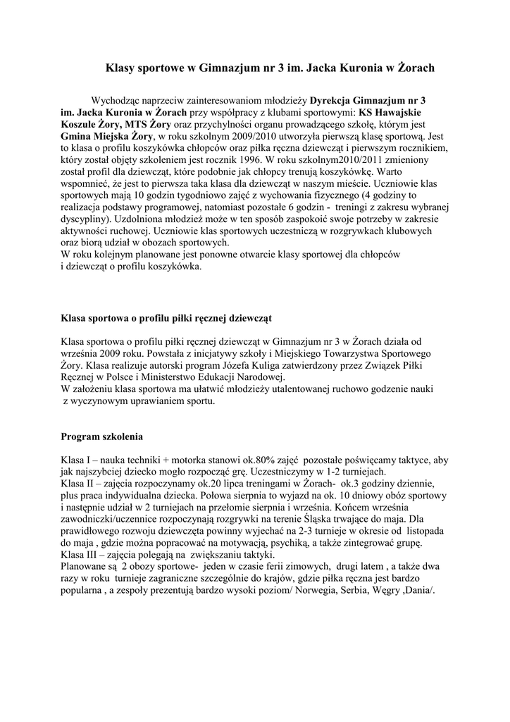 Klasy sportowe w Gimnazjum nr 3 im. Jacka Kuronia w śorach Wychodząc naprzeciw zainteresowaniom młodzieŜy Dyrekcja Gimnazjum nr 3 im. Jacka Kuronia w śorach przy współpracy z klubami sportowymi: KS Hawajskie Koszule śory, MTS śory oraz przychylności organu prowadzącego szkołę, którym jest Gmina Miejska śory, w roku szkolnym 2009/2010 utworzyła pierwszą klasę sportową. Jest to klasa o profilu koszykówka chłopców oraz piłka ręczna dziewcząt i pierwszym rocznikiem, który został objęty szkoleniem jest rocznik 1996. W roku szkolnym2010/2011 zmieniony został profil dla dziewcząt, które podobnie jak chłopcy trenują koszykówkę. Warto wspomnieć, Ŝe jest to pierwsza taka klasa dla dziewcząt w naszym mieście. Uczniowie klas sportowych mają 10 godzin tygodniowo zajęć z wychowania fizycznego (4 godziny to realizacja podstawy programowej, natomiast pozostałe 6 godzin - treningi z zakresu wybranej dyscypliny). Uzdolniona młodzieŜ moŜe w ten sposób zaspokoić swoje potrzeby w zakresie aktywności ruchowej. Uczniowie klas sportowych uczestniczą w rozgrywkach klubowych oraz biorą udział w obozach sportowych. W roku kolejnym planowane jest ponowne otwarcie klasy sportowej dla chłopców i dziewcząt o profilu koszykówka. Klasa sportowa o profilu piłki ręcznej dziewcząt Klasa sportowa o profilu piłki ręcznej dziewcząt w Gimnazjum nr 3 w śorach działa od września 2009 roku. Powstała z inicjatywy szkoły i Miejskiego Towarzystwa Sportowego śory. Klasa realizuje autorski program Józefa Kuliga zatwierdzony przez Związek Piłki Ręcznej w Polsce i Ministerstwo Edukacji Narodowej. W załoŜeniu klasa sportowa ma ułatwić młodzieŜy utalentowanej ruchowo godzenie nauki z wyczynowym uprawianiem sportu. Program szkolenia Klasa I – nauka techniki + motorka stanowi ok.80% zajęć pozostałe poświęcamy taktyce, aby jak najszybciej dziecko mogło rozpocząć grę. Uczestniczymy w 1-2 turniejach. Klasa II – zajęcia rozpoczynamy ok.20 lipca treningami w śorach- ok.3 godziny dziennie, plus praca indywidualna dziecka. Połowa sierpnia to wyjazd na ok. 10 dniowy obóz sportowy i następnie udział w 2 turniejach na przełomie sierpnia i września. Końcem września zawodniczki/uczennice rozpoczynają rozgrywki na terenie Śląska trwające do maja. Dla prawidłowego rozwoju dziewczęta powinny wyjechać na 2-3 turnieje w okresie od listopada do maja , gdzie moŜna popracować na motywacją, psychiką, a takŜe zintegrować grupę. Klasa III – zajęcia polegają na zwiększaniu taktyki. Planowane są 2 obozy sportowe- jeden w czasie ferii zimowych, drugi latem , a takŜe dwa razy w roku turnieje zagraniczne szczególnie do krajów, gdzie piłka ręczna jest bardzo popularna , a zespoły prezentują bardzo wysoki poziom/ Norwegia, Serbia, Węgry ,Dania/. Obecna klasa II w ubiegłym roku szkolnym nie brała udziału w rozgrywkach ligowych, natomiast uczestniczyła w turniejach w Łaziskach i Szczecinie. Ten rok szkolny „ rozpoczęliśmy” 21 lipca treningami w śorach / hala, siłownia, skate –park/, następnie od 9 do 19 sierpnia byliśmy na obozie w Mezokovesd, końcem sierpnia turniej śory Cup, wrzesień – turniej „Warkocz Wandy” w Krakowie i od początku października rozgrywki ligowe. Dziewczęta z sekcji piłka ręczna na treningu w Mezokovesd Dziewczęta oprócz udziału w zawodach z piłki ręcznej reprezentują takŜe szkołę w innych dyscyplinach sportu. Najlepsza z dziewcząt ,Daria Justka, gra takŜe w zespole z wcześniejszego rocznika (1994) i wraz z tą druŜyną była na turnieju we Francji w La Rochefocould. Uczennica Daria Justka przygotowuje się do treningu Klasa sportowa o profilu piłki koszykowej dziewcząt i chłopców Koszykarski klub sportowy Hawajskie Koszule Bank Spółdzielczy w śorach zajmuje się szkoleniem młodych koszykarzy w ramach klas sportowych działających w naszym gimnazjum. Uczniowie uczęszczający do tych klas w przyszłości mają zasilić szeregi sekcji seniorów rozgrywających swoje mecze w II lidze koszykówki męŜczyzn. W roku szkolnym 2009/2010 powstała klasa sportowa o profilu piłki koszykowej chłopców, a w następnym roku szkolnym klasa sportowa dla dziewcząt i chłopców o tym samym profilu. Po raz pierwszy w naszym mieście piłkę koszykową trenują dziewczęta po okiem trenera - mgr Ludwika Maciejewskiego. Uczniowie z klasy pierwszej biorą udział w rozgrywkach młodzików starszych(MU-14) organizowanych przez Śląski Związek Koszykówki. Zawodnicy zgłoszeni do rozgrywek, oprócz zajęć realizowanych w szkołach, biorą udział w treningach tzw. przedmeczowych odbywających się w hali sportowej w śorach. Klub stara się dbać nie tylko o rozwój umiejętności koszykarskich poszczególnych uczniów, ale takŜe mobilizuje ich do pracy w szkole, wobec tego do treningów przedmeczowych dopuszczeni są tylko uczniowie najzdolniejsi, wykazujący się bardzo dobrą frekwencją na zajęciach w szkole oraz dobrymi ocenami z przedmiotów. Dopiero z tej grupy uczniów, osoby, które wykaŜą się na treningu największym zaangaŜowaniem, mają moŜliwość wzięcia udziału w rozgrywkach. Uczniowie klas drugich nie biorą udziału w Ŝadnych rozgrywkach, przygotowywani są natomiast do przyszłorocznych rozgrywek Kadetów(MU-16). Sarnicki Jakub, uczeń Gimnazjum nr 3 w śorach, klasa 2c Klub dwa razy do roku organizuje tygodniowe obozy sportowe (obóz letni i zimowy) dla swoich podopiecznych. Obozy mają charakter zbiorczy, biorą w nich udział uczniowie ze wszystkich klas sportowych realizujących swój program w róŜnych szkołach. W działaniu tym realizowane są cele wychowawcze, uczniowie oprócz doskonalenia swoich umiejętności koszykarskich uczą się takŜe wzajemnego szacunku, doskonalona jest umiejętność współpracy ze sportowcami z innych szkół i w róŜnym wieku. Działanie to mobilizuje równieŜ uczniów do dalszej pracy, poniewaŜ na obozowych zajęciach
