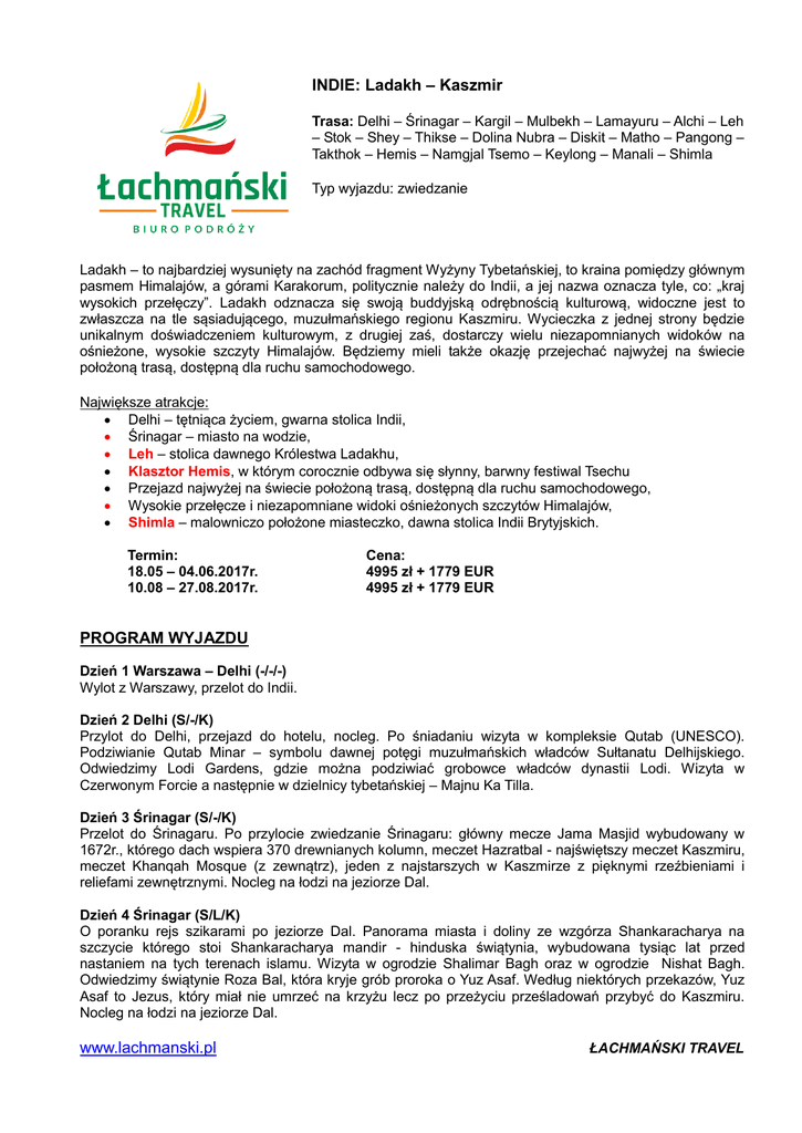 INDIE: Ladakh – Kaszmir Trasa: Delhi – Śrinagar – Kargil – Mulbekh – Lamayuru – Alchi – Leh – Stok – Shey – Thikse – Dolina Nubra – Diskit – Matho – Pangong – Takthok – Hemis – Namgjal Tsemo – Keylong – Manali – Shimla Typ wyjazdu: zwiedzanie Ladakh – to najbardziej wysunięty na zachód fragment Wyżyny Tybetańskiej, to kraina pomiędzy głównym pasmem Himalajów, a górami Karakorum, politycznie należy do Indii, a jej nazwa oznacza tyle, co: „kraj wysokich przełęczy”. Ladakh odznacza się swoją buddyjską odrębnością kulturową, widoczne jest to zwłaszcza na tle sąsiadującego, muzułmańskiego regionu Kaszmiru. Wycieczka z jednej strony będzie unikalnym doświadczeniem kulturowym, z drugiej zaś, dostarczy wielu niezapomnianych widoków na ośnieżone, wysokie szczyty Himalajów. Będziemy mieli także okazję przejechać najwyżej na świecie położoną trasą, dostępną dla ruchu samochodowego. Największe atrakcje: Delhi – tętniąca życiem, gwarna stolica Indii, Śrinagar – miasto na wodzie, Leh – stolica dawnego Królestwa Ladakhu, Klasztor Hemis, w którym corocznie odbywa się słynny, barwny festiwal Tsechu Przejazd najwyżej na świecie położoną trasą, dostępną dla ruchu samochodowego, Wysokie przełęcze i niezapomniane widoki ośnieżonych szczytów Himalajów, Shimla – malowniczo położone miasteczko, dawna stolica Indii Brytyjskich. Termin: 18.05 – 04.06.2017r. 10.08 – 27.08.2017r. Cena: 4995 zł + 1779 EUR 4995 zł + 1779 EUR PROGRAM WYJAZDU Dzień 1 Warszawa – Delhi (-/-/-) Wylot z Warszawy, przelot do Indii. Dzień 2 Delhi (S/-/K) Przylot do Delhi, przejazd do hotelu, nocleg. Po śniadaniu wizyta w kompleksie Qutab (UNESCO). Podziwianie Qutab Minar – symbolu dawnej potęgi muzułmańskich władców Sułtanatu Delhijskiego. Odwiedzimy Lodi Gardens, gdzie można podziwiać grobowce władców dynastii Lodi. Wizyta w Czerwonym Forcie a następnie w dzielnicy tybetańskiej – Majnu Ka Tilla. Dzień 3 Śrinagar (S/-/K) Przelot do Śrinagaru. Po przylocie zwiedzanie Śrinagaru: główny mecze Jama Masjid wybudowany w 1672r., którego dach wspiera 370 drewnianych kolumn, meczet Hazratbal - najświętszy meczet Kaszmiru, meczet Khanqah Mosque (z zewnątrz), jeden z najstarszych w Kaszmirze z pięknymi rzeźbieniami i reliefami zewnętrznymi. Nocleg na łodzi na jeziorze Dal. Dzień 4 Śrinagar (S/L/K) O poranku rejs szikarami po jeziorze Dal. Panorama miasta i doliny ze wzgórza Shankaracharya na szczycie którego stoi Shankaracharya mandir - hinduska świątynia, wybudowana tysiąc lat przed nastaniem na tych terenach islamu. Wizyta w ogrodzie Shalimar Bagh oraz w ogrodzie Nishat Bagh. Odwiedzimy świątynie Roza Bal, która kryje grób proroka o Yuz Asaf. Według niektórych przekazów, Yuz Asaf to Jezus, który miał nie umrzeć na krzyżu lecz po przeżyciu prześladowań przybyć do Kaszmiru. Nocleg na łodzi na jeziorze Dal. www.lachmanski.pl ŁACHMAŃSKI TRAVEL Dzień 5 Śrinagar – Kargil (S/-/K) Podróż jedyną drogą łączącą Śrinagar z Ladakhiem w kierunku miasta Leh. (Trasa ok.255 km – czas przejazdu ok.8 godz.). Miniemy przełęcz Zoji (3529m n.p.m.), która oddziela Kaszmir od Ladakhu. Ponieważ będziemy jechać wzdłuż „linii kontroli” należy spodziewać się kontroli paszportowej przez wojska stacjonujące wzdłuż granicy. Nocleg w Kargil (2676m n.p.m.) leżącym już w Ladakhu. To najdalej wysunięte na północ miejsce, jakie odwiedzimy w czasie podróży. Dzień 6 Mulbekh – Lamayuru – Alchi – Leh (S/-/K) Trasa ok.255 km – czas przejazdu ok.8 godz. W drodze do Leh postój w Mulbekh (8-metrowy wizerunek Buddy Przyszłości – Maitrei wykuty w skale). Przejazd przez przełęcze Fotu (4147m n.p.m.) i Namika (3700m n.p.m.), zjazd do Lamayuru i wizyta w klasztorze Lamayuru należącym do buddyjskiej szkoły drikung kagju. Przystanek przy klasztorze Alchi z XI w., założonym przez Rinczena Zangpo. Dzień 7 Leh – Stok – Shey – Thikse (S/-/K) Zwiedzanie Leh, stolicy Ladakhu. Wyprawa do wioski Stok po drugiej stronie Indusu, oficjalnej siedziby ladakhijskiej rodziny królewskiej. Wizyta w dawnym pałacu królewskim i klasztorze w Shey, które było niegdyś letnią rezydencją władców Ladakhu. Następnie klasztor Thikse, którego dwanaście kondygnacji i niezliczone budynki przywodzą na myśl lhaską Potalę. W klasztorze znajduje się największy w Ladakhu posąg Buddy Przyszłości – Maitrei. Dzień 8 Leh – Dolina Nubra – Diskit (S/-/K) Czeka nas najbardziej emocjonująca część wyprawy (Trasa ok.150 km – czas przejazdu ok.6 godz.). Wjazd najwyżej na świecie położoną, dostępną drogą dla ruchu samochodowego, na przełęcz Khardungla (5359m n.p.m) , znajdującą się na wysokości 5359 m n.p.m. Zachwycające widoki na Dolinę Indusu, łańcuch Himalajów oraz na dolinę. Wizyta w klasztorze Diskit, najstarszym w dolinie Nubra. Dzień 9 Dolina Nubra – Matho - Leh (S/-/K) Wycieczka do piaszczystych pustynnych wydm, otoczonych ośnieżonymi szczytami gór. Powrót do Leh (Trasa ok.150 km – czas przejazdu ok.6 godz.). Wizyta w klasztorze Matho, jedynym w Ladakhu należącym do buddyjskiej szkoły sakja. Postój przy japońskiej stupie Shanti, skąd można oglądać panoramę Leh. Dzień 10 Leh – Jezioro Pangong (S/-/K) Przejazd (Trasa ok.245km – czas przejazdu ok.6 godz.) przez przełęcz Changla nad jezioro Pangong, najwyżej na świecie położone słone jezioro, leżące na granicy Indii i Tybetu. Podziwianie turkusowej tafli jeziora i niezapomnianych widoków na ośnieżone szczyty Himalajów. Przejazd ok. 40km na bazy noclegowej (namioty). Dzień 11 Takthok – Hemis – Namgjal Tsemo – Leh (S/-/K) Przejazd (Trasa ok.245km – czas przejazdu ok.6 godz.) w kierunku Leh. Po drodze wizyta w klasztorze Takthok. Odwiedzimy klasztor Hemis, który powstał w XVII w. Chciaż oryginalny klasztor istniał tu jeszcze przed XI w. Na 