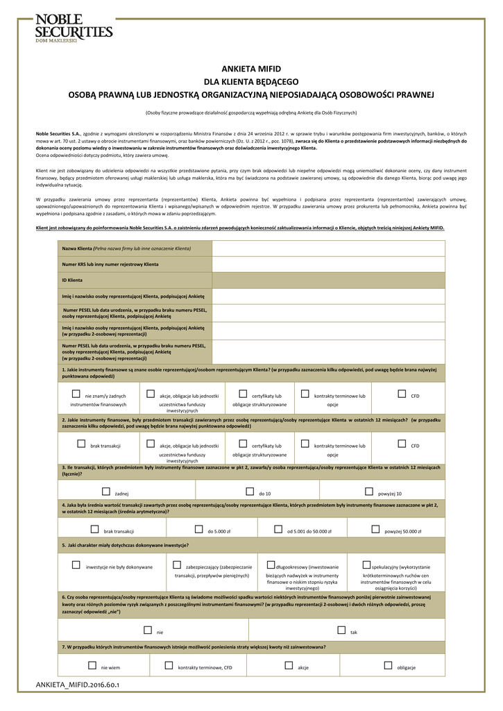 ANKIETA MIFID DLA KLIENTA BĘDĄCEGO OSOBĄ PRAWNĄ LUB JEDNOSTKĄ ORGANIZACYJNĄ NIEPOSIADAJĄCĄ OSOBOWOŚCI PRAWNEJ (Osoby fizyczne prowadzące działalność gospodarczą wypełniają odrębną Ankietę dla Osób Fizycznych) Noble Securities S.A., zgodnie z wymogami określonymi w rozporządzeniu Ministra Finansów z dnia 24 września 2012 r. w sprawie trybu i warunków postępowania firm inwestycyjnych, banków, o których mowa w art. 70 ust. 2 ustawy o obrocie instrumentami finansowymi, oraz banków powierniczych (Dz. U. z 2012 r., poz. 1078), zwraca się do Klienta o przedstawienie podstawowych informacji niezbędnych do dokonania oceny poziomu wiedzy o inwestowaniu w zakresie instrumentów finansowych oraz doświadczenia inwestycyjnego Klienta. Ocena odpowiedniości dotyczy podmiotu, który zawiera umowę. Klient nie jest zobowiązany do udzielenia odpowiedzi na wszystkie przedstawione pytania, przy czym brak odpowiedzi lub niepełne odpowiedzi mogą uniemożliwić dokonanie oceny, czy dany instrument finansowy, będący przedmiotem oferowanej usługi maklerskiej lub usługa maklerska, która ma być świadczona na podstawie zawieranej umowy, są odpowiednie dla danego Klienta, biorąc pod uwagę jego indywidualna sytuację. W przypadku zawierania umowy przez reprezentanta (reprezentantów) Klienta, Ankieta powinna być wypełniona i podpisana przez reprezentanta (reprezentantów) zawierających umowę, upoważnionego/upoważnionych do reprezentowania Klienta i wpisanego/wpisanych w odpowiednim rejestrze. W przypadku zawierania umowy przez prokurenta lub pełnomocnika, Ankieta powinna być wypełniona i podpisana zgodnie z zasadami, o których mowa w zdaniu poprzedzającym. Klient jest zobowiązany do poinformowania Noble Securities S.A. o zaistnieniu zdarzeń powodujących konieczność zaktualizowania informacji o Kliencie, objętych treścią niniejszej Ankiety MIFID. Nazwa Klienta (Pełna nazwa firmy lub inne oznaczenie Klienta) Numer KRS lub inny numer rejestrowy Klienta ID Klienta Imię i nazwisko osoby reprezentującej Klienta, podpisującej Ankietę Numer PESEL lub data urodzenia, w przypadku braku numeru PESEL, osoby reprezentującej Klienta, podpisującej Ankietę Imię i nazwisko osoby reprezentującej Klienta, podpisującej Ankietę (w przypadku 2-osobowej reprezentacji) Numer PESEL lub data urodzenia, w przypadku braku numeru PESEL, osoby reprezentującej Klienta, podpisującej Ankietę (w przypadku 2-osobowej reprezentacji) 1. Jakie instrumenty finansowe są znane osobie reprezentującej/osobom reprezentującym Klienta? (w przypadku zaznaczenia kilku odpowiedzi, pod uwagę będzie brana najwyżej punktowana odpowiedź) □ nie znam/y żadnych □ instrumentów finansowych akcje, obligacje lub jednostki uczestnictwa funduszy inwestycyjnych □ □ certyfikaty lub □ kontrakty terminowe lub obligacje strukturyzowane CFD opcje 2. Jakie instrumenty finansowe, były przedmiotem transakcji zawieranych przez osobę reprezentującą/osoby reprezentujące Klienta w ostatnich 12 miesiącach? (w przypadku zaznaczenia kilku odpowiedzi, pod uwagę będzie brana najwyżej punktowana odpowiedź) □ brak transakcji □ akcje, obligacje lub jednostki □ □ certyfikaty lub □ kontrakty terminowe lub CFD uczestnictwa funduszy obligacje strukturyzowane opcje inwestycyjnych 3. Ile transakcji, których przedmiotem były instrumenty finansowe zaznaczone w pkt 2, zawarła/y osoba reprezentująca/osoby reprezentujące Klienta w ostatnich 12 miesiącach (łącznie)? □ □ żadnej □ do 10 powyżej 10 4. Jaka była średnia wartość transakcji zawartych przez osobę reprezentującą/osoby reprezentujące Klienta, których przedmiotem były instrumenty finansowe zaznaczone w pkt 2, w ostatnich 12 miesiącach (średnia arytmetyczna)? □ □ brak transakcji do 5.000 zł □ □ od 5.001 do 50.000 zł powyżej 50.000 zł 5. Jaki charakter miały dotychczas dokonywane inwestycje? □ □ inwestycje nie były dokonywane zabezpieczający (zabezpieczanie transakcji, przepływów pieniężnych) □ □ długookresowy (inwestowanie bieżących nadwyżek w instrumenty finansowe o niskim stopniu ryzyka inwestycyjnego) spekulacyjny (wykorzystanie krótkoterminowych ruchów cen instrumentów finansowych w celu osiągnięcia korzyści) 6. Czy osoba reprezentująca/osoby reprezentujące Klienta są świadome możliwości spadku wartości niektórych instrumentów finansowych poniżej pierwotnie zainwestowanej kwoty oraz różnych poziomów ryzyk związanych z poszczególnymi instrumentami finansowymi? (w przypadku reprezentacji 2-osobowej i dwóch różnych odpowiedzi, proszę zaznaczyć odpowiedź „nie”) □ □ nie tak 7. W przypadku których instrumentów finansowych istnieje możliwość poniesienia straty większej kwoty niż zainwestowana? □ nie wiem ANKIETA_MIFID.2016.60.1 □ kontrakty terminowe, CFD □ akcje □ obligacje 8. Co to jest zlecenie PKC ? □ □ nie wiem □ zlecenie po każdej cenie zlecenie po kolejnej cenie 9 . Proszę wskazać właściwą definicję spreadu: □ różnica pomiędzy ceną kupna i sprzedaży danego □ suma ceny kupna i sprzedaży danego instrumentu instrumentu finansowego □ iloczyn ceny kupna i sprzedaży danego instrumentu finansowego finansowego 10. Czy osoba reprezentująca/osoby reprezentujące Klienta wykonuje/ją obecnie lub wykonywała/y w przeszłości zawód, który wymaga wiedzy w zakresie instrumentów finansowych? (w przypadku reprezentacji 2-osobowej i dwóch różnych odpowiedzi, proszę zaznaczyć odpowiedź „nie”) □ □ nie tak 11. Jakie wykształcenie posiada/ją osoba reprezentująca/osoby reprezentujące Klienta? (w przypadku reprezentacji 2-osobowej proszę zaznaczyć wykształcenie osoby posiadającej niższe wykształcenie) □ □ wyższe ekonomiczne/prawne □ wyższe □ średnie podstawowe 12 . Czy usługa odroczonej płatności □ □ dotyczy również kontraktów terminowych i opcji? dotyczy m.in. akcji, obligacji
