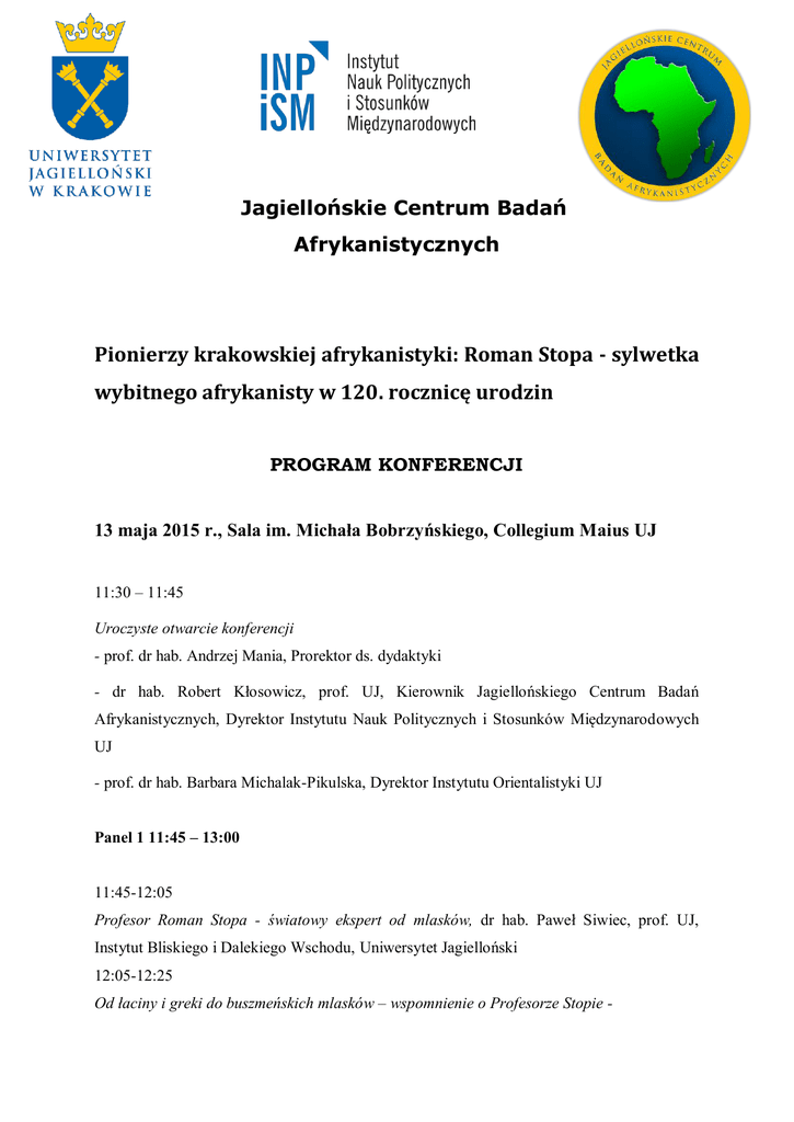 Jagiellońskie Centrum Badań Afrykanistycznych Pionierzy krakowskiej afrykanistyki: Roman Stopa - sylwetka wybitnego afrykanisty w 120. rocznicę urodzin PROGRAM KONFERENCJI 13 maja 2015 r., Sala im. Michała Bobrzyńskiego, Collegium Maius UJ 11:30 – 11:45 Uroczyste otwarcie konferencji - prof. dr hab. Andrzej Mania, Prorektor ds. dydaktyki - dr hab. Robert Kłosowicz, prof. UJ, Kierownik Jagiellońskiego Centrum Badań Afrykanistycznych, Dyrektor Instytutu Nauk Politycznych i Stosunków Międzynarodowych UJ - prof. dr hab. Barbara Michalak-Pikulska, Dyrektor Instytutu Orientalistyki UJ Panel 1 11:45 – 13:00 11:45-12:05 Profesor Roman Stopa - światowy ekspert od mlasków, dr hab. Paweł Siwiec, prof. UJ, Instytut Bliskiego i Dalekiego Wschodu, Uniwersytet Jagielloński 12:05-12:25 Od łaciny i greki do buszmeńskich mlasków – wspomnienie o Profesorze Stopie - prof. dr hab. Andrzej Pisowicz, Instytut Orientalistyki, Uniwersytet Jagielloński 12:25-12:45 Badania Romana Stopy na tle polskiej afrykanistyki - prof. dr hab. Arkadiusz Żukowski, Instytut Nauk Politycznych, Uniwersytet Warmińsko-Mazurski w Olsztynie 12:45-13:00 Dyskusja 13:00-14:00 obiad, Klub Convivium, Collegium Novum UJ Panel 2 14:00-15:40 14:00-14:20 Kilka uwag na temat aparatu pojęciowo-terminologicznego Romana Stopy, dr Arkadiusz Płonka, Instytut Orientalistyki, Uniwersytet Jagielloński 14:20-14:40 Hotentoci - uwagi etnologiczne Romana Stopy w świetle badań współczesnych – dr hab. Marcin Brocki, Instytut Etnologii i Antropologii Kulturowej, Uniwersytet Jagielloński 14:40-15:00 Afrykanistyka na Uniwersytecie Warszawskim - najważniejsze kierunki rozwoju – dr Hanna Rubinkowska-Anioł, Katedra Języków i Kultur Afryki, Uniwersytet Warszawski, przewodnicząca Polskiego Towarzystwa Afrykanistycznego 15:00-15:20 Tematyka afrykańska w badaniach profesorów Andrzeja Waligórskiego i Leszka Dzięgla – dr hab. Joanna Bar, Instytut Politologii, Uniwersytet Pedagogiczny w Krakowie 15:20-15:40 Dyskusja 15:40-16:00 przerwa kawowa, Collegium Maius UJ Panel 3 16:00 – 17:15 16:00-16:20 Exodus Afrykanów do Europy. Zagrożenie czy wyzwanie badawcze?- dr hab. Jacek Łapott, Instytut Historii i Stosunków Międzynarodowych, Uniwersytet Szczeciński 16:20-16:40 Czy po wyborach w 2015 r. nastąpił postęp w demokratyzacji Nigerii?, dr hab. Krzysztof Trzciński, prof. PAN, Instytut Kultur Śródziemnomorskich i Orientalnych Polskiej Akademii Nauk 16:40-17:00 Ewolucja senegalskiego systemu partyjnego po 1960 roku, dr Łukasz Jakubiak, Instytut Nauk Politycznych i Stosunków Międzynarodowych, Uniwersytet Jagielloński 17:00-17:15 Dyskusja 17:15-17:30 Zakończenie konferencji dr hab. Robert Kłosowicz, prof. UJ, Kierownik Jagiellońskiego Centrum Badań Afrykanistycznych, Dyrektor Instytutu Nauk Politycznych i Stosunków Międzynarodowych UJ