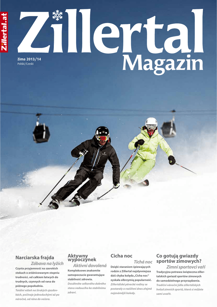 Zima 2013/14 Polski/Czeski Narciarska frajda Zábava na lyžích Czysta przyjemność na szerokich stokach o zróżnicowanym stopniu trudności, od całkiem łatwych do trudnych, czynnych od rana do późnego popołudnia. Totální vášeň na širokých sjezdovkách, počínaje jednoduchými až po náročné, od rána do večera. Aktywny wypoczynek Aktivní dovolená Kompleksowe znakomite samopoczucie gwarantujące stabilność zdrowia. Dosáhněte celkového dobrého stavu vedoucího ke stabilnímu zdraví. Cicha noc Co gotują gwiazdy Tichá noc sportów zimowych? Dzięki staraniom śpiewających rodzin z Zillertal najsłynniejsza dziś chyba kolęda „Cicha noc“ zyskała olbrzymią popularność. Zillertálské pěvecké rodiny se postaraly o rozšíření dnes zřejmě nejznámější koledy. Zimní sportovci vaří Tradycyjna potrawa świąteczna zillertalskich gwiazd sportów zimowych do samodzielnego przyrządzenia. Tradiční vánoční jídla zillertálských hvězd zimních sportů, která si můžete sami uvařit. Sport & Freizeit Sports & Leisure BMw xDrive www.bmwxdrive-guide.com www.bmw.at sheer Freude Drivingam Pleasure Fahren The new BMw winTer collecTion. BMw xDrive –The inTelligenT All-wheel-Drive sysTeM. BMW 3 Series Touring models with BMW xDrive from 135kW (184 BHP) to 225kW (306 BHP), total fuel consumption from 4.9L/100km to 7.9L/100km, CO2 emissions from 129g/km to 184g/km. Editorial Drodzy Goście! Editorial M ieszkańcy doliny Zillertal wiedzą już od niepamiętnych czasów, że narciarstwo alpejskie to „zdrowa“ dyscyplina sportu. Wiedza ta została dziś potwierdzona naukowo przez naukowców z Uniwersytetu w Salzburgu, którzy opublikowali na ten temat obszerne opracowanie. Badania naukowców podkreślają z jednej strony niewielkie ryzyko obrażeń, z drugiej zaś wszechstronny trening mięśni podczas jazdy na nartach. Zdaniem prof. dra Schobersbergera, dyrektora instytutu medycyny sportowej, wysokogórskiej i turystyki medycznej narciarstwo i związane z nim znakomite samopoczucie fizyczne, psychiczne i społeczne stanowią trwałą korzyść dla utrzymania dobrego stanu zdrowia. Zadaniem czasopisma Zillertaler Magazin jest przygotowanie nas na opisane powyżej wspaniałe odczucia poprzez prezentację zdjęć i historii, rozbudzających tęsknotę za kolejnym urlopem zimowym i pozwalających cieszyć się już w domu na jego nadejście zarówno zagorzałym zwolennikom jak i powracającym do sportu. Za aspekt zdrowotny o szczególnym znaczeniu profilaktycznym Schobersberger uznaje ciągłe zmiany pomiędzy napinaniem mięśni podczas jazdy na stoku a fazami odpoczynku w kolejkach lub na wyciągach. Więcej informacji na temat tych impulsów znajdziesz w historii „Kompleksowy aktywny urlop jako korzyść dla zdrowia“ na stronie 14. Aby konsekwentnie poprawiać stan naszego zdrowia i w pełni korzystać z urlopu narciarskiego w Zillertal, pochodzący stąd mistrz olimpijski Stefan Eberharter zaleca porcję podstawowych ćwiczeń. W tym celu przygotowaliśmy dla Was kilka wskazówek dotyczących treningów (strona 24). Jasne światło ogrzewającego zimowego słońca oraz niezrównana panorama Alp Zillertalskich i Tuxertalskich stymulują pozytywnie zarówno psychikę, jak i ducha. Pierwszych wrażeń dostarczą Wam nasze zdjęcia panoramiczne prezentowane na stronie 32. Społecznym czynnikiem jest nie tylko grupowa dynamika tego sportu lecz również refleksja i wyciszenie w nastrojowych górskich chatach. Wyżywienie składające się z regionalnych ekologicznych produktów wspomaga siłę i wytrzymałość. O tym, że podczas Bożego Narodzenia drzemią nawet najwybitniejsi sportowcy możesz przekonać się na stronie 80. Zwłaszcza podczas urlopu oczekujemy oprócz poprawy sił witalnych właściwej regeneracji nadszarpniętych sił. Liczne prywatne i publiczne instytucje oferujące spa i wellnes obiecują wspaniałe oraz ożywiające zabiegi i masaże relaksacyjne (strona 46). Jesteśmy przekonani, że dla wszystkich szukających ucieczki od dnia powszedniego i pragnących uczynić coś dla zdrowia urlop zimowy w Zillertal będzie właściwym wyborem a w przyszłości stanie się stałym elementem planów urlopowych. Milí hosté! Z Wasz Gernot illertálští věděli odedávna, že alpské lyžování je veskrze zdravý sport. Nyní to bylo vědecky potvrzeno podrobnou studií salzburgské univerzity. Výzkum zdůrazňuje u sjezdového lyžování na jedné straně malé riziko zranění a na druhé mnohostranný trénink svalů. Pro Univ. Prof. Dr. Schobersbergera, ředitele institutu pro sportovní a alpskou medicínu a zdravotní turistiku, je lyžování a s ním spojený dobrý fyzický, mentální a sociální stav dlouhodobě užitečný pro stabilní zdraví. Časopis Zillertal v tobě chce prostřednictvím fotografií a příběhů vyvolat zájem o tyto tři aspekty, získat tě pro příští zimní dovolenou a stálým hostům i těm, kteří přijedou znovu umožnit, aby ji pocítili ještě doma. Schobersberger chválí neustálé střídaná svalového napětí, sjezdovek a odpočinkových fází na lanovkách jako výjimečně preventivní zdravotní aspekt. Více se o těchto impulzech dozvíte v příběhu „Celostní aktivní dovolená jako vítězství zdraví“ na straně 14. Chcete-li neustále zlepšovat své zdraví a ve všech ohledech si užít lyžařskou dovolenou v Zillertalu, doporučuje zillertálský olympijský vítěz Stefan Eberharter základní fyzická cvičení. Sestavili jsme pro tebe tipy pro trénink (strana 24). Jasné světlo hřejivého zimního slunce nedostižné panorama Zillertálských a Tuxských Alp stimulují mysl a duši tím nejlepším způsobem. První dojmy ti přinášíme panoramatickými fotografiemi na straně 32. Kromě skupinové dynamiky lyžování tkví sociální aspekty také v ubytování v kvalitních horkých chalupách. Sílu a vytrvalost podpoří strava z regionáln