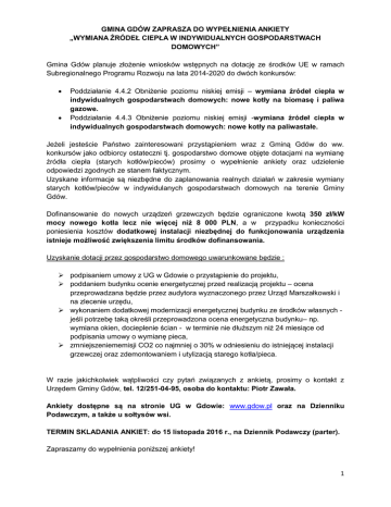 GMINA GDÓW ZAPRASZA DO WYPEŁNIENIA ANKIETY „WYMIANA ŹRÓDEŁ CIEPŁA W INDYWIDUALNYCH GOSPODARSTWACH DOMOWYCH” Gmina Gdów planuje złożenie wniosków wstępnych na dotację ze środków UE w ramach Subregionalnego Programu Rozwoju na lata 2014-2020 do dwóch konkursów: Poddziałanie 4.4.2 Obniżenie poziomu niskiej emisji – wymiana źródeł ciepła w indywidualnych gospodarstwach domowych: nowe kotły na biomasę i paliwa gazowe. Poddziałanie 4.4.3 Obniżenie poziomu niskiej emisji -wymiana źródeł ciepła w indywidualnych gospodarstwach domowych: nowe kotły na paliwastałe. Jeżeli jesteście Państwo zainteresowani przystąpieniem wraz z Gminą Gdów do ww. konkursów jako odbiorcy ostateczni tj. gospodarstwo domowe objęte dotacjami na wymianę źródła ciepła (starych kotłów/pieców) prosimy o wypełnienie ankiety oraz udzielenie odpowiedzi zgodnych ze stanem faktycznym. Uzyskane informacje są niezbędne do zaplanowania realnych działań w zakresie wymiany starych kotłów/pieców w indywidulanych gospodarstwach domowych na terenie Gminy Gdów. Dofinansowanie do nowych urządzeń grzewczych będzie ograniczone kwotą 350 zł/kW mocy nowego kotła lecz nie więcej niż 8 000 PLN, a w przypadku konieczności poniesienia kosztów dodatkowej instalacji niezbędnej do funkcjonowania urządzenia istnieje możliwość zwiększenia limitu środków dofinansowania. Uzyskanie dotacji przez gospodarstwo domowego uwarunkowane będzie : podpisaniem umowy z UG w Gdowie o przystąpienie do projektu, poddaniem budynku ocenie energetycznej przed realizacją projektu – ocena przeprowadzana będzie przez audytora wyznaczonego przez Urząd Marszałkowski i na zlecenie urzędu, wykonaniem dodatkowej modernizacji energetycznej budynku ze środków własnych jeśli potrzebę taką określi przeprowadzona ocena energetyczna budynku– np. wymiana okien, docieplenie ścian - w terminie nie dłuższym niż 24 miesiące od podpisania umowy o wymianę pieca, zmniejszeniememisji CO2 co najmniej o 30% w odniesieniu do istniejącej instalacji grzewczej oraz zdemontowaniem i utylizacją starego kotła/pieca. W razie jakichkolwiek wątpliwości czy pytań związanych z ankietą, prosimy o kontakt z Urzędem Gminy Gdów, tel. 12/251-04-95, osoba do kontaktu: Piotr Zawała. Ankiety dostępne są na stronie UG w Gdowie: www.gdow.pl oraz na Dzienniku Podawczym, a także u sołtysów wsi. TERMIN SKLADANIA ANKIET: do 15 listopada 2016 r., na Dziennik Podawczy (parter). Zapraszamy do wypełnienia poniższej ankiety! 1 ANKIETA „WYMIANA ŹRÓDEŁ CIEPŁA W INDYWIDUALNYCH GOSPODARSTWACH DOMOWYCH” Imię i nazwisko Adres (miejscowość, nr domu) Nr telefonu Nr ewidencyjny działki Proszę zaznaczyć X przy właściwej odpowiedzi i podać wymagane dane. Budynek: Jednorodzinny Bliźniak lub szeregowiec Mieszkanie w budynku wielorodzinnym Liczba mieszkańców w budynku: Rok budowy, materiał ścian budynku: Powierzchnia ogrzewana budynku (m2): Ocieplenie ścian: TAK NIE 2 Ocieplenie dachu/stropodachu: TAK NIE Okna: Stare Nowe PCV Drewno Źródło ciepła budynku: Ogrzewanie centralne (instalacja c.o.) na paliwo stałe Ogrzewanie centralne (instalacja c.o.) na gaz Ogrzewanie w poszczególnych pomieszczeniach np. kuchni, pokojach (piece kaflowe, metalowe w pokojach, in.) Stan techniczny źródła ciepła: Dobry Dostateczny .Zły Moc obecnego kotła/pieca [kW] : Dane o mocy kotła/pieca powinny znajdować się na jego tabliczce znamionowej. Rok produkcji kotła/pieca: Dane powinny znajdować się na tabliczce znamionowej. Jeśli rok jest nieznany, proszę wpisać rok montażu, lub pozostawić puste pole. 3 Przygotowanie ciepłej wody poprzez: Kocioł/piec Piecyk gazowy Bojler elektryczny Kolektory słoneczne Inne: Paliwo/energia stosowane do ogrzewania budynku i/lub przygotowania ciepłej wody: Węgiel (w tym miał)Kocioł/piec Ekogroszek Piecyk gazowy .Gaz z sieci .Gaz z butli .Olej opałowy Kocioł/piec Biomasa/drewno Piecyk gazowy Energia Elektryczna Bojler elektryczny Kolektory słoneczne Inne: Jeśli paliwem jest biomasa/drewno, proszę podać źródło w jakim jest spalane: Kominek Kocioł z podajnikiem Inne: Proszę podać roczne zużycie paliwa/energii *: Średnie roczne zużycie paliwa do ogrzewania budynku i przygotowania ciepłej wody z ostatnich trzech lat (tony/m3/GJ/kWh) 4 Stosuję źródło wykorzystujące odnawialną energię (OZE): np. kolektory słoneczne, pompę ciepła, ogniwa fotowoltaiczne. Jeśli tak, proszę wpisać jakie ..Nie ..Tak Jakie: Czy planują Państwo termomodernizacje budynku w najbliższym czasie? ..Nie ..Tak Jeśli tak, w jakim zakresie? Można zaznaczyć więcej, niż jeden zakres. Wymiana starego kotła/pieca na nowy Montaż pompy ciepła .Montaż kolektorów słonecznych .Ocieplenie ścian zewnętrznych .Ocieplenie stropu/dachu/stropodachu Wymiana okien i drzwi Inne: Na jakie źródło ciepła planowana jest wymiana starego kotła /pieca? ...Na biomasę ...Na gaz ...Na paliwo stałe Jakiej mocy będzie nowy kocioł/piec (w kW)? 5 Czy wraz z wymianą kotła/pieca konieczna będzie dodatkowa instalacja ? ..Nie ..Tak Jeśli tak, to jaki jest szacowany koszt tej instalacji w zł? Wyrażam wolę poddania budynku ocenie energetycznej przeprowadzonej przez zewnętrznego audytora energetycznego przed realizacją projektu oraz po jego zakończeniu oraz wykonanie zaleceń wskazanych w ww. ocenie. Wyrażam wolę zawarcia umowy z Gminą Gdów o pozyskanie dotacji na wymianę starego źródła ciepła w moim gospodarstwie domowym zgodnie z zasadami danego konkursu. UWAGA: Zgodnie z art. 23 ust. 1 pkt 1 ustawy z dnia 29 sierpnia 1997r. o ochronie danych osobowych (Dz. U. z 2015 r. poz. 2135, z późn. zm.) informuję, że: 1. Administratorem Państwa danych osobowych jest Gmina Gdów. 2. Państwa dane osobowe przetwarzane będą w celu uzyskania dofinansowania na zadania związane z ograniczeniem niskiej emisji w Gminie Gdów. 3. Posiadają Państwo prawo dostępu do treści swo