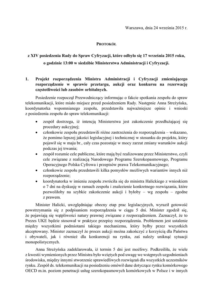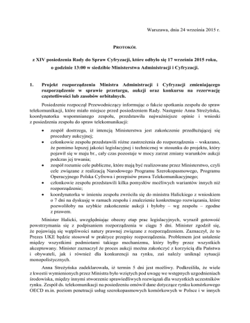 Warszawa, dnia 24 września 2015 r. PROTOKÓŁ z XIV posiedzenia Rady do Spraw Cyfryzacji, które odbyło się 17 września 2015 roku, o godzinie 13:00 w siedzibie Ministerstwa Administracji i Cyfryzacji. 1. Projekt rozporządzenia Ministra Administracji i Cyfryzacji zmieniającego rozporządzenie w sprawie przetargu, aukcji oraz konkursu na rezerwację częstotliwości lub zasobów orbitalnych. Posiedzenie rozpoczął Przewodniczący informując o fakcie spotkania zespołu do spraw telekomunikacji, które miało miejsce przed posiedzeniem Rady. Następnie Anna Streżyńska, koordynatorka wspomnianego zespołu, przedstawiła najważniejsze opinie i wnioski z posiedzenia zespołu do spraw telekomunikacji: zespół dostrzega, iż intencją Ministerstwa jest zakończenie przedłużającej się procedury aukcyjnej; członkowie zespołu przedstawili różne zastrzeżenia do rozporządzenia – wskazano, że pomimo lepszej jakości legislacyjnej i technicznej w stosunku do projektu, który pojawił się w maju br., cały czas pozostaje w mocy zarzut zmiany warunków aukcji podczas jej trwania; zespół rozumie cele publiczne, które mają być realizowane przez Ministerstwo, czyli cele związane z realizacją Narodowego Programu Szerokopasmowego, Programu Operacyjnego Polska Cyfrowa i przepisów prawa Telekomunikacyjnego; członkowie zespołu przedstawili kilka pomysłów możliwych wariantów innych niż rozporządzenie; koordynatorka w imieniu zespołu zwróciła się do ministra Halickiego z wnioskiem o 7 dni na dyskusję w ramach zespołu i znalezienie konkretnego rozwiązania, które pozwoliłoby na szybkie zakończenie aukcji i byłoby – wg zespołu – zgodne z prawem. Minister Halicki, uwzględniając obecny etap prac legislacyjnych, wyraził gotowość powstrzymania się z podpisaniem rozporządzenia w ciągu 5 dni. Minister zgodził się, że pojawiają się wątpliwości natury prawnej związane z rozporządzeniem. Zaznaczył, że to Prezes UKE będzie stosował w praktyce przepisy rozporządzenia. Problemem jest ustalenie między wszystkimi podmiotami takiego mechanizmu, który byłby przez wszystkich akceptowany. Minister zaznaczył że proces aukcji można zakończyć z korzyścią dla Państwa i obywateli, jak i również dla konkurencji na rynku, zaś należy uniknąć sytuacji monopolistycznych. Anna Streżyńska zadeklarowała, iż termin 5 dni jest możliwy. Podkreśliła, że wiele z kwestii wymienionych przez Ministra było wziętych pod uwagę we wstępnych uzgodnieniach środowiska, między innymi stworzenie sprawiedliwych rozwiązań dla wszystkich uczestników rynku. Zespół ds. telekomunikacji na posiedzeniu omówił dane dotyczące rynku komórkowego OECD m.in. poziom penetracji usług szerokopasmowych komórkowych w Polsce i w innych krajach. Zespół bardzo zaniepokoił fakty, że od 2012 roku spada liczba klientów usług szerokopasmowych komórkowych w Polsce. W tym samym czasie w innych krajach podobnych do Polski, takich jak Hiszpania i Włochy, które nie są skupione strategicznie na Internecie, notowany jest wzrost do kilku milionów rocznie. W ocenie jednego z członków zespołu prawdopodobną przyczyną spadku zainteresowania jest cena usług, a celem graczy rynkowych jest osiągnięcie budowy Internetu szerokopasmowego, zwiększenie penetracji i obniżenie cen oraz danie jak najlepszej możliwości widma. Koordynatorka w imieniu zespołu wyraziła obawę, że projektowane rozporządzenie może doprowadzić do wieloletnich procesów sądowych, które uniemożliwią efektywne zaoferowanie tych usług. Koordynatorka potwierdziła, że za 5 dni zespół wypracuje swoje stanowisko, inne niż rozporządzenie i przedstawi je ministrowi Halickiemu. 2. Projekt ustawy o świadczeniu usług drogą elektroniczną (UŚUDE). Przewodniczący poinformował, że ze względu na duże rozbieżności wśród członków Rady pomysł przygotowania wyjściowego projektu UŚUDE do prac legislacyjnych nie powiódł się. Przewodniczący zaproponował stworzenie grupy, która wspólnie opracuje wspólne stanowisko, o które poprosił Radę minister Halicki. Przewodniczący zaproponował, aby w pracach zespołu wzięli udział członkowie Rady, którzy zgłosili uwagi: Katarzyna Szymielewicz, Elżbieta Traple, Agata Wacławik-Wejman i Aleksander Tarkowski oraz inni zainteresowani członkowie. Piotr Waglowski wyraził chęć przystąpienia do prac nad UŚUDE. Minister Drop wskazał, że formalnie UŚUDE jest w wykazie prac legislacyjnych oraz nawiązał do prac na forum europejskim stwierdzając, że materiał przygotowany przez Radę mógłby stanowić jej wkład do dyskusji europejskiej. Dyskusja nad projektem może być częścią dyskusji europejskiej dotyczącej dyrektywy w sprawie e-commerce i o tym należy pamiętać. 3. Projekt ustawy o ponownym wykorzystywaniu informacji sektora publicznego (re-use). Minister Halicki oświadczył, że projekt ustawy jest w bardzo dobrym punkcie – wszystkie rozbieżności na etapie uzgodnień międzyresortowych zostały usunięte. Przewodniczący wyraził pogląd, że Rada wyraża zadowolenie z przedstawionych informacji. Zaznaczył równocześnie, że Rada podjęła uchwałę w tej sprawie wskazując m.in. potrzebę szerokiej nowelizacji. Przyznał też, że nie ma obecnie ku temu warunków. Minister Drop wskazał, że zgodnie z zasadą o dyskontynuacji prac parlamentu, zakończenie prac w ramach Rady Ministrów i przesłanie projektu do Sejmu spowodowałoby jego automatyczne odrzucenie i zanegowanie wszystkich dotychczasowych prac. Z tego powodu Ministerstwo planuje w tej kadencji zakończyć na etapie przyjęcia przez Komitet Stały RM, tak by nowa Rada Ministrów mogła go niezwłocznie przyjąć i przesłać do Sejmu następnej kadencji. 4. Open Government Partnership (OGP). Minister Andrzej Halicki stwierdził, że do podjęcia stosownej uchwały przez Radę Ministrów w tej sprawie potrzebny jest plan i w jego opinii Rada jest o