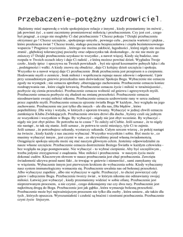 Przebaczenie–potężny uzdrowiciel. Będziemy mieć naprawdę o wiele spokojniejsze relacje z innymi , kiedy przestaniemy im mówić , jak powinni żyć , a sami zaczniemy promieniować miłością i przebaczeniem. Czy jest coś , czego byś pragnął , a czego nie mogłoby Ci dać przebaczenie ? Chcesz pokoju ? Dzięki przebaczeniu otrzymasz go ! Chcesz szczęścia , spokojnego umysłu , pewnego celu , poczucia wartości i piękna , które przekracza świat ? Chcesz troski, stałego poczucia bezpieczeństwa i ciepła bezinteresownego wsparcia ? Pragniesz wyciszenia , którego nie można zakłócić, łagodności , której nigdy nie można zranić , głębokiej tolerancyjnej pociechy oraz odpoczynku tak doskonałego , że nic nie może go zniszczy ć? Dzięki przebaczeniu uzyskasz to wszystko , a nawet więcej. Kiedy się budzisz, ono rozpala w Twoich oczach iskry i daje Ci radość , z którą możesz powitać dzień. Wygładza Twoje czoło , kiedy śpisz i spoczywa na Twoich powiekach , byś nie ujrzał koszmarów pełnych lęku i zła , podstępności i walki. A kiedy znowu się obudzisz , daje Ci kolejny dzień szczęścia i spokoju. Wszystko to a nawet więcej daje Ci przebaczenie .Brak przebaczenia jest przepisem n a cierpienie. Hodowanie myśli o zemście , brak miłości i współczucia rujnuje nasze zdrowie i odporność. Upór przy uzasadnionym gniewie przeszkadza nam doświadczać Spokoju Boga. Wybaczenie nie oznacza zgody na występek ; nie oznacza aprobaty ,oburzającego zachowania. Przebaczenie oznacza koniec rozdrapywania ran , które ciągle krwawią. Przebaczenie oznacza życie i miłość w teraźniejszości , pozbycie się cienia przeszłości. Przebaczenie oznacza wolność od gniewu i agresywnych myśli. Przebaczenie oznacza pozbycie się złudzeń na zmianę przeszłości. Przebaczenie oznacza nieodmawianie swojej miłości nikomu. Przebaczenie oznacza uzdrowienie rany w sercu zadanej przez zapiekłe myśli. Przebaczenie oznacza ujrzenie światła Boga W każdym , bez względu na jego zachowanie. Przebaczenie nie jest tylko dla innych – ale dla nas,.Dla błędów , które popełniliśmy .Dla winy i wstydu, w których z uporem trwamy. Wybaczyć w jednej chwili oznacza zamknięcie Klubu Zwlekających. Przebaczenie otwiera drzwi dla ducha , byśmy czuli się jednym ze wszystkimi i wszystkim w Bogu. By wybaczyć - nigdy nie jest zbyt wcześnie. By wybaczyć nigdy nie jest zbyt późno. Ile potrzeba na to czasu ? To zależy od Ciebie. Jeśli uznasz , że to nigdy nie nastąpi , to tak się stanie. Jeśli uznasz , że potrwa to sześć miesięcy, tyle Ci to zajmie. Jeśli uznasz , że potrzebujesz sekundy, wystarczy sekunda. Całym sercem wierzę , że pokój nastąpi na świecie , kiedy każdy z nas zacznie wybaczać .Wszystko wszystkim i sobie. Być może to , co musimy wybaczyć innym , jest czymś w nas , co skrywaliśmy przed własną świadomością. Osiągnięcie spokoju umysłu może się stać naszym głównym celem. Jesteśmy odpowiedzialni za nasze własne szczęście. Przebaczenie oznacza dostrzeżenie Bożego Światła w każdym człowieku bez względu na jego postępowanie. Nie wybaczyć - to wybrać cierpienie. Aby być szczęśliwym , trzeba jedynie zrezygnować z osądzania. Moc miłości i przebaczenia w naszym życiu może dokonać cudów. Kluczowym słowem w nauce przebaczania jest chęć przebaczenia. Zawzięta świadomość ukrywa przed nami fakt , że trwając w gniewie i nienawiści , sami zamykamy się w więzieniu. Wybaczenie innym jest pierwszym krokiem do wybaczenia sobie. Kiedy wybaczamy nasz system immunologiczny wzmacnia się. Przebaczenie uwalnia nas od bolesnej przeszłości. Albo wybaczysz zupełnie , albo nie wybaczysz w ogóle. Przebaczyć , to chcieć powierzyć cały gniew i udręczenie Bogu. Przebaczenie tworzy świat , w którym nikomu nie odmawiamy swojej miłości. Łatwiej jest wybaczyć , kiedy przestaniemy widzieć w sobie ofiarę. Przebaczenie jest nieprzerwanym procesem, a nie czymś , czego dokonujemy raz czy dwa razy. Przebaczenie jest najkrótszą drogą do Boga. Przebaczenie jest jak gąbka , która wymazuje bolesną przeszłość. Przebaczenie może być najważniejszym procesem nie tylko dla osoby , która umiera , ale także dla tych , których opuszcza. Wyrozumiałość i czułość są braćmi i siostrami przebaczenia. Przebaczenie czyni życie lżejszym.