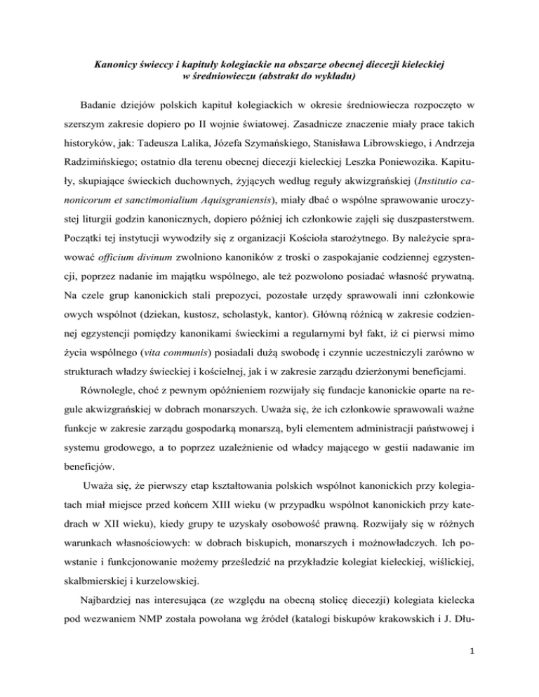 Kanonicy świeccy i kapituły kolegiackie na obszarze obecnej diecezji kieleckiej w średniowieczu (abstrakt do wykładu) Badanie dziejów polskich kapituł kolegiackich w okresie średniowiecza rozpoczęto w szerszym zakresie dopiero po II wojnie światowej. Zasadnicze znaczenie miały prace takich historyków, jak: Tadeusza Lalika, Józefa Szymańskiego, Stanisława Librowskiego, i Andrzeja Radzimińskiego; ostatnio dla terenu obecnej diecezji kieleckiej Leszka Poniewozika. Kapituły, skupiające świeckich duchownych, żyjących według reguły akwizgrańskiej (Institutio canonicorum et sanctimonialium Aquisgraniensis), miały dbać o wspólne sprawowanie uroczystej liturgii godzin kanonicznych, dopiero później ich członkowie zajęli się duszpasterstwem. Początki tej instytucji wywodziły się z organizacji Kościoła starożytnego. By należycie sprawować officium divinum zwolniono kanoników z troski o zaspokajanie codziennej egzystencji, poprzez nadanie im majątku wspólnego, ale też pozwolono posiadać własność prywatną. Na czele grup kanonickich stali prepozyci, pozostałe urzędy sprawowali inni członkowie owych wspólnot (dziekan, kustosz, scholastyk, kantor). Główną różnicą w zakresie codziennej egzystencji pomiędzy kanonikami świeckimi a regularnymi był fakt, iż ci pierwsi mimo życia wspólnego (vita communis) posiadali dużą swobodę i czynnie uczestniczyli zarówno w strukturach władzy świeckiej i kościelnej, jak i w zakresie zarządu dzierżonymi beneficjami. Równolegle, choć z pewnym opóźnieniem rozwijały się fundacje kanonickie oparte na regule akwizgrańskiej w dobrach monarszych. Uważa się, że ich członkowie sprawowali ważne funkcje w zakresie zarządu gospodarką monarszą, byli elementem administracji państwowej i systemu grodowego, a to poprzez uzależnienie od władcy mającego w gestii nadawanie im beneficjów. Uważa się, że pierwszy etap kształtowania polskich wspólnot kanonickich przy kolegiatach miał miejsce przed końcem XIII wieku (w przypadku wspólnot kanonickich przy katedrach w XII wieku), kiedy grupy te uzyskały osobowość prawną. Rozwijały się w różnych warunkach własnościowych: w dobrach biskupich, monarszych i możnowładczych. Ich powstanie i funkcjonowanie możemy prześledzić na przykładzie kolegiat kieleckiej, wiślickiej, skalbmierskiej i kurzelowskiej. Najbardziej nas interesująca (ze względu na obecną stolicę diecezji) kolegiata kielecka pod wezwaniem NMP została powołana wg źródeł (katalogi biskupów krakowskich i J. Dłu1 gosz) do życia za rządów biskupa krakowskiego Gedki (1171), który ufundował nowy kościół, przenosząc do niego kanoników osadzonych pierwotnie przy kościele św. Wojciecha, będącego najstarszą kielecką parafią. Z jej uposażenia powstały początkowo 4 prebendy: 2 prałackie i 2 kanonickie. Nie można jednak wykluczyć, że fundacja była monarsza (prepozyt i kilku kanoników), a zatem wcześniejsza, i przeszła na biskupstwo krakowskie wraz z nadaniem całego kompleksu dóbr w rejonie Gór Świętokrzyskich. Na koniec XII lub początek XIII stulecia kładzie się reorganizację tejże grupy kanonickiej i powstanie kolejnych prebend. Rozwój kieleckiej korporacji potwierdza dokument z 1229 roku (KMog., nr 9), w którym spotykamy dziekana, scholastyka, kustosza, dalszych trzech kanoników i siedmiu wikariuszy, którzy zastępowali kanoników w ich obowiązkach liturgicznych, zatem mamy pewność, że istniała wówczas także prebenda prepozyta. Dzięki wykazom świętopietrza z lat 1325-1327 znamy uposażenie prebend (prepozyt, dziekan, scholastyk, kustosz i 6 kanoników) kieleckich i miejscową precedencję: pierwszą godnością w kapitule była dziekania, której posiadacz pełnił funkcje archidiakońską w okręgu radomskim (dziekania radomska), a dopiero kolejną prepozytura. Józef Szymański przekonująco przedstawił obowiązki kanoników kieleckich w zakresie zarządu dobrami biskupimi w rejonie Gór Świętokrzyskich i w administracji kościelnej na obszarze dziekanii radomskiej oraz prepozytury kieleckiej. Kapituła miejscowa była jedna z ważniejszych w skali całego kraju, w Małopolsce wyprzedzały ją jedynie sandomierska i wiślicka. Jednocześnie kanonicy tutejsi odgrywali stałą i ważną rolę w zakresie curam animarum, gdyż zarówno w Kielcach, jak i w Wiślicy, Skalbmierzu i Kurzelowie, kolegiaty były parafiami. Równie niebagatelna rola przypadła zgromadzeniom kanonickim ze względu na wykształcenie i formację intelektualną członków tych korporacji, częstokroć obcego – romańskiego pochodzenia; jak i prałaturę scholastyka odpowiedzialnego za prowadzenie nauczania. Jej znaczenie podkreśla nie nazbyt wysokie uposażenie; prepozyt i scholastyk uzyskiwali niższe dochody niż większość ich odpowiedników w innych małopolskich kapitułach, a zatem nie uposażenie, ale prestiż i starożytność fundacji odgrywały rolę. Kolegiata kurzelowska również powstała w centrum dóbr biskupich i podobnie, jak w Kielcach przy kościele pod wezwaniem św. Wojciecha, co mogło mieć miejsce pod koniec XII wieku. Do nowej świątyni o maryjnym patrocinium (Wniebowzięcia NMP) przeniósł kapitułę biskup Jarosław Bogoria Skotnicki (1364?). Początkowo zgromadzenie liczyło sze2 ściu kanoników, później z powodu niskiego uposażenia zmniejszono je do trzech prałatur: prepozytury, dziekanii i kustodii. W miarę upływu czasu dofundowano archidiakonię i scholasterię. Podobnie, jak w Kielcach, obowiązki duszpasterskie w parafii wymusiły zaangażowanie wikarych – zastępców prebendarzy kanonickich. Istotną rolę odgrywał archidiakon – wizytował parafie w okręgu, którego centrum był Kurzelów. Kolegiata wiślicka powstała w okresie rozbicia dzielnicowego i można ją zaliczyć do fundacji monarszych w stolicach księstw dzielnicowych. Wówczas nastąpił rozkwit fundacji kanonickich na ziemiach polski