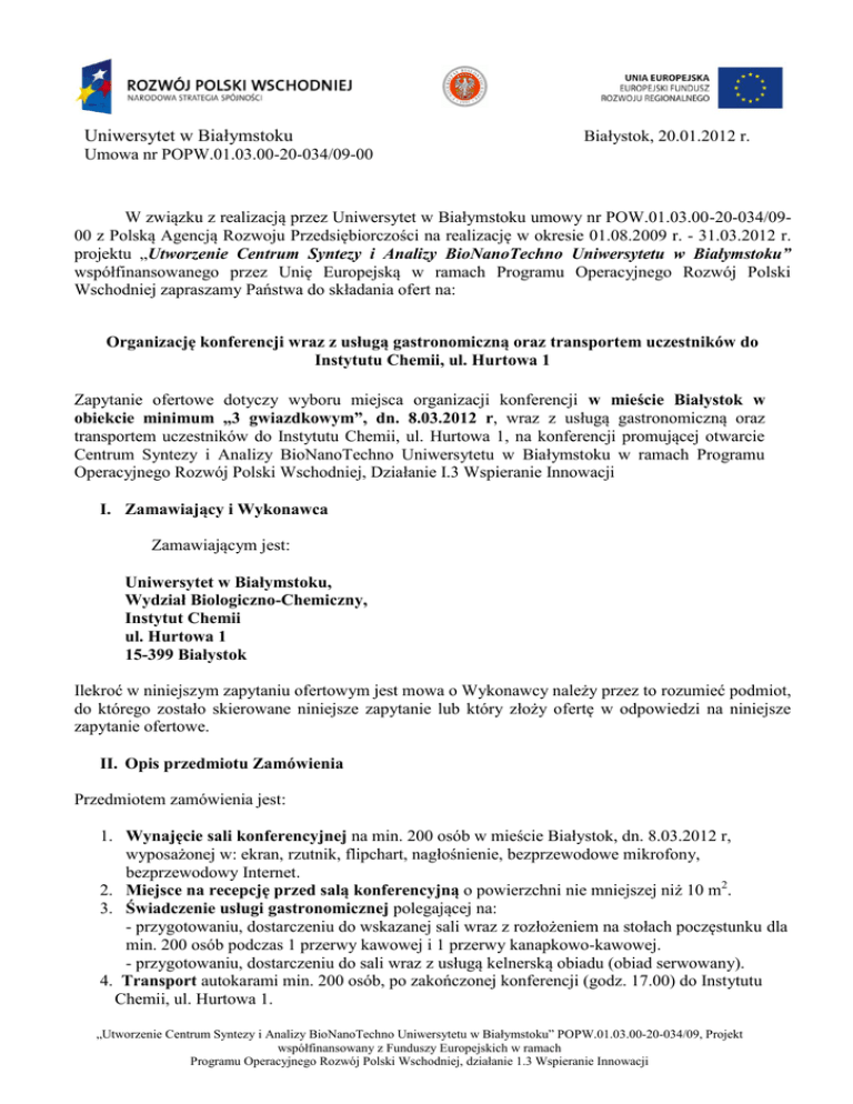 Uniwersytet w Białymstoku Białystok, 20.01.2012 r. Umowa nr POPW.01.03.00-20-034/09-00 W związku z realizacją przez Uniwersytet w Białymstoku umowy nr POW.01.03.00-20-034/0900 z Polską Agencją Rozwoju Przedsiębiorczości na realizację w okresie 01.08.2009 r. - 31.03.2012 r. projektu „Utworzenie Centrum Syntezy i Analizy BioNanoTechno Uniwersytetu w Białymstoku” współfinansowanego przez Unię Europejską w ramach Programu Operacyjnego Rozwój Polski Wschodniej zapraszamy Państwa do składania ofert na: Organizację konferencji wraz z usługą gastronomiczną oraz transportem uczestników do Instytutu Chemii, ul. Hurtowa 1 Zapytanie ofertowe dotyczy wyboru miejsca organizacji konferencji w mieście Białystok w obiekcie minimum „3 gwiazdkowym”, dn. 8.03.2012 r, wraz z usługą gastronomiczną oraz transportem uczestników do Instytutu Chemii, ul. Hurtowa 1, na konferencji promującej otwarcie Centrum Syntezy i Analizy BioNanoTechno Uniwersytetu w Białymstoku w ramach Programu Operacyjnego Rozwój Polski Wschodniej, Działanie I.3 Wspieranie Innowacji I. Zamawiający i Wykonawca Zamawiającym jest: Uniwersytet w Białymstoku, Wydział Biologiczno-Chemiczny, Instytut Chemii ul. Hurtowa 1 15-399 Białystok Ilekroć w niniejszym zapytaniu ofertowym jest mowa o Wykonawcy należy przez to rozumieć podmiot, do którego zostało skierowane niniejsze zapytanie lub który złoży ofertę w odpowiedzi na niniejsze zapytanie ofertowe. II. Opis przedmiotu Zamówienia Przedmiotem zamówienia jest: 1. Wynajęcie sali konferencyjnej na min. 200 osób w mieście Białystok, dn. 8.03.2012 r, wyposażonej w: ekran, rzutnik, flipchart, nagłośnienie, bezprzewodowe mikrofony, bezprzewodowy Internet. 2. Miejsce na recepcję przed salą konferencyjną o powierzchni nie mniejszej niż 10 m2. 3. Świadczenie usługi gastronomicznej polegającej na: - przygotowaniu, dostarczeniu do wskazanej sali wraz z rozłożeniem na stołach poczęstunku dla min. 200 osób podczas 1 przerwy kawowej i 1 przerwy kanapkowo-kawowej. - przygotowaniu, dostarczeniu do sali wraz z usługą kelnerską obiadu (obiad serwowany). 4. Transport autokarami min. 200 osób, po zakończonej konferencji (godz. 17.00) do Instytutu Chemii, ul. Hurtowa 1. „Utworzenie Centrum Syntezy i Analizy BioNanoTechno Uniwersytetu w Białymstoku” POPW.01.03.00-20-034/09, Projekt współfinansowany z Funduszy Europejskich w ramach Programu Operacyjnego Rozwój Polski Wschodniej, działanie 1.3 Wspieranie Innowacji W ofercie składanej przez Wykonawcę powinno znaleźć się proponowane za wskazaną cenę menu. Wykonawca zobowiązany jest do dostarczenia własnych naczyń, sztućców i wszystkich pozostałych elementów wymaganych do prawidłowej realizacji usługi cateringu, jak również uprzątnięcia każdorazowo pomieszczenie po zakończeniu szkolenia. Zaplanowana liczba posiłków może ulec zmianie ze względu na zmianę liczby uczestników konferencji. W ramach zamówienia Wykonawca jest zobowiązany do: świadczenia usług gastronomicznych wyłącznie przy użyciu produktów spełniających normy jakości produktów spożywczych, przestrzegania przepisów prawnych w zakresie przechowywania i przygotowywania artykułów spożywczych (m. in. ustawy z dnia 25 sierpnia 2006 r. o bezpieczeństwie żywności i żywienia Dz. U. nr 171 poz. 1125 ze zm.). Wykonawca otrzyma wynagrodzenie za faktycznie przygotowane i wydane posiłki. Warunkiem otrzymania wynagrodzenia przez Wykonawcę jest przedłożona, poprawnie wystawiona faktura VAT. Specyfikacja usługi gastronomicznej powinna w szczególności składać się z: Pierwsza przerwa kawowo-kanapkowa: 1) Gorące napoje (kawa, herbata, mleczko do kawy, cytryna do herbaty, cukier) 2) Napoje zimne (woda mineralna gazowana i niegazowana w butelkach, soki owocowe) 3) Ciasto pieczone (min. 3 rodzaje ciasta pieczonego) 4) Kanapki dekoracyjne (min. 2 kanapki na osobę) i zimne przekąski (menu proponuje Wykonawca) Druga przerwa kawowa: 1) Gorące napoje (kawa, herbata, mleczko do kawy, cytryna do herbaty, cukier) 2) Napoje zimne (woda mineralna gazowana i niegazowana w butelkach, soki owocowe) 3) Ciasto pieczone (min. 3 rodzaje ciasta pieczonego) Obiad serwowany: 1) Zupa (menu proponuje Wykonawca) 2) Danie drugie, serwowane na ciepło: danie mięsne, ziemniaki, surówka (menu proponuje Wykonawca). 3) Gorące napoje (kawa, herbata, mleczko do kawy, cytryna do herbaty, cukier) 4) Napoje zimne (woda mineralna gazowana i niegazowana w butelkach, soki owocowe) III. Warunki niezbędne do spełnienia przez Wykonawcę Zamówienie może zostać udzielone Wykonawcy, o ile: a) posiada on uprawnienie do wykonywania określonej działalności lub czynności, jeżeli przepisy prawa nakładają obowiązek ich posiadania; „Utworzenie Centrum Syntezy i Analizy BioNanoTechno Uniwersytetu w Białymstoku” POPW.01.03.00-20-034/09, Projekt współfinansowany z Funduszy Europejskich w ramach Programu Operacyjnego Rozwój Polski Wschodniej, Działanie I.3 Wspieranie Innowacji b) posiada odpowiednią wiedzę i doświadczenie oraz sytuację finansową gwarantującą wykonanie zamówienia; c) dysponuje odpowiednim potencjałem technicznych oraz zasobami ludzkimi do wykonania zamówienia. IV. Opis sposobu przygotowania oferty Oferta powinna być przygotowana na papierze firmowym lub formularzu ofertowym, opatrzona pieczątką firmową i podpisana przez osobę upoważnioną (zgodnie z KRS lub innym właściwym dokumentem). Osoba uprawniona do porozumienia z wykonawcą: Marta Płońska-Brzezińska tel. 85 745 7816 [email protected] V. Opis sposobu dostarczenia oferty Oferty należy dostarczyć do siedziby zamawiającego: Uniwersytet w Białymstoku, Wydział Biologiczno-Chemiczny, Instytut Chemii ul. Hurtowa 1 15-399 Białystok [email protected] za pośrednictwem e-maila lub osobiście do dnia 01.02.2012 do godz. 15.00 VI. Kryteria oceny oferty W ofercie należy podać kwotę brutto zamówienia. Kryterium branym pod uwag
