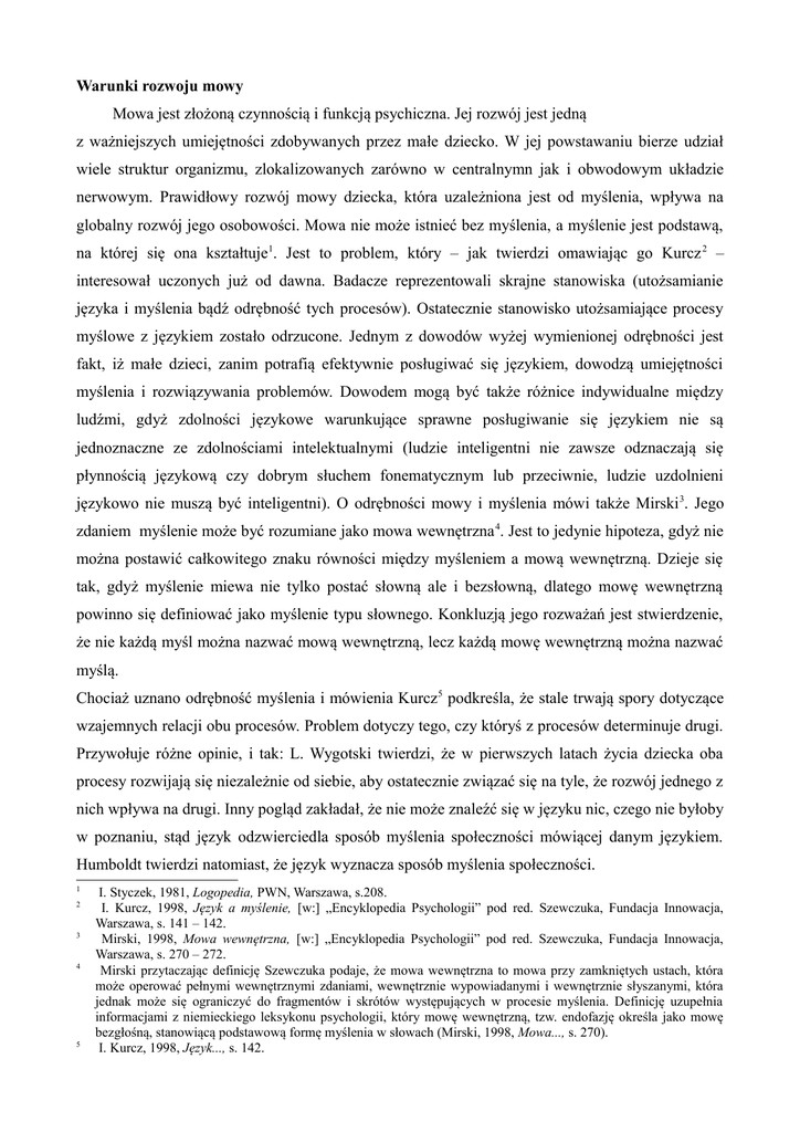 Warunki rozwoju mowy Mowa jest złożoną czynnością i funkcją psychiczna. Jej rozwój jest jedną z ważniejszych umiejętności zdobywanych przez małe dziecko. W jej powstawaniu bierze udział wiele struktur organizmu, zlokalizowanych zarówno w centralnymn jak i obwodowym układzie nerwowym. Prawidłowy rozwój mowy dziecka, która uzależniona jest od myślenia, wpływa na globalny rozwój jego osobowości. Mowa nie może istnieć bez myślenia, a myślenie jest podstawą, na której się ona kształtuje1. Jest to problem, który – jak twierdzi omawiając go Kurcz 2 – interesował uczonych już od dawna. Badacze reprezentowali skrajne stanowiska (utożsamianie języka i myślenia bądź odrębność tych procesów). Ostatecznie stanowisko utożsamiające procesy myślowe z językiem zostało odrzucone. Jednym z dowodów wyżej wymienionej odrębności jest fakt, iż małe dzieci, zanim potrafią efektywnie posługiwać się językiem, dowodzą umiejętności myślenia i rozwiązywania problemów. Dowodem mogą być także różnice indywidualne między ludźmi, gdyż zdolności językowe warunkujące sprawne posługiwanie się językiem nie są jednoznaczne ze zdolnościami intelektualnymi (ludzie inteligentni nie zawsze odznaczają się płynnością językową czy dobrym słuchem fonematycznym lub przeciwnie, ludzie uzdolnieni językowo nie muszą być inteligentni). O odrębności mowy i myślenia mówi także Mirski 3. Jego zdaniem myślenie może być rozumiane jako mowa wewnętrzna 4. Jest to jedynie hipoteza, gdyż nie można postawić całkowitego znaku równości między myśleniem a mową wewnętrzną. Dzieje się tak, gdyż myślenie miewa nie tylko postać słowną ale i bezsłowną, dlatego mowę wewnętrzną powinno się definiować jako myślenie typu słownego. Konkluzją jego rozważań jest stwierdzenie, że nie każdą myśl można nazwać mową wewnętrzną, lecz każdą mowę wewnętrzną można nazwać myślą. Chociaż uznano odrębność myślenia i mówienia Kurcz5 podkreśla, że stale trwają spory dotyczące wzajemnych relacji obu procesów. Problem dotyczy tego, czy któryś z procesów determinuje drugi. Przywołuje różne opinie, i tak: L. Wygotski twierdzi, że w pierwszych latach życia dziecka oba procesy rozwijają się niezależnie od siebie, aby ostatecznie związać się na tyle, że rozwój jednego z nich wpływa na drugi. Inny pogląd zakładał, że nie może znaleźć się w języku nic, czego nie byłoby w poznaniu, stąd język odzwierciedla sposób myślenia społeczności mówiącej danym językiem. Humboldt twierdzi natomiast, że język wyznacza sposób myślenia społeczności. 1 2 3 4 5 I. Styczek, 1981, Logopedia, PWN, Warszawa, s.208. I. Kurcz, 1998, Język a myślenie, [w:] „Encyklopedia Psychologii” pod red. Szewczuka, Fundacja Innowacja, Warszawa, s. 141 – 142. Mirski, 1998, Mowa wewnętrzna, [w:] „Encyklopedia Psychologii” pod red. Szewczuka, Fundacja Innowacja, Warszawa, s. 270 – 272. Mirski przytaczając definicję Szewczuka podaje, że mowa wewnętrzna to mowa przy zamkniętych ustach, która może operować pełnymi wewnętrznymi zdaniami, wewnętrznie wypowiadanymi i wewnętrznie słyszanymi, która jednak może się ograniczyć do fragmentów i skrótów występujących w procesie myślenia. Definicję uzupełnia informacjami z niemieckiego leksykonu psychologii, który mowę wewnętrzną, tzw. endofazję określa jako mowę bezgłośną, stanowiącą podstawową formę myślenia w słowach (Mirski, 1998, Mowa..., s. 270). I. Kurcz, 1998, Język..., s. 142. Język i myślenie – jak twierdzi Teresa Hejnicka – Bezwińska6 - to odrębne kompetencje poznawcze podlegające niezależnym prawidłowościom, łączy je jednak to, że obydwie związane są z pracą mózgu i wzajemnie na siebie wpływają. W procesie poznania pojęcia występują w postaci „półfabrykantów” - twierdzą Ożdżyński i Surowaniec7 a człowiek [ucząc się języka] chwyta je znakowo w momencie ich kształtowania się. Takie terminy (zwane też określeniami) miewają zmienne znaczenia, gdyż ta sama nieustrukturyzowana jeszcze myśl może być wielorako ujęzykowiona. Dzieje się tak z uwagi na to, że terminy aktywnie kształtują pojęcia, uściślają je i oddzielają od innych pojęć. Rozwój języka w ujęciu kognitywnym, które nastawione jest na badanie struktur poznawczych przez pryzmat języka, obecność szeregów synonimicznych. Często jest także rezultatem swoistej formy aktywności poznawczej związanej z przemieszaniem się i odróżnianiem składników wiedzy naukowej i potocznej, które niezbędne są do interpretacji tego samego pojęcia wzorcowego. Zmiany jakościowe w rozwoju myślenia (a co za tym idzie mowy) przypadają na około szósty rok życia. W tym okresie, pomimo dominacji doświadczenia zmysłowego w poznawaniu rzeczywistości, myślenie uniezależnia się od bezpośrednich spostrzeżeń, przechodząc na płaszczyznę wyobrażeniowo-konkretną, a język zaczyna zyskiwać coraz większy udział w procesie poznania. Przyjmuje się, że między szóstym a siódmym rokiem życia zaczynają kształtować się nowe struktury umysłowe i pojawiają się oznaki decentracji (tj. umiejętności wyobrażenia sobie formy przedmiotów z punktu widzenia osoby będącej naprzeciwko. Dziecko jest zdolne do integracji kilku właściwości, cech postrzeganych sytuacji, bodźców. Język nabywany do tego czasu (odbijający i interpretujący rzeczywistość) pozwala dziecku na przystosowanie otaczającego świata do jego własnych potrzeb i działania8. Przyjmuje się, że dopóki dziecko nie pozna nazw rzeczy, dopóty jego poznanie świata będzie niepełne a mowa i myślenie - upośledzone. Kurcz 9 podkreśla, że język, którym mówimy, ma wpływ na percepcję i pojmowanie otaczającego nas świata, a także na nasze zachowanie. Mówimy wtedy o determinizmie językowym, kiedy to język determinuje rozumien