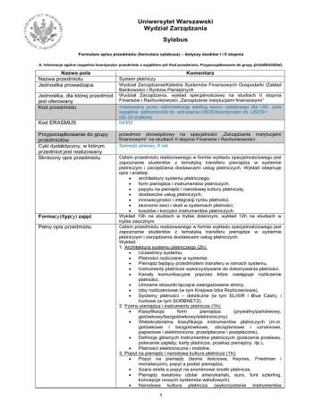 Uniwersytet Warszawski Wydział Zarządzania Sylabus Formularz opisu przedmiotu (formularz sylabusa) – dotyczy studiów I i II stopnia A. Informacje ogólne (wypełnia koordynator przedmiotu z wyjątkiem pól Kod przedmiotu, Przyporządkowanie do grupy przedmiotów). Nazwa pola Nazwa przedmiotu Jednostka prowadząca Jednostka, dla której przedmiot jest oferowany Kod przedmiotu Kod ERASMUS Przyporządkowanie do grupy przedmiotów Cykl dydaktyczny, w którym przedmiot jest realizowany Skrócony opis przedmiotu Forma(y)/typ(y) zajęć Pełny opis przedmiotu Komentarz System płatniczy Wydział Zarządzania/Katedra Systemów Finansowych Gospodarki /Zakład Bankowości i Rynków Pieniężnych Wydział Zarządzania, wykład specjalnościowy na studiach II stopnia Finansów i Rachunkowości „Zarządzanie instytucjami finansowymi” <nadawany przez administrację według wzoru ustalonego dla UW, pole wypełnia pełnomocnik ds. wdrażania USOS/koordynator ds. USOS> (do 20 znaków) 04300 przedmiot obowiązkowy na specjalności „Zarządzanie instytucjami finansowymi” na studiach II stopnia Finansów i Rachunkowości Semestr zimowy, II rok Celem przedmiotu realizowanego w formie wykładu specjalnościowego jest zapoznanie studentów z tematyką transferu pieniądza w systemie płatniczym i zarządzania dostawcami usług płatniczych. Wykład obejmuje opis i analizę: architektury systemu płatniczego, form pieniądza i instrumentów płatniczych, popytu na pieniądz i narodowej kultury płatniczej, dostawców usług płatniczych, innowacyjności i integracji rynku płatności, ekonomii sieci i skali w systemach płatności, kosztów i korzyści instrumentów płatniczych. Wykład 15h na studiach w trybie dziennym, wykład 12h na studiach w trybie zaocznym Celem przedmiotu realizowanego w formie wykładu specjalnościowego jest zapoznanie studentów z tematyką transferu pieniądza w systemie płatniczym i zarządzania dostawcami usług płatniczych. Wykład: 1. Architektura systemu płatniczego (2h): Uczestnicy systemu, Płatności rozliczane w systemie, Pieniądz będący przedmiotem transferu w ramach systemu, Instrumenty płatnicze wykorzystywane do dokonywania płatności, Kanały komunikacyjne poprzez które następuje rozliczenie płatności, Umowne stosunki łączące zaangażowane strony, Izby rozliczeniowe (w tym Krajowa Izba Rozliczeniowa), Systemy płatności – detaliczne (w tym ELIXIR i Blue Cash), i hurtowe (w tym SORBNET2). 2. Formy pieniądza i instrumenty płatnicze (1h): Klasyfikacja form pieniądza (prywatny/państwowy, gotówkowy/bezgotówkowy/elektroniczny). Wielokryterialna klasyfikacja instrumentów płatniczych (m.in. gotówkowe i bezgotówkowe, obciążeniowe i uznaniowe, papierowe i elektroniczne, przedpłacone i postpłacone), Definicje głównych instrumentów płatniczych (polecenie przelewu, polecenie zapłaty, karty płatnicze, przekaz pieniężny, itp.), Płatności elektroniczne i mobilne. 3. Popyt na pieniądz i narodowa kultura płatnicza (1h): Popyt na pieniądz (teoria ilościowa, Keynes, Friedman i monetaryzm), popyt a podaż pieniądza, Szara strefa a popyt na anonimowe środki płatnicze, Pieniądz światowy (dolar amerykański, euro, funt szterling, koncepcje nowych systemów walutowych) Narodowa kultura płatnicza (wykorzystanie instrumentów 1 płatniczych w krajach, wzorce zwyczajów płatności). 4. Dostawcy usług płatniczych (2h): Banki i pozostałe instytucje kredytowe, Instytucje płatnicze, Instytucje pieniądza elektronicznego, Katalog usług płatniczych, Gospodarka aktywami i pasywami w kontekście zarządzania płynnością i wymogów ostrożnościowych, Normy prawne regulujące działalność dostawców usług płatniczych (Dyrektywa i Ustawa o usługach płatniczych, Dyrektywa o pieniądzu elektronicznym I i II, Rozporządzenie Rady PE i Rady (WE) nr 924/2009 w sprawie płatności transgranicznych i tzw. SEPA-end-date-Regulation Rozporządzenie PE i Rady (UE) nr 260/2012, Prawo bankowe). 5. Innowacyjność i integracja rynku płatności (2h): Fragmentacja rynków krajowych i niewystandaryzowane instrumenty płatnicze, Programy SEPA (Jednolitego Obszaru Płatności Euro) i SECA (Jednolitego Obszaru Gotówki Euro), Wielostronne opłaty interchange, Autoryzacja transgraniczna i łączenie marek, Dostęp do rachunków bankowych i systemów rozrachunku, Relacje między konsumentem a akceptantem i dostawcą usług płatniczych, Interoperacyjność między dostawcami a konkurencja i bezpieczeństwo płatności, Zarządzanie systemem płatności. 6. Ekonomia sieci i skali w systemach płatności (2h): Efekty sieci (pośrednie i bezpośrednie), Efekty skali, Platformy/rynki/sieci dwustronne i wielostronne, Czterostronne (Visa i MasterCard) oraz trójstronne (American Express, Diners Club) systemy kart płatniczych, Konwencje cenowe stosowane w modelach biznesowych na rynku usług płatniczych, Problem masy krytycznej, efektu zamknięcia i konkurencyjnych standardów. 7. Koszty i korzyści instrumentów płatniczych (1h): Koncepcje kosztów w płatnościach (koszty społeczne i prywatne), Kategorie kosztów (pieniężne i niepieniężne, makro- i mikroekonomiczne, całkowite/stałe/zmienne/krańcowe) Prawo Kopernika – nowe podejście, Badania kosztów na świecie – efektywność kosztowa instrumentów płatniczych. 8. Zaliczenie (1h). Wymagania wstępne Wymagania formalne Założenia wstępne Efekty uczenia się Punkty ECTS Metody i kryteria oceniania Sposób zaliczenia Rodzaj przedmiotu Sposób realizacji przedmiotu Język wykładowy Literatura Kursy z systemu finansowego gospodarki, bankowości, makro- i mikroekonomii, finansów i rachunkowości Po ukończeniu przedmiotu (wykładu) student: – wyjaśnia zasady funkcjonowania systemu płatniczego, – rozpoznaje rodzaje pośredników finansowych w łańcuchu płatności, – klasyfikuje i definiuje instrumenty płatnicze, – identyfikuje usługi płatnicze, – analizuje funkcje system