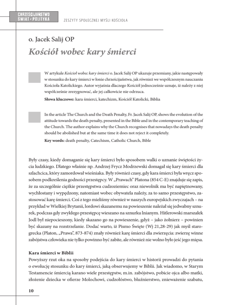 ZESZ Y T Y S P O ŁEC Z NEJ MYŚ L I KO Ś C IO ŁA o. Jacek Salij OP Kościół wobec kary śmierci W artykule Kościoł wobec kary śmierci o. Jacek Salij OP ukazuje przemiany, jakie następowały w stosunku do kary śmierci w łonie chrześcijaństwa, jak również we współczesnym nauczaniu Kościoła Katolickiego. Autor wyjaśnia dlaczego Kościół jednocześnie uznaje, iż należy z niej współcześnie zrezygnować, ale jej całkowicie nie odrzuca. Słowa kluczowe: kara śmierci, katechizm, Kościół Katolicki, Biblia In the article The Church and the Death Penalty, Fr. Jacek Salij OP, shows the evolution of the attitude towards the death penalty, presented in the Bible and in the contemporary teaching of the Church. The author explains why the Church recognises that nowadays the death penalty should be abolished but at the same time it does not reject it completely. Key words: death penalty, Catechism, Catholic Church, Bible Były czasy, kiedy domaganie się kary śmierci było sposobem walki o uznanie świętości życia ludzkiego. Dlatego właśnie np. Andrzej Frycz Modrzewski domagał się kary śmierci dla szlachcica, który zamordował wieśniaka. Były również czasy, gdy kara śmierci była wręcz sposobem podkreślenia godności przestępcy. W „Prawach” Platona (854 C-E) znajduje się zapis, że za szczególnie ciężkie przestępstwa cudzoziemiec oraz niewolnik ma być napiętnowany, wychłostany i wypędzony, natomiast wobec obywatela należy, za to samo przestępstwo, zastosować karę śmierci. Coś z tego mieliśmy również w naszych europejskich zwyczajach – na przykład w Wielkiej Brytanii, lordowi skazanemu na powieszenie należał się jedwabny sznurek, podczas gdy zwykłego przestępcę wieszano na sznurku lnianym. Hitlerowski marszałek Jodl był niepocieszony, kiedy skazano go na powieszenie, gdyż – jako żołnierz – powinien być skazany na rozstrzelanie. Dodać warto, iż Pismo Święte (Wj 21,28-29) jak myśl starogrecka (Platon, „Prawa”, 873-874) znały również karę śmierci dla zwierzęcia: zwierzę winne zabójstwa człowieka nie tylko powinno być zabite, ale również nie wolno było jeść jego mięsa. Kara śmierci w Biblii Powyższy rzut oka na sposoby podejścia do kary śmierci w historii prowadzi do pytania o ewolucję stosunku do kary śmierci, jaką obserwujemy w Biblii. Jak wiadomo, w Starym Testamencie śmiercią karano wiele przestępstw, m.in. zabójstwo, pobicie ojca albo matki, złożenie dziecka w ofierze Molochowi, cudzołóstwo, bluźnierstwo, znieważenie szabatu, 10 Z ES Z Y T Y S P O ŁEC Z NEJ MYŚLI KO ŚC I O Ł A wywoływanie duchów. Chrześcijaństwo nie wypiera się Starego Testamentu, Chrystus Pan nie przyszedł go znosić, ale wypełnić. Toteż Ojcowie Kościoła w gruncie rzeczy jednomyślnie przyjęli tezę, że grzechy, które w Starym Testamencie były zagrożone karą śmierci, są dla sumienia chrześcijańskiego grzechami śmiertelnymi. Ponadto: o ile w czasach Starego Testamentu o orzeczeniu kary śmierci decydowała społeczność lub jej przywódcy, o tyle w chrześcijaństwie głównym trybunałem ustanowione zostało sumienie, bardzo istotnie przyczyniając się do ukształtowania idei trybunału sumienia. Oczywiście, podkreślenie wagi osądu sumienia, nie znaczyło, że przestępstwa miały być wyłączone spod jurysdykcji prawnej. Jeżeli idzie o Nowy Testament, warto sobie uprzytomnić, że nie odrzuca on nawet kary śmierci. Najbardziej znaną wypowiedzią na ten temat jest werset z Listu do Rzymian, 13,4: „Jeżeli czynisz zło lękaj się jej [władzy], bo nie próżno nosi miecz, jest bowiem sługą bożym karzącym przez gniew”. Kiedy chcemy całościowo zobaczyć, co Nowy Testament mówi na temat kary śmierci, trzeba przypomnieć jeszcze słowa dobrego łotra, który karcąc swojego współtowarzysza niedoli powiada: „My odbieramy słuszną karę za nasze uczynki” (Łk 23,41). Warto też sobie uprzytomnić, że już w Starym Testamencie odnotowano i napiętnowano morderstwo sądowe. Mianowicie za poduszczeniem królowej Izebel zamordowany został, na mocy niegodziwego wyroku sądowego, Nabot (1 Krl 21). Jeśli idzie o morderstwa, może nie tyle sądowe, co zarządzone niegodziwie przez władcę, w ten sposób został zabity święty Jan Chrzciciel (Mk 6,17-29), a również apostoł Jakub (Dz 12,2). Przede wszystkim jednak nie zapominajmy, że również Pan Jezus z punktu widzenia prawnego był ofiarą właśnie morderstwa sądowego. Żeby dokończyć omawianie biblijnych wątków związanych z naszym tematem, warto przypomnieć, że w Nowym Testamencie odnotowano także fakty samosądów. Ofiarą samosądu padł na przykład apostoł Paweł. Wprawdzie w Drugim Liście do Koryntian tylko wspomina o tym, że „jeden raz był kamienowany” (2 Kor 11,25), jednak w Dziejach Apostolskich wydarzenie to opisano bardziej szczegółowo. Mianowicie w Listrze „ukamienowali Pawła i wywlekli go za miasto, sądząc, że nie żyje. Kiedy go jednak otoczyli uczniowie, podniósł się i wszedł do miasta” (Dz 14,18). Apostoł Paweł jeszcze raz znalazł się w podobnej w sytuacji, ale przed samosądem obronili go rzymscy żołnierze (Dz 21,30-36). Kara śmierci a praktyka chrześcijańska Punkt wyjściowy chrześcijańskiego stosunku do kary śmierci, czyli naukę Biblii pokrótce przedstawiliśmy. Jeśli idzie o pierwsze pokolenia chrześcijan, z karą śmierci nie chcieli 11 ZESZ Y T Y S P O ŁEC Z NEJ MYŚ L I KO Ś C IO ŁA mieć oni nic wspólnego, co najwyżej byli gotowi być jej ofiarami. Zarazem samej instytucji kary śmierci nie krytykowali. Na przykład Laktancjusz, pisarz końca epoki prześladowań, pisał: „Człowiek sprawiedliwy nie powinien nikogo skarżyć z powodu przestępstwa, za które grozi kara śmierci. Tym samym jest zabicie człowieka bronią, czy też słowem oskarżycielskim – gdyż zabijanie jako takie jest zabronione. W tym przykazaniu [Nie zabij