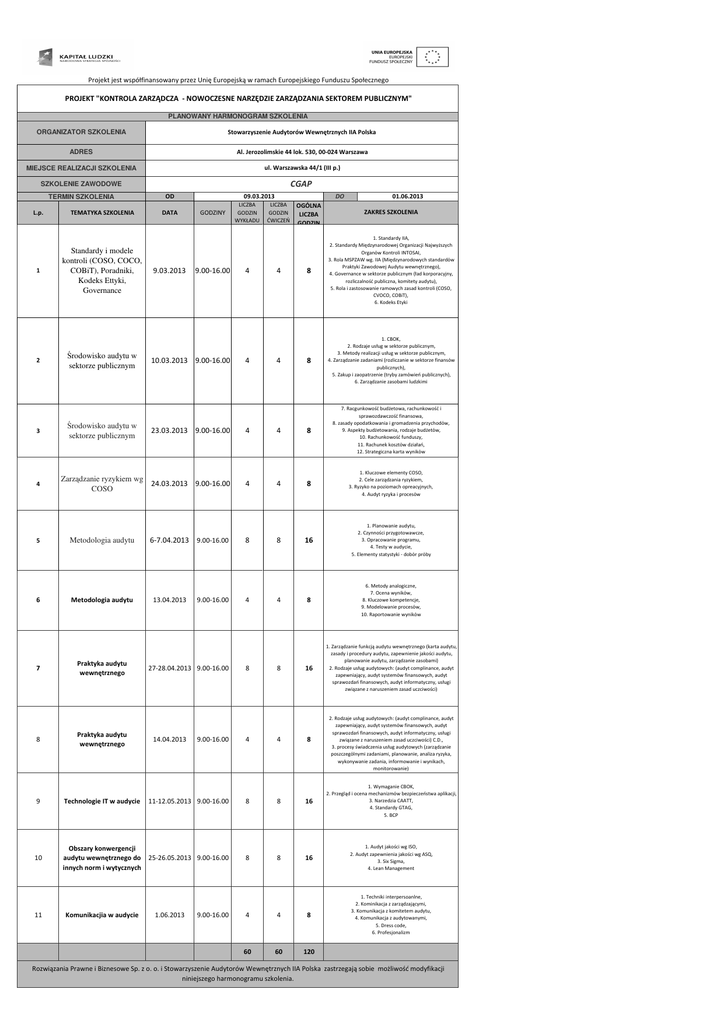 Projekt jest współfinansowany przez Unię Europejską w ramach Europejskiego Funduszu Społecznego PROJEKT "KONTROLA ZARZĄDCZA - NOWOCZESNE NARZĘDZIE ZARZĄDZANIA SEKTOREM PUBLICZNYM" PLANOWANY HARMONOGRAM SZKOLENIA ORGANIZATOR SZKOLENIA Stowarzyszenie Audytorów Wewnętrznych IIA Polska ADRES Al. Jerozolimskie 44 lok. 530, 00-024 Warszawa MIEJSCE REALIZACJI SZKOLENIA ul. Warszawska 44/1 (III p.) CGAP SZKOLENIE ZAWODOWE TERMIN SZKOLENIA L.p. TEMATYKA SZKOLENIA 1 Standardy i modele kontroli (COSO, COCO, COBiT), Poradniki, Kodeks Ettyki, Governance 2 Środowisko audytu w sektorze publicznym 3 4 DATA 9.03.2013 GODZINY 9.00-16.00 10.03.2013 9.00-16.00 LICZBA GODZIN WYKŁADU 4 4 DO LICZBA GODZIN ĆWICZEŃ 4 4 01.06.2013 OGÓLNA LICZBA GODZIN ZAKRES SZKOLENIA 8 1. Standardy IIA, 2. Standardy Międzynarodowej Organizacji Najwyższych Organów Kontroli INTOSAI, 3. Rola MSPZAW wg. IIA (Międzynarodowych standardów Praktyki Zawodowej Audytu wewnętrznego), 4. Governance w sektorze publicznym (ład korporacyjny, rozliczalność publiczna, komitety audytu), 5. Rola i zastosowanie ramowych zasad kontroli (COSO, CVOCO, COBiT), 6. Kodeks Etyki 8 1. CBOK, 2. Rodzaje usług w sektorze publicznym, 3. Metody realizacji usług w sektorze publicznym, 4. Zarządzanie zadaniami (rozliczanie w sektorze finansów publicznych), 5. Zakup i zaopatrzenie (tryby zamówień publicznych), 6. Zarządzanie zasobami ludzkimi 23.03.2013 9.00-16.00 4 4 8 7. Racgunkowość budżetowa, rachunkowość i sprawozdawczość finansowa, 8. zasady opodatkowania i gromadzenia przychodów, 9. Aspekty budżetowania, rodzaje budżetów, 10. Rachunkowość funduszy, 11. Rachunek kosztów działań, 12. Strategiczna karta wyników Zarządzanie ryzykiem wg 24.03.2013 9.00-16.00 COSO 4 4 8 1. Kluczowe elementy COSO, 2. Cele zarządzania ryzykiem, 3. Ryzyko na poziomach opreacyjnych, 4. Audyt ryzyka i procesów 6-7.04.2013 9.00-16.00 8 8 16 1. Planowanie audytu, 2. Czynności przygotowawcze, 3. Opracowanie programu, 4. Testy w audycie, 5. Elementy statystyki - dobór próby 4 4 8 6. Metody analogiczne, 7. Ocena wyników, 8. Kluczowe kompetencje, 9. Modelowanie procesów, 10. Raportowanie wyników 16 1. Zarządzanie funkcją audytu wewnętrznego (karta audytu, zasady i procedury audytu, zapewnienie jakości audytu, planowanie audytu, zarządzanie zasobami) 2. Rodzaje usług audytowych: (audyt complinance, audyt zapewniający, audyt systemów finansowych, audyt sprawozdań finansowych, audyt informatyczny, usługi związane z naruszeniem zasad uczciwości) Środowisko audytu w sektorze publicznym 5 Metodologia audytu 6 Metodologia audytu 7 Praktyka audytu wewnętrznego 8 Praktyka audytu wewnętrznego 9 Technologie IT w audycie 10 11 09.03.2013 OD 13.04.2013 9.00-16.00 27-28.04.2013 9.00-16.00 8 8 2. Rodzaje usług audytowych: (audyt complinance, audyt zapewniający, audyt systemów finansowych, audyt sprawozdań finansowych, audyt informatyczny, usługi związane z naruszeniem zasad uczciwości) C.D., 3. procesy świadczenia usług audytowych (zarządzanie poszczególnymi zadaniami, planowanie, analiza ryzyka, wykonywanie zadania, informowanie i wynikach, monitorowanie) 9.00-16.00 4 4 8 11-12.05.2013 9.00-16.00 8 8 16 1. Wymaganie CBOK, 2. Przegląd i ocena mechanizmów bezpieczeństwa aplikacji, 3. Narzedzia CAATT, 4. Standardy GTAG, 5. BCP Obszary konwergencji audytu wewnętrznego do 25-26.05.2013 9.00-16.00 innych norm i wytycznych 8 8 16 1. Audyt jakości wg ISO, 2. Audyt zapewnienia jakości wg ASQ, 3. Six Sigma, 4. Lean Management 1. Techniki interpersoanlne, 2. Kominikacja z zarządzającymi, 3. Komunikacja z komitetem audytu, 4. Komunikacja z audytowanymi, 5. Dress code, 6. Profesjonalizm Komunikacjia w audycie 14.04.2013 1.06.2013 9.00-16.00 4 4 8 60 60 120 Rozwiązania Prawne i Biznesowe Sp. z o. o. i Stowarzyszenie Audytorów Wewnętrznych IIA Polska zastrzegają sobie możliwość modyfikacji niniejszego harmonogramu szkolenia.