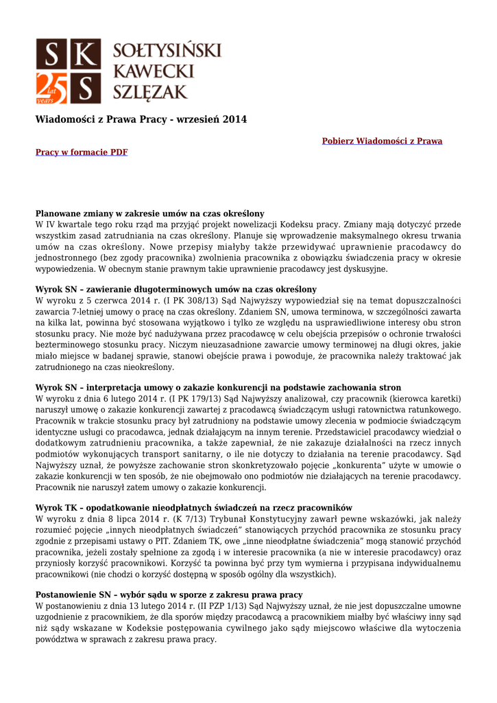 Wiadomości z Prawa Pracy - wrzesień 2014 Pobierz Wiadomości z Prawa Pracy w formacie PDF Planowane zmiany w zakresie umów na czas określony W IV kwartale tego roku rząd ma przyjąć projekt nowelizacji Kodeksu pracy. Zmiany mają dotyczyć przede wszystkim zasad zatrudniania na czas określony. Planuje się wprowadzenie maksymalnego okresu trwania umów na czas określony. Nowe przepisy miałyby także przewidywać uprawnienie pracodawcy do jednostronnego (bez zgody pracownika) zwolnienia pracownika z obowiązku świadczenia pracy w okresie wypowiedzenia. W obecnym stanie prawnym takie uprawnienie pracodawcy jest dyskusyjne. Wyrok SN – zawieranie długoterminowych umów na czas określony W wyroku z 5 czerwca 2014 r. (I PK 308/13) Sąd Najwyższy wypowiedział się na temat dopuszczalności zawarcia 7-letniej umowy o pracę na czas określony. Zdaniem SN, umowa terminowa, w szczególności zawarta na kilka lat, powinna być stosowana wyjątkowo i tylko ze względu na usprawiedliwione interesy obu stron stosunku pracy. Nie może być nadużywana przez pracodawcę w celu obejścia przepisów o ochronie trwałości bezterminowego stosunku pracy. Niczym nieuzasadnione zawarcie umowy terminowej na długi okres, jakie miało miejsce w badanej sprawie, stanowi obejście prawa i powoduje, że pracownika należy traktować jak zatrudnionego na czas nieokreślony. Wyrok SN – interpretacja umowy o zakazie konkurencji na podstawie zachowania stron W wyroku z dnia 6 lutego 2014 r. (I PK 179/13) Sąd Najwyższy analizował, czy pracownik (kierowca karetki) naruszył umowę o zakazie konkurencji zawartej z pracodawcą świadczącym usługi ratownictwa ratunkowego. Pracownik w trakcie stosunku pracy był zatrudniony na podstawie umowy zlecenia w podmiocie świadczącym identyczne usługi co pracodawca, jednak działającym na innym terenie. Przedstawiciel pracodawcy wiedział o dodatkowym zatrudnieniu pracownika, a także zapewniał, że nie zakazuje działalności na rzecz innych podmiotów wykonujących transport sanitarny, o ile nie dotyczy to działania na terenie pracodawcy. Sąd Najwyższy uznał, że powyższe zachowanie stron skonkretyzowało pojęcie „konkurenta” użyte w umowie o zakazie konkurencji w ten sposób, że nie obejmowało ono podmiotów nie działających na terenie pracodawcy. Pracownik nie naruszył zatem umowy o zakazie konkurencji. Wyrok TK – opodatkowanie nieodpłatnych świadczeń na rzecz pracowników W wyroku z dnia 8 lipca 2014 r. (K 7/13) Trybunał Konstytucyjny zawarł pewne wskazówki, jak należy rozumieć pojęcie „innych nieodpłatnych świadczeń” stanowiących przychód pracownika ze stosunku pracy zgodnie z przepisami ustawy o PIT. Zdaniem TK, owe „inne nieodpłatne świadczenia” mogą stanowić przychód pracownika, jeżeli zostały spełnione za zgodą i w interesie pracownika (a nie w interesie pracodawcy) oraz przyniosły korzyść pracownikowi. Korzyść ta powinna być przy tym wymierna i przypisana indywidualnemu pracownikowi (nie chodzi o korzyść dostępną w sposób ogólny dla wszystkich). Postanowienie SN – wybór sądu w sporze z zakresu prawa pracy W postanowieniu z dnia 13 lutego 2014 r. (II PZP 1/13) Sąd Najwyższy uznał, że nie jest dopuszczalne umowne uzgodnienie z pracownikiem, że dla sporów między pracodawcą a pracownikiem miałby być właściwy inny sąd niż sądy wskazane w Kodeksie postępowania cywilnego jako sądy miejscowo właściwe dla wytoczenia powództwa w sprawach z zakresu prawa pracy. Wyrok SN – wskazywanie kryteriów doboru do zwolnienia w wypowiedzeniu W wyroku z dnia 10 września 2013 r. (I PK 61/13) Sąd Najwyższy uznał, że w przypadku likwidacji jednego z takich samych stanowisk pracy, pracodawca powinien w oświadczeniu o wypowiedzeniu wskazać kryteria, którymi kierował się przy wyborze pracownika do zwolnienia (chyba że kryteria te są oczywiste lub znane pracownikowi). Kryteria te nie mogą być przywoływane przez pracodawcę dopiero na etapie postępowania sądowego, w którym dopuszczalna jest jedynie konkretyzacja wskazanej pracownikowi w wypowiedzeniu przyczyny wypowiedzenia. Orzeczenie jest zgodne z przeważającym poglądem SN.