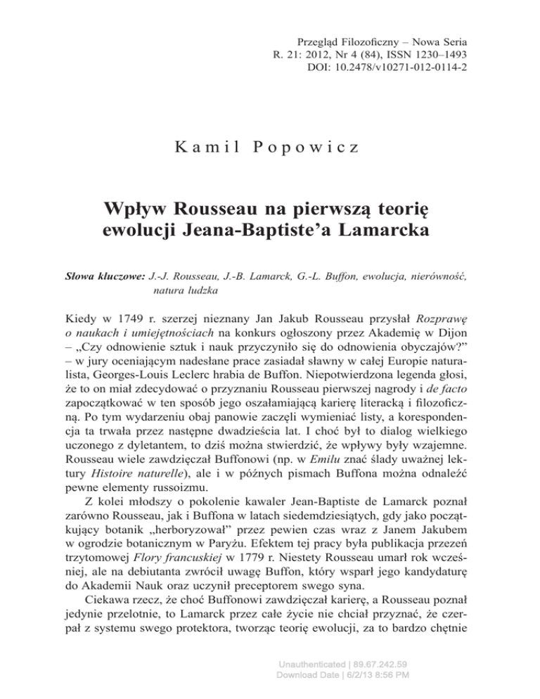 Przegląd Filozoficzny – Nowa Seria R. 21: 2012, Nr 4 (84), ISSN 1230–1493 DOI: 10.2478/v10271-012-0114-2 Kamil Popowicz Wpływ Rousseau na pierwszą teorię ewolucji Jeana-Baptiste’a Lamarcka Słowa kluczowe: J.-J. Rousseau, J.-B. Lamarck, G.-L. Buffon, ewolucja, nierówność, natura ludzka Kiedy w 1749 r. szerzej nieznany Jan Jakub Rousseau przysłał Rozprawę o naukach i umiejętnościach na konkurs ogłoszony przez Akademię w Dijon – „Czy odnowienie sztuk i nauk przyczyniło się do odnowienia obyczajów?” – w jury oceniającym nadesłane prace zasiadał sławny w całej Europie naturalista, Georges-Louis Leclerc hrabia de Buffon. Niepotwierdzona legenda głosi, że to on miał zdecydować o przyznaniu Rousseau pierwszej nagrody i de facto zapoczątkować w ten sposób jego oszałamiającą karierę literacką i filozoficzną. Po tym wydarzeniu obaj panowie zaczęli wymieniać listy, a korespondencja ta trwała przez następne dwadzieścia lat. I choć był to dialog wielkiego uczonego z dyletantem, to dziś można stwierdzić, że wpływy były wzajemne. Rousseau wiele zawdzięczał Buffonowi (np. w Emilu znać ślady uważnej lektury Histoire naturelle), ale i w późnych pismach Buffona można odnaleźć pewne elementy russoizmu. Z kolei młodszy o pokolenie kawaler Jean-Baptiste de Lamarck poznał zarówno Rousseau, jak i Buffona w latach siedemdziesiątych, gdy jako początkujący botanik „herboryzował” przez pewien czas wraz z Janem Jakubem w ogrodzie botanicznym w Paryżu. Efektem tej pracy była publikacja przezeń trzytomowej Flory francuskiej w 1779 r. Niestety Rousseau umarł rok wcześniej, ale na debiutanta zwrócił uwagę Buffon, który wsparł jego kandydaturę do Akademii Nauk oraz uczynił preceptorem swego syna. Ciekawa rzecz, że choć Buffonowi zawdzięczał karierę, a Rousseau poznał jedynie przelotnie, to Lamarck przez całe życie nie chciał przyznać, że czerpał z systemu swego protektora, tworząc teorię ewolucji, za to bardzo chętnie Unauthenticated | 89.67.242.59 Download Date | 6/2/13 8:56 PM 328 Kamil Popowicz powoływał się na wpływ Obywatela Genewy. Jak się zdaje, spotkanie z nim wywarło na młodym uczonym niezatarte wrażenie. Dwudziestowieczny francuski historyk nauki Jacques Roger uważa nawet, że Lamarck mógł z czasem zacząć się do Rousseau porównywać, a to z uwagi na pewne podobieństwa ich biografii1. Lamarck był ubogim prowincjuszem, pozycję zdobył dzięki możnym protektorom. Kiedy jednak zaczął głosić swe rewolucyjne tezy o ewolucji, spotkał go ostracyzm naukowego establishmentu i szykany ze strony władzy. Jedno było zresztą połączone z drugim, gdyż Georges Cuvier, stały sekretarz Instytutu, utworzonego przez dyrektoriat w miejsce Akademii Francuskiej, i nieprzejednany wróg ewolucjonizmu, zadbał o to, by nieprzychylnie nastawić do Lamarcka Napoleona. Stąd kiedy w 1809 r. ukazała się Filozofia zoologii Lamarcka, zawierająca pierwszy syntetyczny wykład teorii ewolucji, cesarz zareagował gniewem i kazał uczonego ukarać. W tych warunkach nie dziwi, że rozgoryczony Lamarck jął w końcu uważać się za niezrozumianego, prześladowanego geniusza, zajmującego wśród naturalistów pozycję analogiczną do tej, jaką zajmował Rousseau wśród filozofów. Dla historii nauki te sprawy biograficzne nie mają jednak większego znaczenia. Istotny jest za to wpływ filozofii Rousseau na samą teorię Lamarcka. Swą teorię ewolucji wyłożył on w dwóch książkach. Rozważania czysto przyrodnicze zawarł we wspomnianej wyżej Filozofii zoologii (1809). Nadbudowę socjologiczną (swego rodzaju „socjobiologię”), tworzącą tak zwany „lamarkizm społeczny” przedstawił w Système analytique des connaissances positives de l’homme (1820). Wpływ filozofii Rousseau na teorię przyrodniczą jest dość słabo widoczny, co nie znaczny nieistotny. Za to jego rozważania o relacjach między ludzką naturą a kulturą, przede wszystkim z Rozprawy o pochodzeniu i podstawach nierówności między ludźmi, bardzo wyraźnie odbijają się w teoriach „socjobiologicznych” z Système analytique... Zacznijmy jednak od Filozofii zoologii. Nie jest to właściwe miejsce, by dokładnie przedstawiać cały bardzo skomplikowany system Lamarcka. Ograniczmy się tedy do kwestii podstawowych. Po pierwsze, ewolucja według Lamarcka jest procesem planowym i deterministycznym (inaczej niż u Darwina). Po drugie, jest procesem mechanicznym. Wreszcie po trzecie, Lamarck dokonał swego rodzaju syntezy między osiemnastowiecznym mechanicyzmem i witalizmem. Inaczej mówiąc, dokonał mechanicyzacji witalizmu. W świecie takiej ewolucji panują porządek i równowaga. Można powiedzieć, że system sam się reguluje, utrzymując swoistą homeostazę (Lamarck oczywiście nie używał tego pojęcia). Pierwszym poważnym zaburzeniem systemu, mogącym 1 Zob.: Jacques Roger, Lamarck et Jean-Jacques Rousseau, w: tenże, Pour une histoire des sciences à part entière, Paris 1995, s. 358–371. Unauthenticated | 89.67.242.59 Download Date | 6/2/13 8:56 PM Wpływ Rousseau na pierwszą teorię ewolucji Jeana-Baptiste’a Lamarcka 329 wręcz zagrozić jego trwaniu, jest pojawienie się w nim człowieka. Lamarck pisze: Wydaje się, że tylko człowiek, rozpatrywany w oderwaniu od tego, co mu jest właściwe, może się rozmnażać nieograniczenie, gdyż jego inteligencja i jego możliwości chronią go przed tym, by żarłoczność jakiegoś zwierzęcia mogła ograniczyć jego rozmnażanie się. Ma on taką przewagę nad zwierzętami, że zamiast obawiać się największych i najsilniejszych ras zwierząt, sam raczej może je unicestwić, toteż z każdym dniem zmniejsza on liczbę osobników tych ras2. W tym miejscu co prawda Lamarck pociesza się, stwierdzając, że dzięki swej inteligencji i zdolnościom ludzie prędzej zniszczą sami siebie, nim zagrożą innym gatunkom. Człowiek jest poniekąd istotą nienat