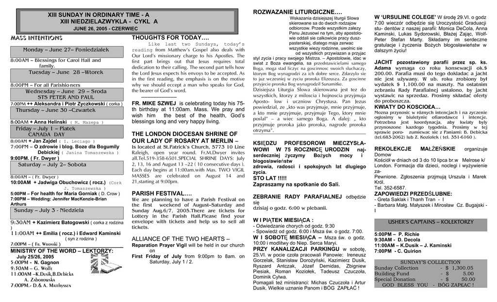 XIII SUNDAY IN ORDINARY TIME - A XIII NIEDZIELAZWYKLA - CYKL A JUNE 26, 2005 - CZERWIEC MASS INTENTIONS THOUGHTS FOR TODAY…. Monday – June 27– Poniedzialek 8:00AM – Blessings for Carol Hall and family. Tuesday – June 28 –Wtorek 8:00PM – For all Parishio ners Wednesday – June 29 – Sroda STS PETER AND PAUL 7:00PM ++ Aleksandra i Piotr Zyczkowski ( corka ) Thursday – June 30 –Czwartek 8:00AM + Anna Helinski ( M. Mazepa ) Friday – July 1 – Piatek CANADA DAY 8:00AM + Jan Zajdel ( I. Leciago ) 7:00PM – O zdrowie i blog. Boze dla Bogumily Debickiej ( Janina Tomaszewska ) 9:00PM. ( Fr. Dwyer ) Saturday – July 2– Sobota 8:00AM – ( Fr. Dwyer ) 10:00AM + Jadwiga Obuchowicz ( rocz.) (Cork J. Tomaszewska ) 5:00PM – For health for Maria Gorniak ( D. Crow ) 7:00PM – Wedding: Jennifer MacKenzie-Brian Arthurs Sunday – July 3 - Niedziela 9:30AM + Kazimierz Batogowski ( corka z rodzina ) Like last two Sundays, today’s reading from Matthew’s Gospel also deals with Our Lord’s missionary charge to his Apostles. The first part brings out that Jesus requires total dedication to their calling. The second part tells how the Lord Jesus expects his envoys to be accepted. As in the first reading, the emphasis is on the motive why we should eccept a man who speaks for God, the bearer of God’s word. ----------------------- FR. MIKE SZWEJ is celebrating today his 75th birthday at 11:00am. Mass. We pray and wish him the best of the health, God’s blessings long and very happy living. THE LONDON DIOCESAN SHRINE OF OUR LADY OF ROSARY AT MERLIN – Is located at St.Patrick’s Church, 5773 10 Line Raleigh, open year round. Fr.M.Dwyer invites all.Tel.519-358-6501.SPECIAL SHRINE DAYS: July 2, 13, 16 and August 13 –22 ( 10 consecutive days ). Each day begins at 11:00am.with Mas. TWO VIGIL MASSES are celebrated on August 14 and 21,starting at 9:00pm. PARISH FESTIVAL…. We are planning to have a Parish Festival on the first weekend of August–Saturday and Sunday Aug.6/7, 2005.There are tickets for Lottery in the Parish Hall.Please find your envelope with tickets and help us to sell all tickets. 11:00AM ++ Emilia ( rocz.) i Edward Kaminski ( syn z rodzina ) 7:00PM – ( Fr. Wronski ) MINISTRY OF THE WORD – LEKTORZY: July 25/26, 2005 5:00PM - N. Gagnon 9:30AM – G. Wolfe 11:00AM –K.Dusik,B.Debicka A. Zaborowska 7:00PM.- D.& A. Matthyssen ALLIANCE OF THE TWO HEARTS – Reparation Prayer Vigil will be held in our church on First Friday of July from 9:00pm to 8am. on Saturday, July 1 / 2. ROZWAZANIE LITURGICZNE…. Wskazania dzisiejszej liturgii Slowa skierowane sa do dwoch rodzajow odbiorcow. Przede wszystkim zalezy Panu Jezusowi na tym, aby apostolowie oddali sie calkowicie pracy duszpasterskiej, dlatego maja zerwac wszystkie wiezy rodzinne, uwolnic sie od wszystkich przywiazan a przyjac styl zycia i pracy swojego Mistrza. – Apostolowie, idac w swiat z Boza ewangelia, sa przedstawicielami samego Boga, moga stad liczyc na goscinnosc swoich sluchaczy, ktorym Bog wynagrodzi za ich dobre serce. Zdarzylo sie to juz wczesniej w zyciu proroka Elizeusza. Za goscinne przyjecie proroka Bog wynagrodzil Sunamitke. Dzisiejsza Liturgia Slowa skierowana jest tez do wszystkich, ktorzy z miloscia i hojnoscia przyjmuja Aposto- low i uczniow Chrystusa. Pan Jezus powiedzial, ze „kto was przyjmuje, mnie przyjmuje, a kto mnie przyjmuje, przyjmuje Tego, ktory mnie poslal” – a wiec samego Boga. A dalej: „ kto przyjmuje proroka jako proroka, nagrode proroka otrzyma”. KSIĘDZU PROFESOROWI MIECZYSŁAWOWI W 75 ROCZNICĘ URODZIN naj- serdeczniej życzymy Bożych mocy i błogosławieństw zdrowia, radosci i spokojnych lat dlugiego zycia. STO LAT !!!!! Zapraszamy na spotkanie do Sali. ZEBRANIE RADY PARAFIALNEJ odbędzie się dzisiaj o godz. 6:00 w plebanii. W I PIĄTEK MIESIĄCA : - Odwiedzanie chorych od godz. 9:30 - Spowiedż od godz. 6:00 i Msza św. o godz. 7:00. W I SOBOTĘ MIESIĄCA – Msza św. o godz. 10:00 i modlitwy do Niep. Serca Maryi. PRZY KANALIZACJI PARKINGU w sobotę, 25.VI. w pocie czoła pracowali Panowie: Ireneusz Gorzelak, Stanisław Dorożyński, Kazimierz Dusik, Ryszard Antczak, Józef Demidas, Zbigniew Piesiak, Roman Koziołek, Tadeusz Czuczoła, Dominik Cylwa. Pomagali też ministranci: Michas Czuczoła i Artur Dusik. Wielkie uznanie Panom i BÓG ZAPŁAĆ ! W ‘URSULINE COLEGE’ W środę 29.VI. o godz 7:00 wieczór odbędzie się Uroczystość Graduacji stu- dentów z naszej parafii: Monica DeCola, Anna Kaminski, Lukas Sydorowski, Błażej Zając, WolfPeter Stefan Marty. Składamy im serdeczne gratulacje i życzenia Bożych błogosławieństw w dalszym życiu! JACHT pozostawiony parafii przez sp. ks. Adama wymaga co roku konsewacji ok.$ 200.00. Parafia musi do tego dokladac a jacht nie jest używany. W ub. roku zrobiony był wydatek $ 1,100.00 na maszty. Na ostatnim zebraniu Rady Parafialnej ustalono, by jacht wystawic na sprzedaz. Prosimy składać oferty do proboszcza. KWIATY DO KOSCIO£A… Mozna przynosic w róznych intencjach i na zyczenie oglosimy w biuletynie ofiarodawce i intencje. Potrzebna jest koordynacja, aby kwiaty byly przynoszone kazdego tygodnia. Prosimy w tej sprawie poro- zumiewac sie z Paniami: B. Debicka (tel.683-2062) lub Z. Koziolek ( tel. 351-6160 ). MAŁŻEŃSKIE organizuje Domow Kościół w dniach od 3 do 10 lipca br.w Melrose k/ London. Formacja dla dzieci, noclegi i wyżywienie zaPewnione. Zgłoszenia przjmują Urszula i Marek Król. Tel. 352-6587. REKOLEKCJE ZAPOWIEDZI PRZEDŚLUBNE: - Greta Saklak i Thanh Tran - I - Barbara Małg. Małyszek i Mirosław Cz. Bugajski I USHER’S CAPTAINS – KOLEKTORZY 5:00PM – P. Richie 9:30AM - D. Decola 11:00AM – K.Dusik – J. Kaminski 7:00PM - C. Quirion SUNDAY’S COLLECTION Sunday Collection - $ 1,300.05 Building Fund - $ 5.00 Special Donation - $ 50.00 GOD BLESS YOU - BÓG ZAP£AC !