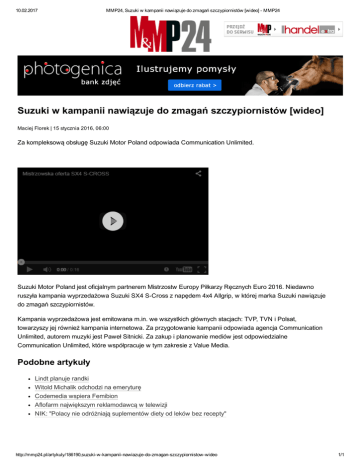 10.02.2017 MMP24, Suzuki w kampanii nawiązuje do zmagań szczypiornistów [wideo] MMP24 Suzuki w kampanii nawiązuje do zmagań szczypiornistów [wideo] Maciej Florek | 15 stycznia 2016, 06:00 Za kompleksową obsługę Suzuki Motor Poland odpowiada Communication Unlimited. Suzuki Motor Poland jest oficjalnym partnerem Mistrzostw Europy Piłkarzy Ręcznych Euro 2016. Niedawno ruszyła kampania wyprzedażowa Suzuki SX4 SCross z napędem 4x4 Allgrip, w której marka Suzuki nawiązuje do zmagań szczypiornistów. Kampania wyprzedażowa jest emitowana m.in. we wszystkich głównych stacjach: TVP, TVN i Polsat, towarzyszy jej również kampania internetowa. Za przygotowanie kampanii odpowiada agencja Communication Unlimited, autorem muzyki jest Paweł Sitnicki. Za zakup i planowanie mediów jest odpowiedzialne Communication Unlimited, które współpracuje w tym zakresie z Value Media. Podobne artykuły Lindt planuje randki Witold Michalik odchodzi na emeryturę Codemedia wspiera Femibion Aflofarm największym reklamodawcą w telewizji NIK: "Polacy nie odróżniają suplementów diety od leków bez recepty" http://mmp24.pl/artykuly/186190,suzukiwkampaniinawiazujedozmaganszczypiornistowwideo 1/1