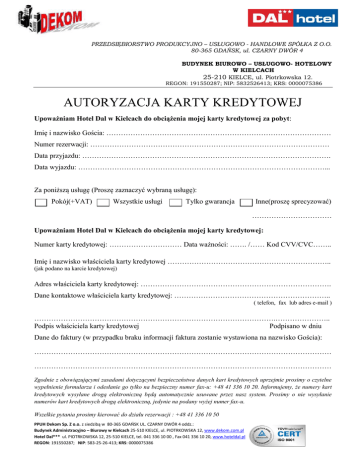 PRZEDSIĘBIORSTWO PRODUKCYJNO – USŁUGOWO - HANDLOWE SPÓŁKA Z O.O. 80-365 GDAŃSK, ul. CZARNY DWÓR 4 BUDYNEK BIUROWO – USŁUGOWO- HOTELOWY W KIELCACH 25-210 KIELCE, ul. Piotrkowska 12. REGON: 191550287; NIP: 5832526413; KRS: 0000075386 AUTORYZACJA KARTY KREDYTOWEJ Upoważniam Hotel Dal w Kielcach do obciążenia mojej karty kredytowej za pobyt: Imię i nazwisko Gościa: ………………………………………………………………………………… Numer rezerwacji: ……………………………………………………………………………………… Data przyjazdu: …………………………………………………………………………………………. Data wyjazdu: …………………………………………………………………………………………... Za poniższą usługę (Proszę zaznaczyć wybraną usługę): Pokój(+VAT) Wszystkie usługi Tylko gwarancja Inne(proszę sprecyzować) …………………………… Upoważniam Hotel Dal w Kielcach do obciążenia mojej karty kredytowej: Numer karty kredytowej: ………………………… Data ważności: ……. /…… Kod CVV/CVC…….. Imię i nazwisko właściciela karty kredytowej ………………………………………………………….. (jak podano na karcie kredytowej) Adres właściciela karty kredytowej: ……………………………………………………………………. Dane kontaktowe właściciela karty kredytowej: ……………………………………………………….. ( telefon, fax lub adres e-mail ) ……………………………………………………………………………………….………………….. Podpis właściciela karty kredytowej Podpisano w dniu Dane do faktury (w przypadku braku informacji faktura zostanie wystawiona na nazwisko Gościa): …………………………………………………………………………………………………………… …………………………………………………………………………………………………………… Zgodnie z obowiązującymi zasadami dotyczącymi bezpieczeństwa danych kart kredytowych uprzejmie prosimy o czytelne wypełnienie formularza i odesłanie go tylko na bezpieczny numer fax-u: +48 41 336 10 20. Informujemy, że numery kart kredytowych wysyłane drogą elektroniczną będą automatycznie usuwane przez nasz system. Prosimy o nie wysyłanie numerów kart kredytowych drogą elektroniczną, jedynie na podany wyżej numer fax-u. Wszelkie pytania prosimy kierować do działu rezerwacji : +48 41 336 10 50 PPUH Dekom Sp. Z o.o. z siedzibą w 80-365 GDAŃSK UL. CZARNY DWÓR 4 oddz.: Budynek Administracyjno – Biurowy w Kielcach 25-510 KIELCE, ul. PIOTRKOWSKA 12, www.dekom.com.pl Hotel Dal*** ul. PIOTRKOWSKA 12, 25-510 KIELCE, tel. 041 336 10 00 , Fax 041 336 10 20, www.hoteldal.pl REGON: 191550287; NIP: 583-25-26-413; KRS: 0000075386