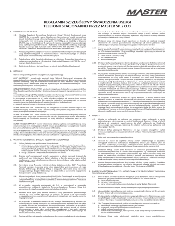 REGULAMIN SZCZEGÓŁOWY ŚWIADCZENIA USŁUGI TELEFONII STACJONARNEJ PRZEZ MASTER Sp. z o.o. lub innych jednostek służb ustawowo powołanych do niesienia pomocy właściwych dla podanego w Umowie miejsca świadczenia Usługi (Lokalu). Abonent ponosi odpowiedzialność za wszelkie następstwa wykonania połączenia na numery alarmowe spoza miejsca świadczenia Usługi (Lokalu). 1. postanowienia ogólne 1.1. Niniejszy Regulamin Szczegółowy Świadczenia Usługi Telefonii Stacjonarnej przez MASTER Sp. z o.o., dalej zwany „Regulaminem Szczegółowym” określa szczegółowe zasady świadczenia usług telekomunikacyjnych w zakresie telefonii stacjonarnej oraz związanych z nimi innych usług przez spółkę MASTER Sp. z o.o. z siedzibą w Głogowie 67-200, przy ul. Armii Krajowej 5, wpisaną do rejestru przedsiębiorców prowadzonego przez Sąd Rejonowy dla Wrocławia – Fabrycznej IX Wydział Gospodarczy Krajowego Rejestru Sądowego pod numerem KRS 0000145095, NIP 693-000-63-59, kapitał zakładowy 144 000 zł, w całości wpłacony, zwaną dalej, Dostawcą Usług”. 1.2. Niniejszy Regulamin Szczegółowy stanowi regulamin świadczenia publicznie dostępnych usług telekomunikacyjnych w rozumieniu Prawa Telekomunikacyjnego w zakresie dotyczącym świadczenia usług telekomunikacyjnych. 1.3. Pojęcia pisane wielką literą i niezdefiniowane w niniejszym Regulaminie Szczegółowym mają znaczenie określone w „Regulaminie świadczenia Usług przez MASTER Sp. z o.o.”, zwanym dalej „Regulaminem”. 1.4. Odniesienia do Umowy dotyczą Umowy w zakresie Usługi Telefonii Stacjonarnej. 2.DEFINICJE Użyte w niniejszym Regulaminie Szczegółowym pojęcia oznaczają: LIMIT KWOTOWY - ograniczenie wartości Usługi Telefonii Stacjonarnej, stosowane dla zapewnienia ochrony interesów Abonenta (kontrola kosztów połączeń), którego przekroczenie uprawnia Dostawcę Usług do wstrzymania świadczenia na rzecz Abonenta Usług Telefonii Stacjonarnej (oprócz bezpłatnych połączeń wychodzących do numerów alarmowych i służb ustawowo powołanych do niesienia pomocy). NADUŻYCIE TELEKOMUNIKACYJNE - uzyskanie nielegalnego dostępu lub wykorzystanie Usług, Usług Dodatkowych lub infrastruktury telekomunikacyjnej niezgodnie z przeznaczeniem, w tym m.in.: a. korzystanie z Usługi lub Usług Dodatkowych dla celów hurtowego zakańczania/tranzytowania połączeń w Sieci i sieciach innych operatorów telekomunikacyjnych, b. generowanie sztucznego ruchu, tj. ruchu charakteryzującego się sekwencyjnym czasem połączenia do wybranego numeru lub numerów, najczęściej wprowadzanego za pomocą generatorów ruchu, dialerów lub innych urządzeń o podobnej funkcjonalności, c. używanie automatycznych systemów wywołujących. NUMER TELEFONICZNY - numer służący do identyfikacji Urządzenia Abonenckiego w sieci telekomunikacyjnej, nadawany przez Dostawcę Usług albo przenoszony przez Abonenta od innego przedsiębiorcy telekomunikacyjnego. NUMER GEOGRAFICZNY - numer telefoniczny ustalony w planie numeracji krajowej, w którym początkowa część ciągu cyfr zawiera wskaźnik obszaru geograficznego (numer kierunkowy), wykorzystywany do kierowania połączeń do stałej lokalizacji zakończenia sieci (w sieci stacjonarnej). 3.9. 3.10. Dostawca Usług zastrzega sobie prawo zmiany sposobu technologii dostarczania Usługi, która nie spowoduje pogorszenia jej parametrów, co nie stanowi zmiany Umowy. W razie potrzeby Dostawca Usług poinformuje Abonenta o powyższych zmianach za pośrednictwem Kanałów Kontaktu, tj.: • strona WWW Dostawcy Usług, • poczta elektroniczna, • Kanał Informacyjny. 3.11. Dostawcy Usług przysługuje prawo do nieodpłatnego udostępnienia dodatkowych minut na połączenia telefoniczne lub Usług Dodatkowych do Usługi Telefonii Stacjonarnej w okresach promocyjnych i testowych. Zarówno udostępnienie jak i późniejsze wyłączenie tych Usług Dodatkowych nie stanowi zmiany Umowy. Nie wymaga też wcześniejszego powiadomienia Abonenta. 3.12. W przypadku niedotrzymania terminu wskazanego w Umowie jako termin przeniesienia numeru Abonentowi przysługuje od dotychczasowego dostawcy usług jednorazowe odszkodowanie za każdy dzień zwłoki w wysokości 1/4 sumy opłat miesięcznych liczonej według rachunków z ostatnich trzech okresów rozliczeniowych, a w przypadku Abonentów usługi przedpłaconej w wysokości 1/4 sumy wartości doładowań konta z ostatnich trzech miesięcy, chyba że brak możliwości realizacji przeniesienia numeru nastąpił z przyczyn leżących po stronie systemu, o którym mowa w art. 78 ust. 4 Prawa Telekomunikacyjnego. W przypadku, gdy opóźnienie w przeniesieniu numeru nastąpiło z przyczyn nieleżących po stronie dotychczasowego dostawcy usług, przysługuje mu zwrot wypłaconego odszkodowania lub jego części od podmiotu, z winy którego nastąpiło opóźnienie. Kwotę odszkodowania oblicza się na podstawie liczby dni, które upłyną do dnia przeniesienia numeru. 3.13. W przypadku przeniesienia numeru bez zgody Abonenta, za każdy dzień od dnia aktywacji numeru w nowej sieci Abonentowi przysługuje od nowego dostawcy usług jednorazowe odszkodowanie w wysokości 1/2 średniej opłaty miesięcznej liczonej według rachunków z ostatnich trzech okresów rozliczeniowych, a w przypadku Abonentów usługi przedpłaconej w wysokości 1/2 sumy wartości doładowań konta z ostatnich trzech miesięcy. Kwotę odszkodowania oblicza się na podstawie liczby dni, które upłyną do dnia aktywacji numeru w sieci dotychczasowego Dostawcy Usług lub uzyskania zgody Abonenta na aktywację numeru w sieci nowego dostawcy. 4. OPŁATY 4.1. Opłaty za połączenia są naliczane na podstawie czasu połączenia w ruchu automatycznym, rejestrowanego w centrali telefonicznej Dostawcy Usług od chwili zgłoszenia się urządzenia wywoływanego do chwili rozłączenia się Urządzenia Abonenckiego wywołującego. Podstawą do ustalania należności za połącz